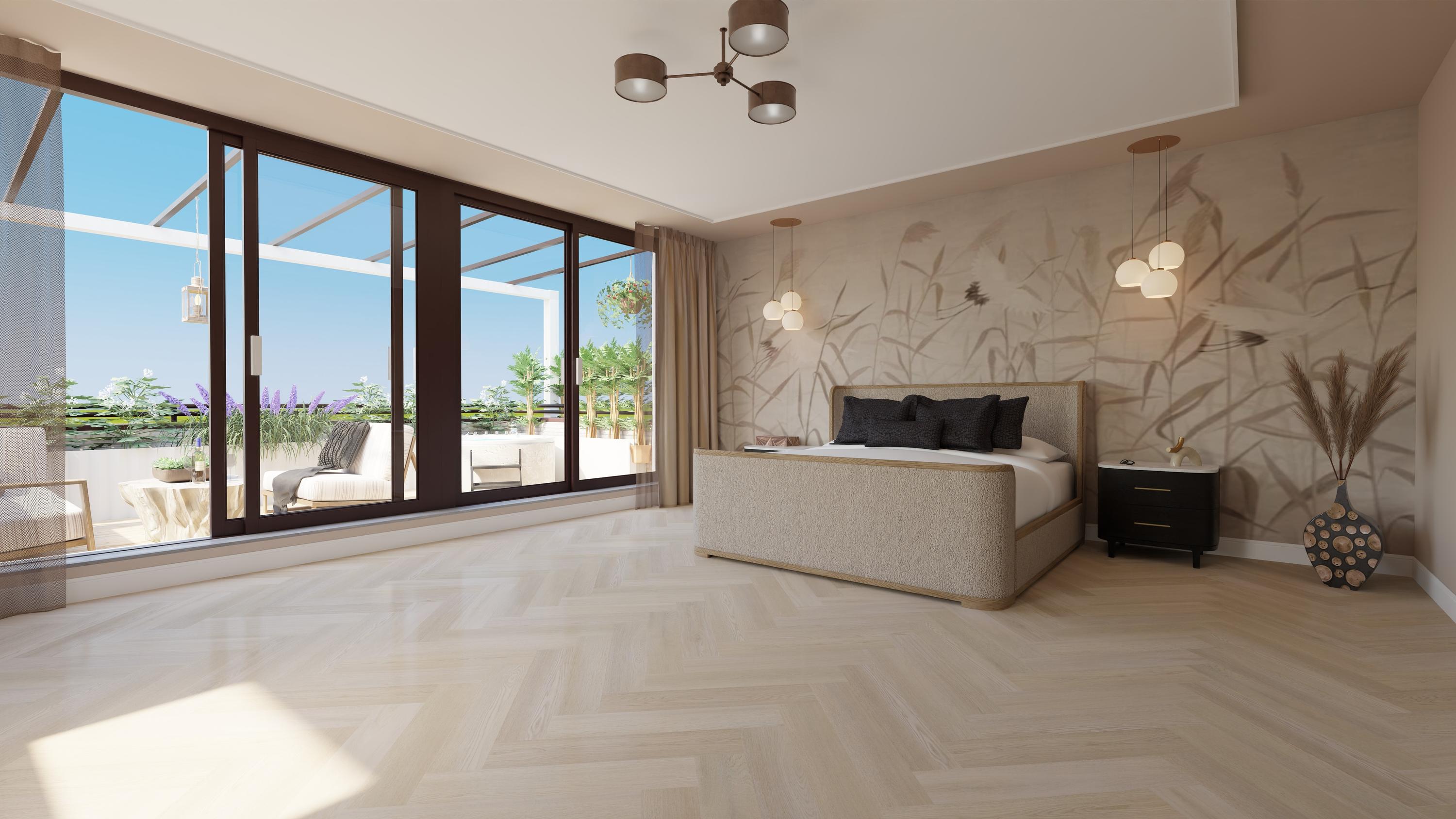 The cubist architecture provides plenty of space. The wonderfully large bedroom has access to a large 20m² roof terrace with a pergola, where you can enjoy a cup of coffee or a good book. The second spacious bedroom has its own en-suite bathroom. There is also a second bathroom, a separate toilet, and a storage cupboard.