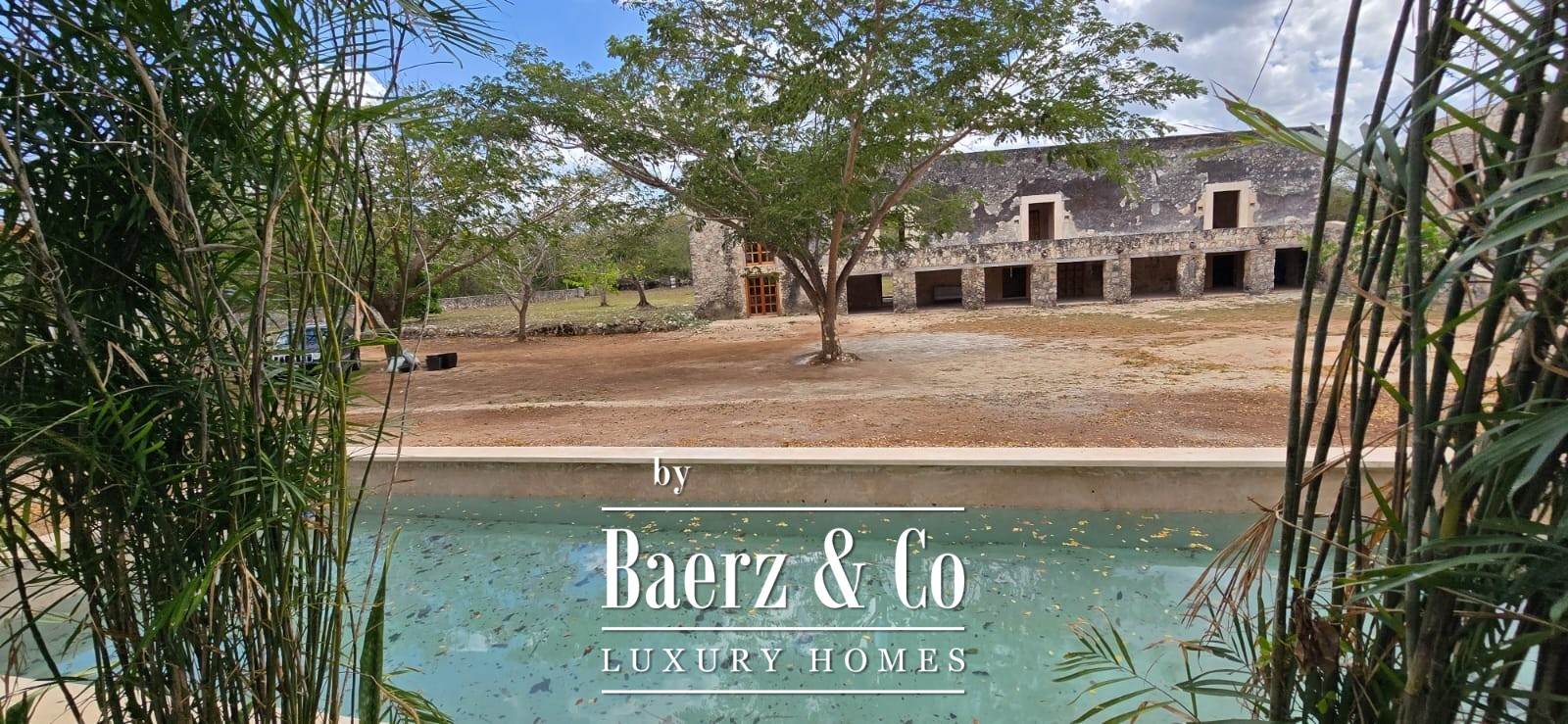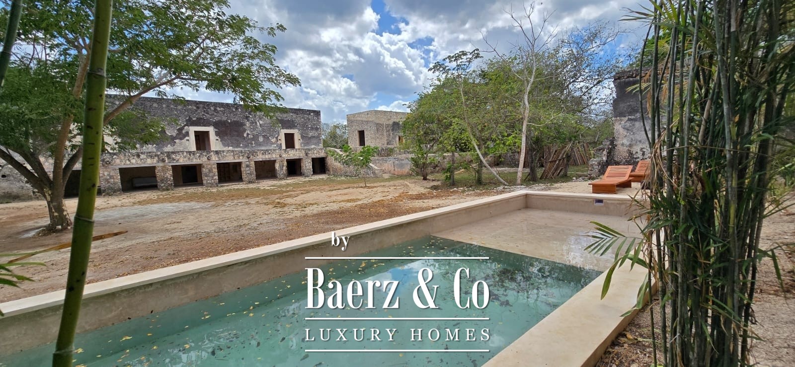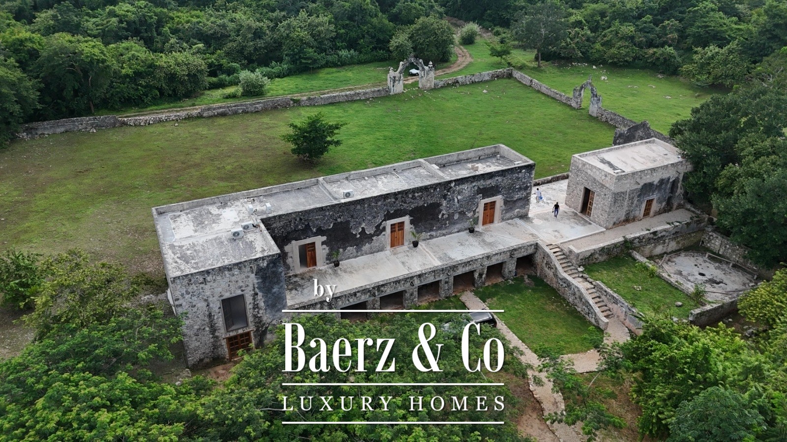A descent to the cenote reveals a cave alive with clear waters and native birdlife, accessed by hand-built zapote wood stairs. The estate retains historical features—original noria, stone corral, and structures—alongside unrestored buildings that hint at the property’s significance since at least 1770.