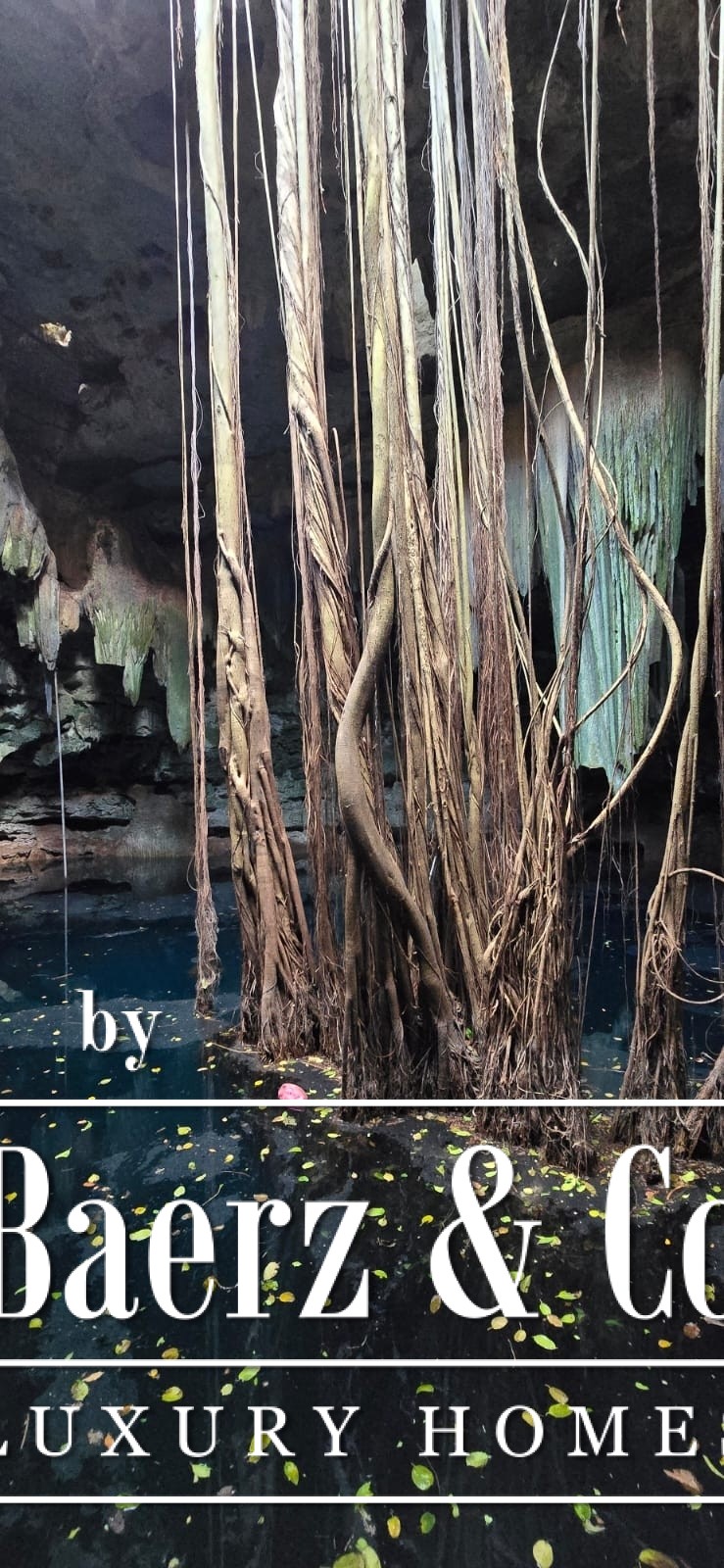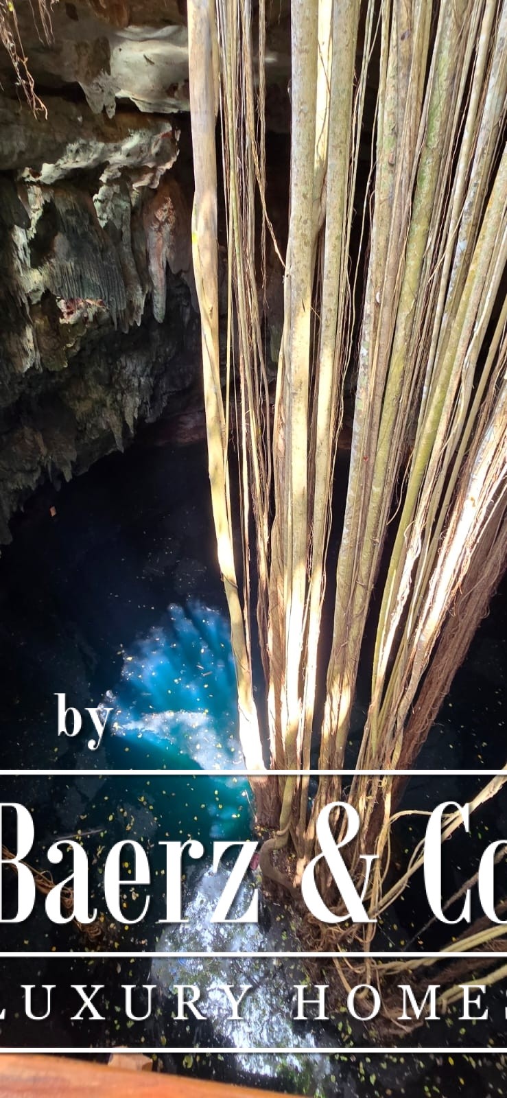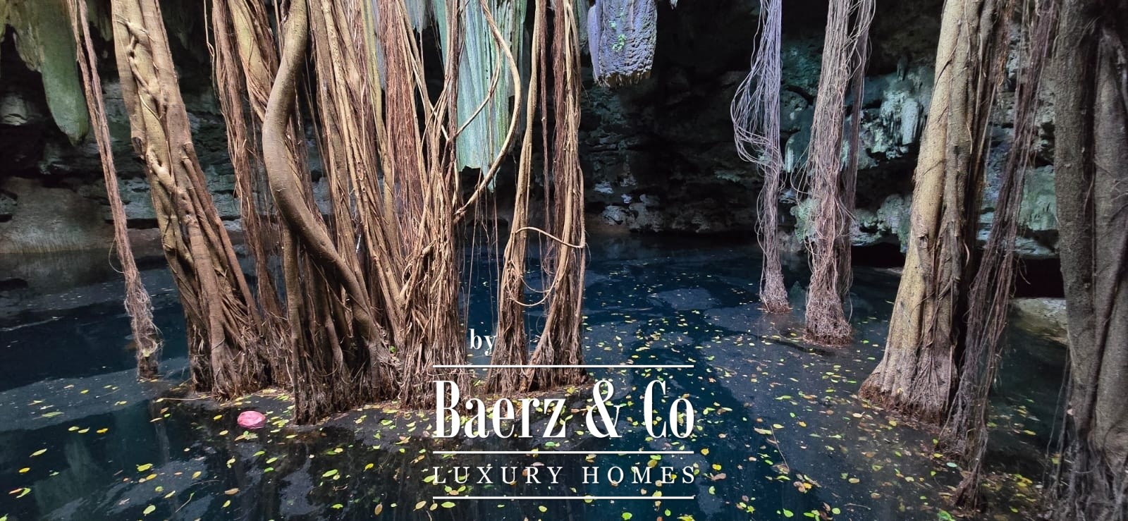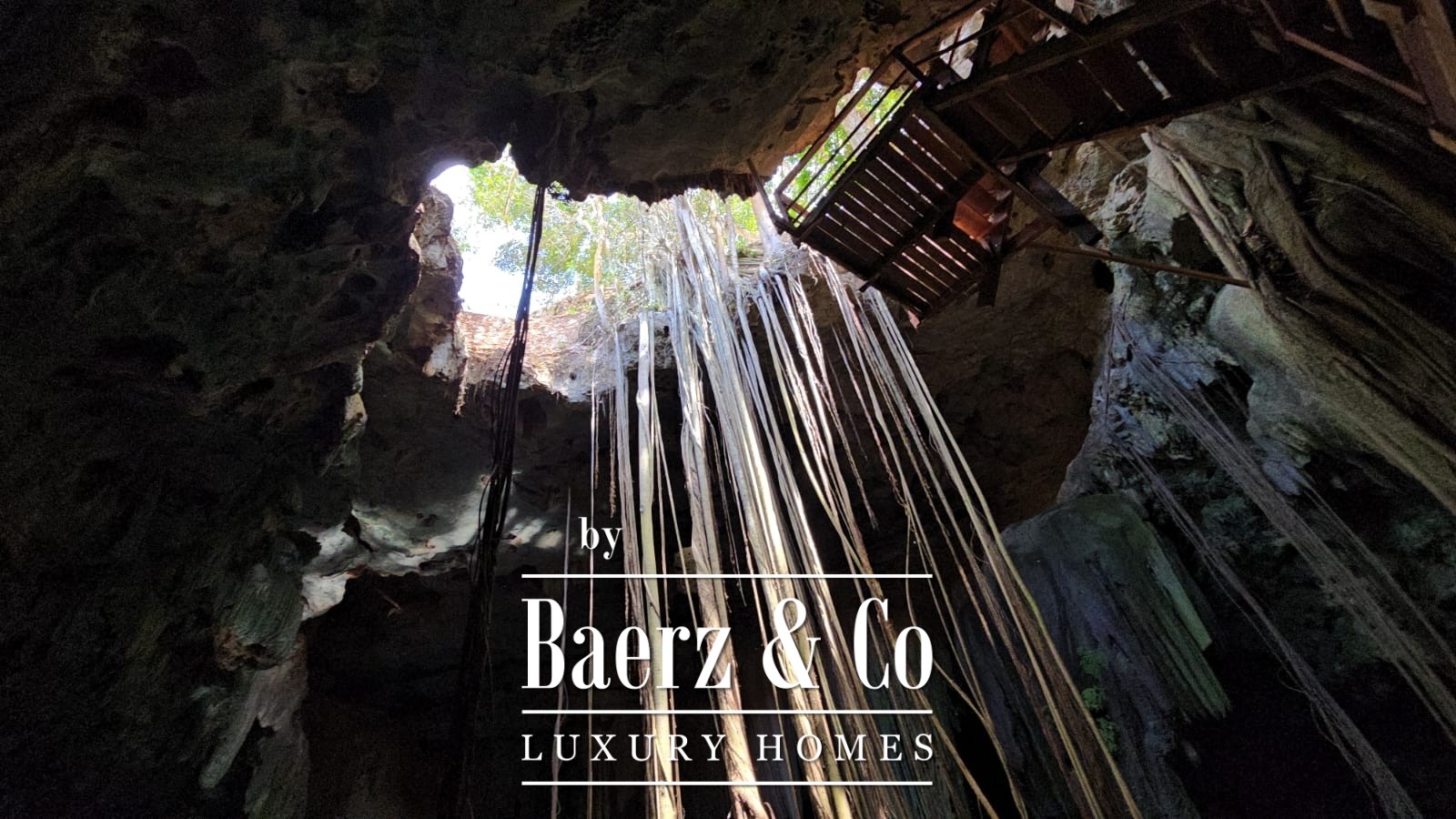 A descent to the cenote reveals a cave alive with clear waters and native birdlife, accessed by hand-built zapote wood stairs. The estate retains historical features—original noria, stone corral, and structures—alongside unrestored buildings that hint at the property’s significance since at least 1770.