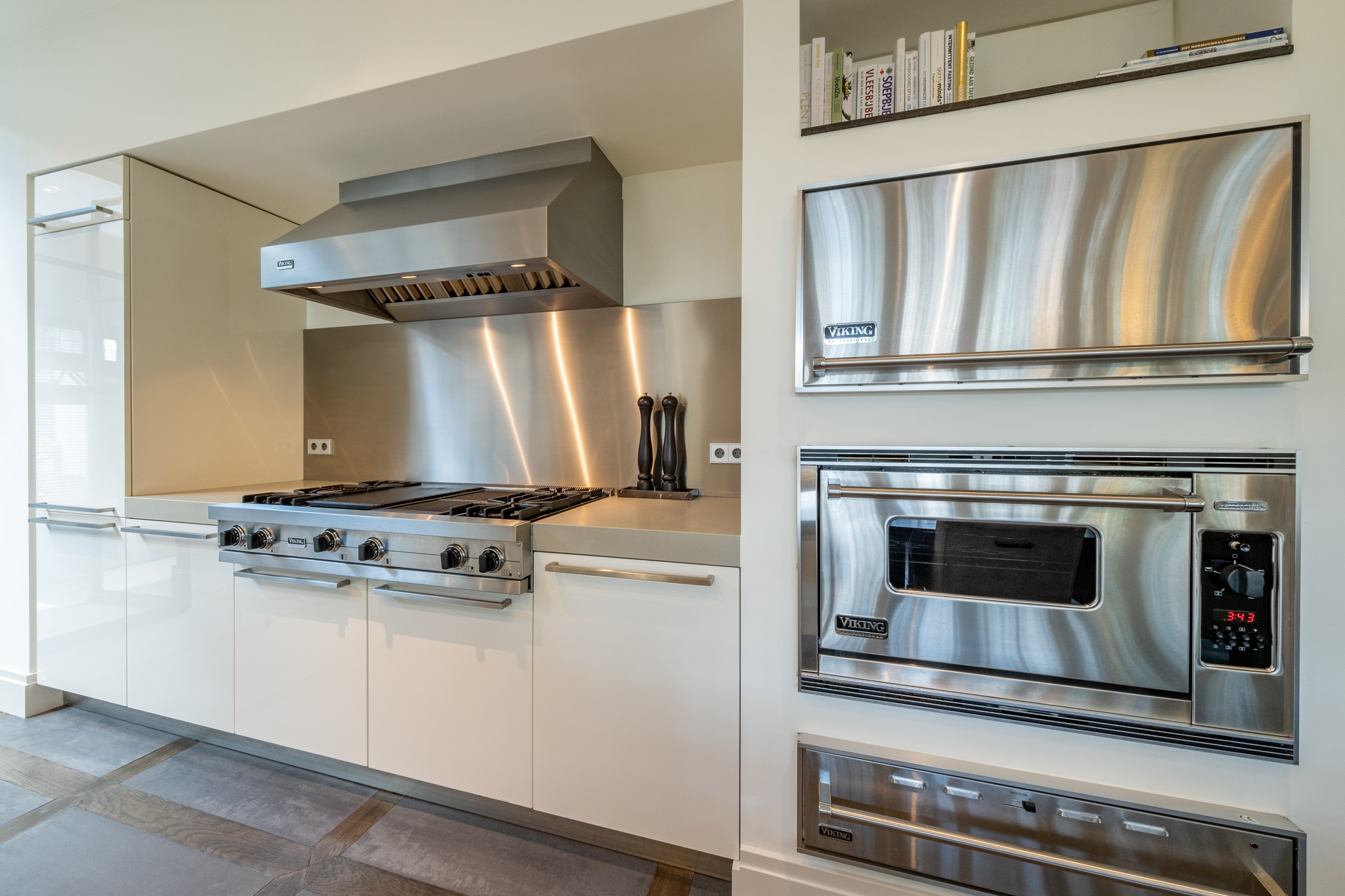 Designer Eggersman kitchen with Caesarstone countertop, integrated oak dining table, Viking appliances, Teppanyaki grill, steam oven, extractor, two dishwashers, warming drawer, fridge/freezer, and additional prep kitchen with second sink