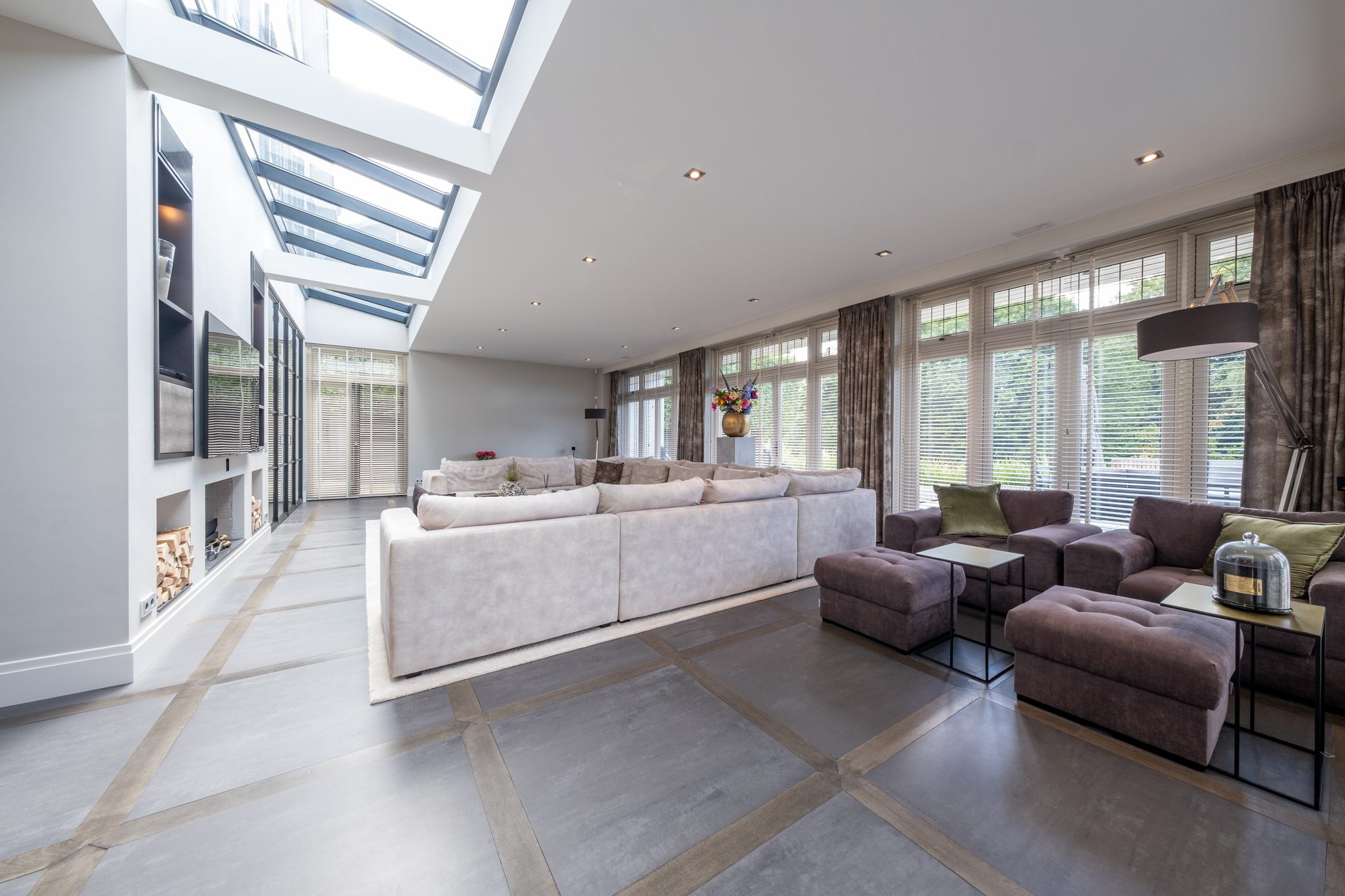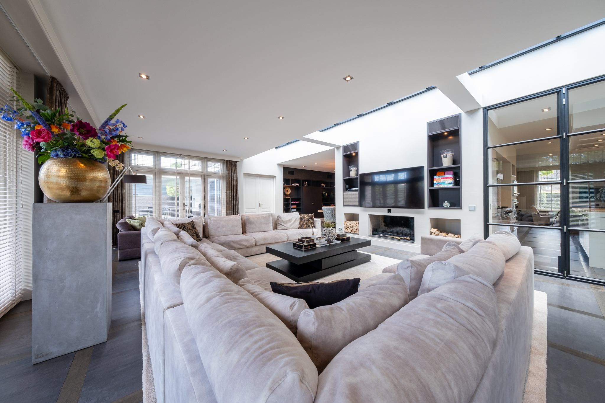From the moment you enter, the grandeur is evident: a spacious hall with a stately staircase, an inviting L-shaped living room with glass ceiling panels, and a cozy work corner. The Eggersman designer kitchen is a true showpiece, equipped with a large cooking island, Viking appliances, and a stylish gas fireplace. A floor-to-ceiling steel façade visually connects the kitchen to the living room, while still providing the luxury of a separate space. Additional features include a basement, double indoor garage, and a multifunctional wing – ideal as a guesthouse, office, or au-pair apartment.