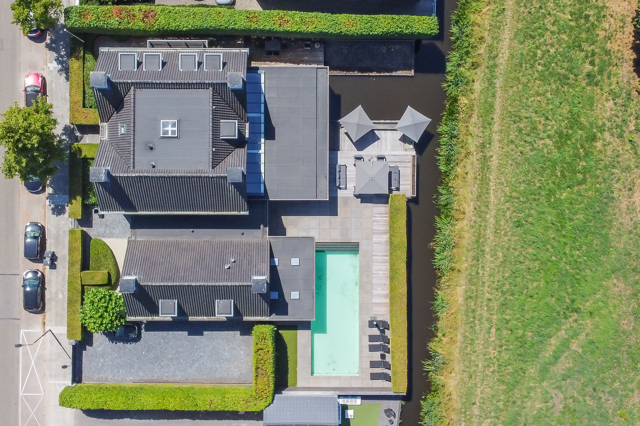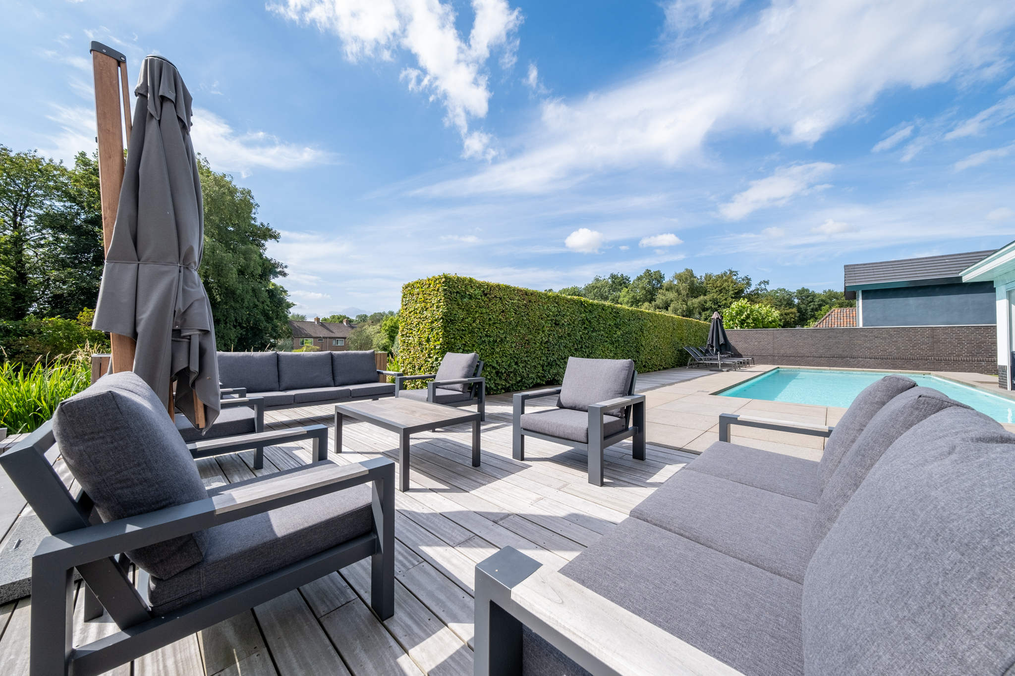The villa is surrounded by lush, enclosed gardens, ensuring maximum privacy. A spacious veranda, multiple parking spaces, a double garage, and a heated outdoor swimming pool all contribute to an exceptional outdoor lifestyle. The rear garden borders the water and overlooks a green embankment, providing uninterrupted views and full seclusion. Outdoor living here is simply effortless.