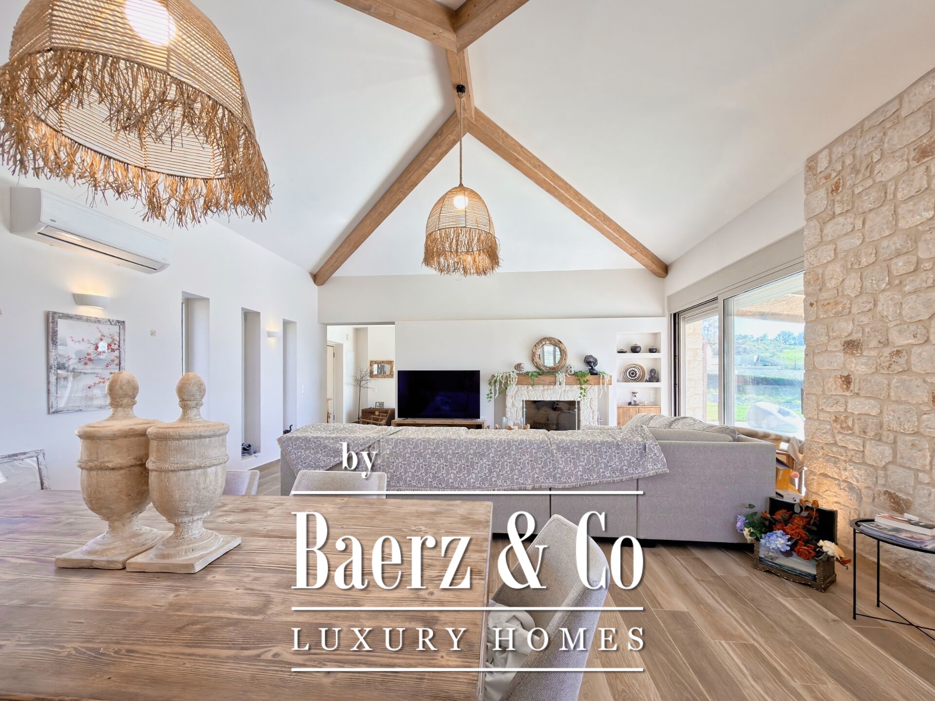 Upon entering, an expansive living room centers around a stone-built fireplace, its proportions grounded by authentic stonework that flows from interior to exterior. The open kitchen, seamlessly integrated with the living area, balances comfort with functional clarity. Three spacious master bedrooms and three refined bathrooms, complemented by an additional WC, offer privacy and ease for both daily living and hosting. Throughout, double-glazed energy-efficient windows, advanced insulation, and security features provide both tranquillity and peace of mind.