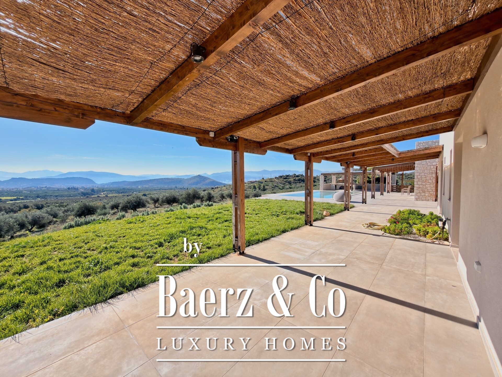 Luxury villa Nafplio presents a rare opportunity to inhabit a contemporary residence in one of Greece’s most tranquil and visually compelling locations. This 232 m² ground-floor home gracefully inhabits a 5,255 m² plot, where panoramic views over Nafplio and a western orientation invite natural light deep into each space, creating a rhythm of openness that aligns with the surrounding landscape.