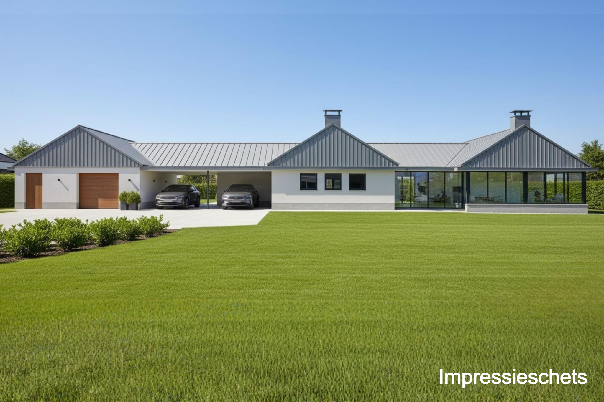 ... for there lies an impressive 1.2ha waiting for you. At the front, the plot is accessed by an electric gate, allowing you to drive straight into the garage. Surface parking is also possible, because the driveway has room for at least eight cars. There is also a charging station, so you always drive away with a full battery.