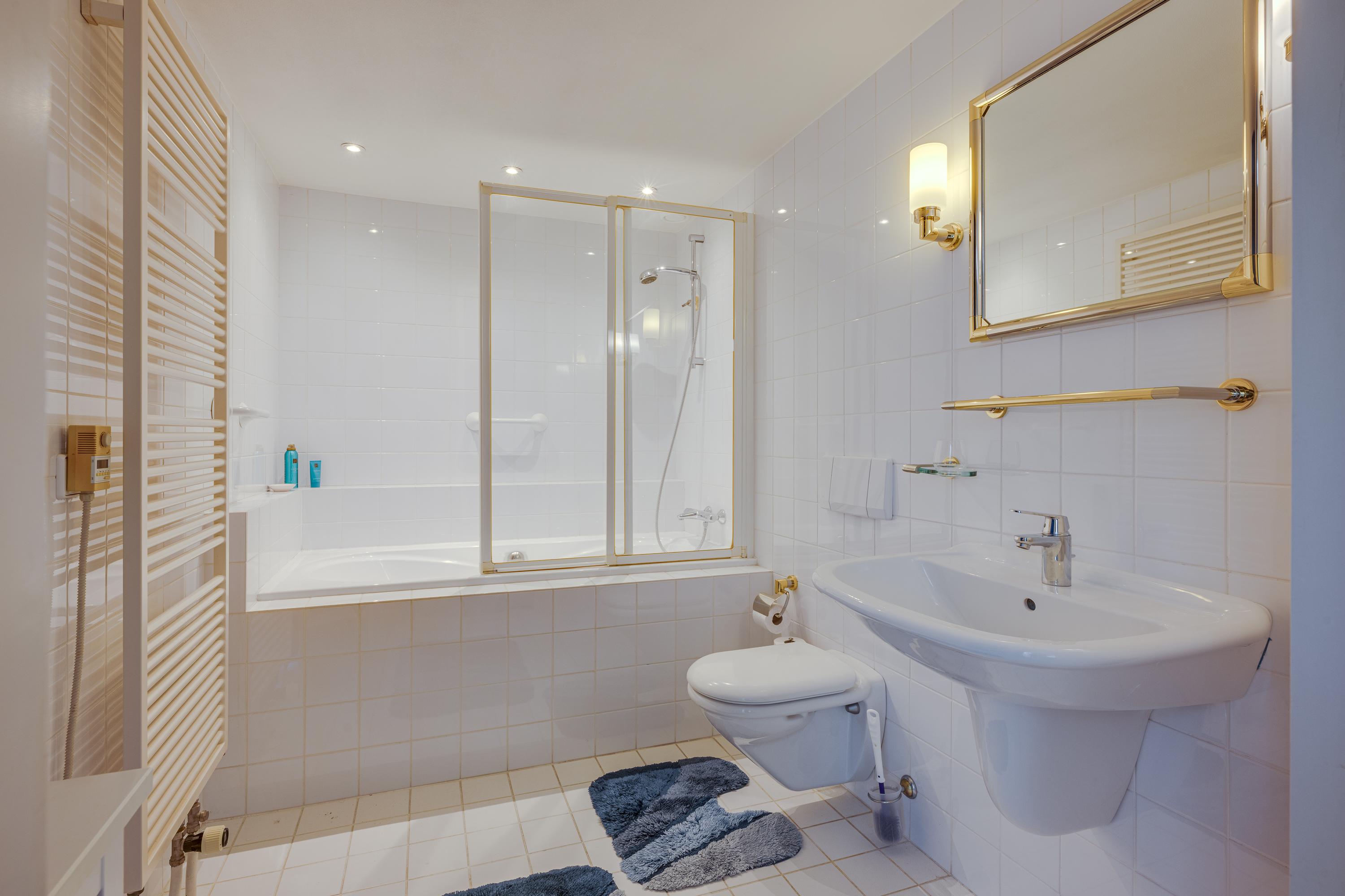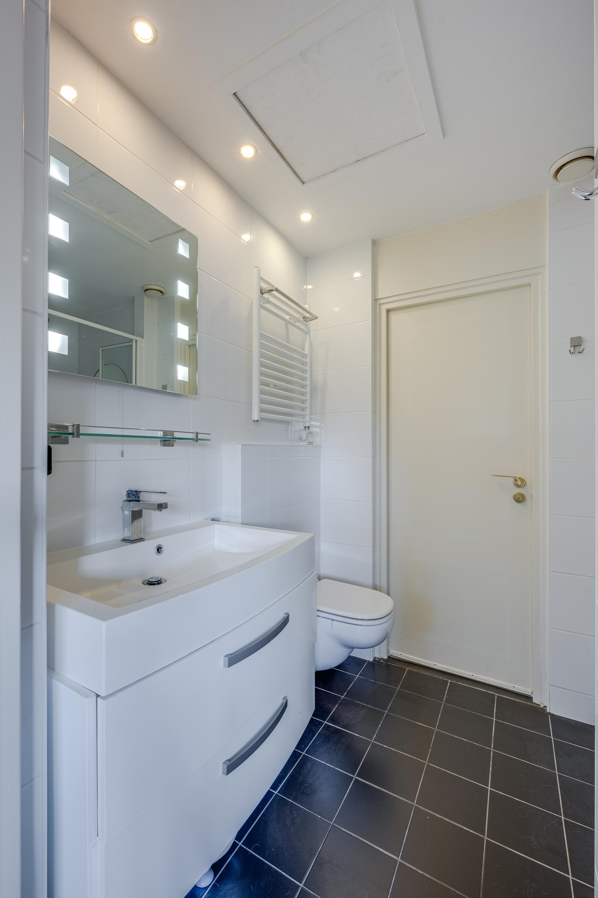 The dining room is connected to the spacious kitchen, which is equipped with Miele appliances. Next to the kitchen is the utility room, which also serves as a 'back' entrance. Next to the main entrance is a hallway with the guest toilet and an indoor storage room housing the central heating system. Finally, on the ground floor, there is a spacious bedroom with fitted wardrobes and a private en-suite bathroom with bath and washbasin.