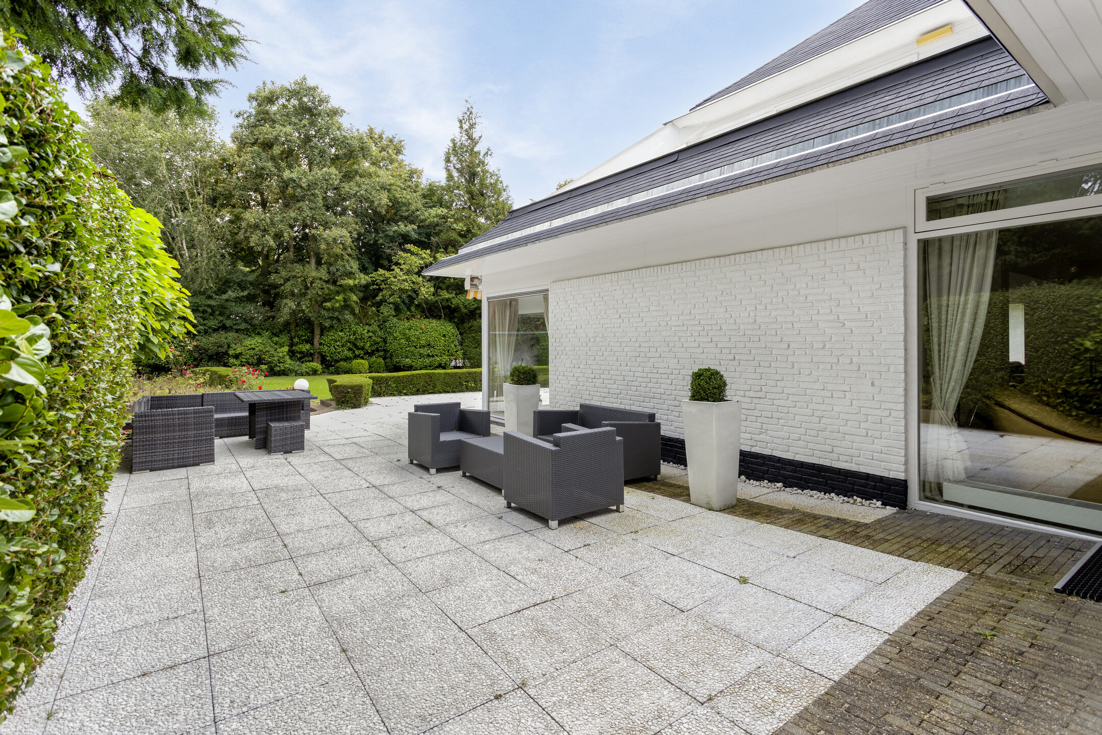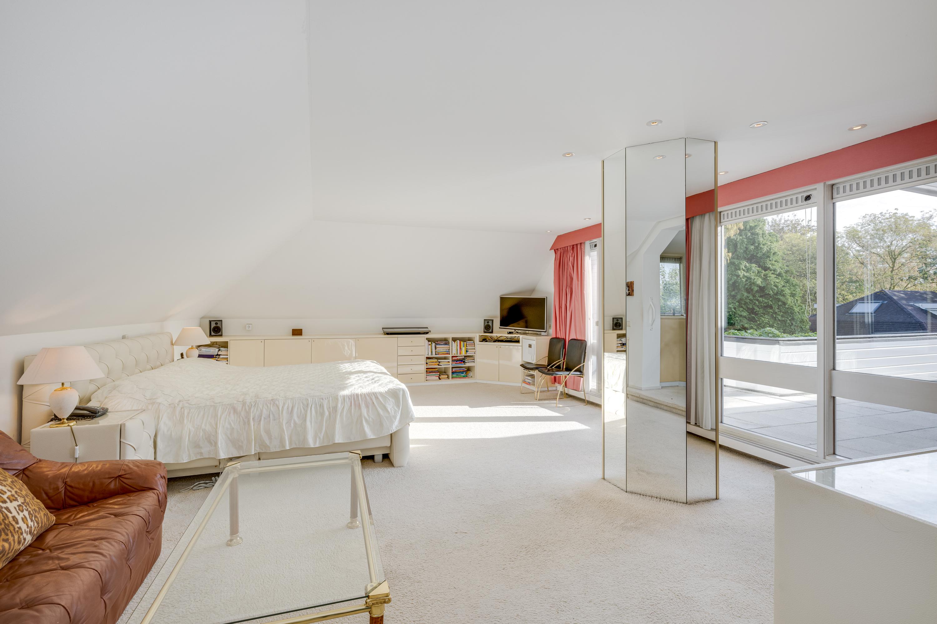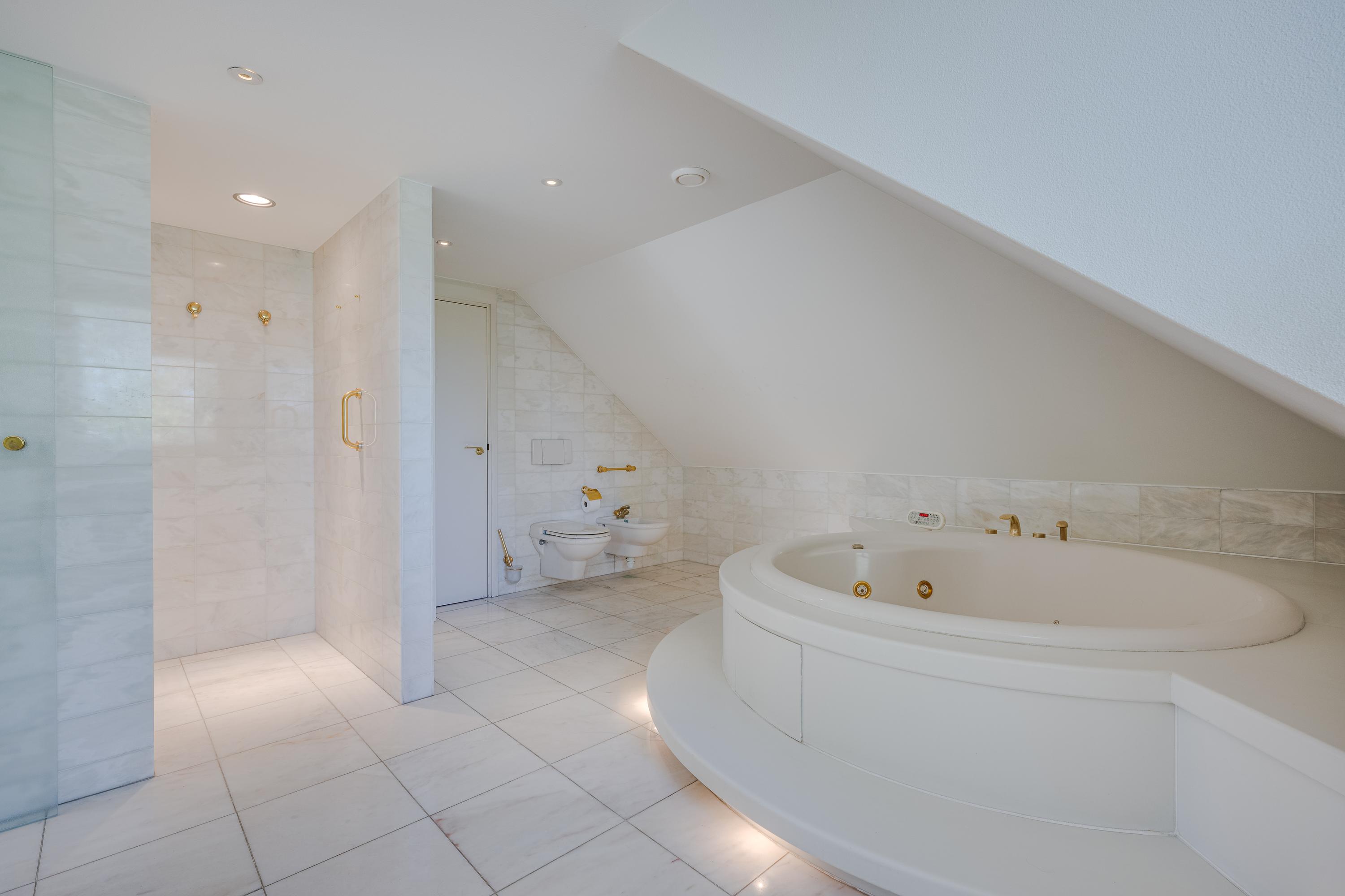 Layout: As you enter the villa, you are welcomed by a bright and spacious entrance hall with a double-height ceiling, highlighted by a grand staircase, where a luxurious high-pile carpet leads you into the living area. There is ample closet space available in the hallway. Walking straight ahead, you enter the living area consisting of a dining room, a living room, and a family room/TV room. The living room features a cosy fireplace. Together, these spaces cover more than 100 m2! Thanks to the large windows and good ceiling height, the rooms feel light and spacious. The house is surrounded by greenery, visible from the large windows in every room.