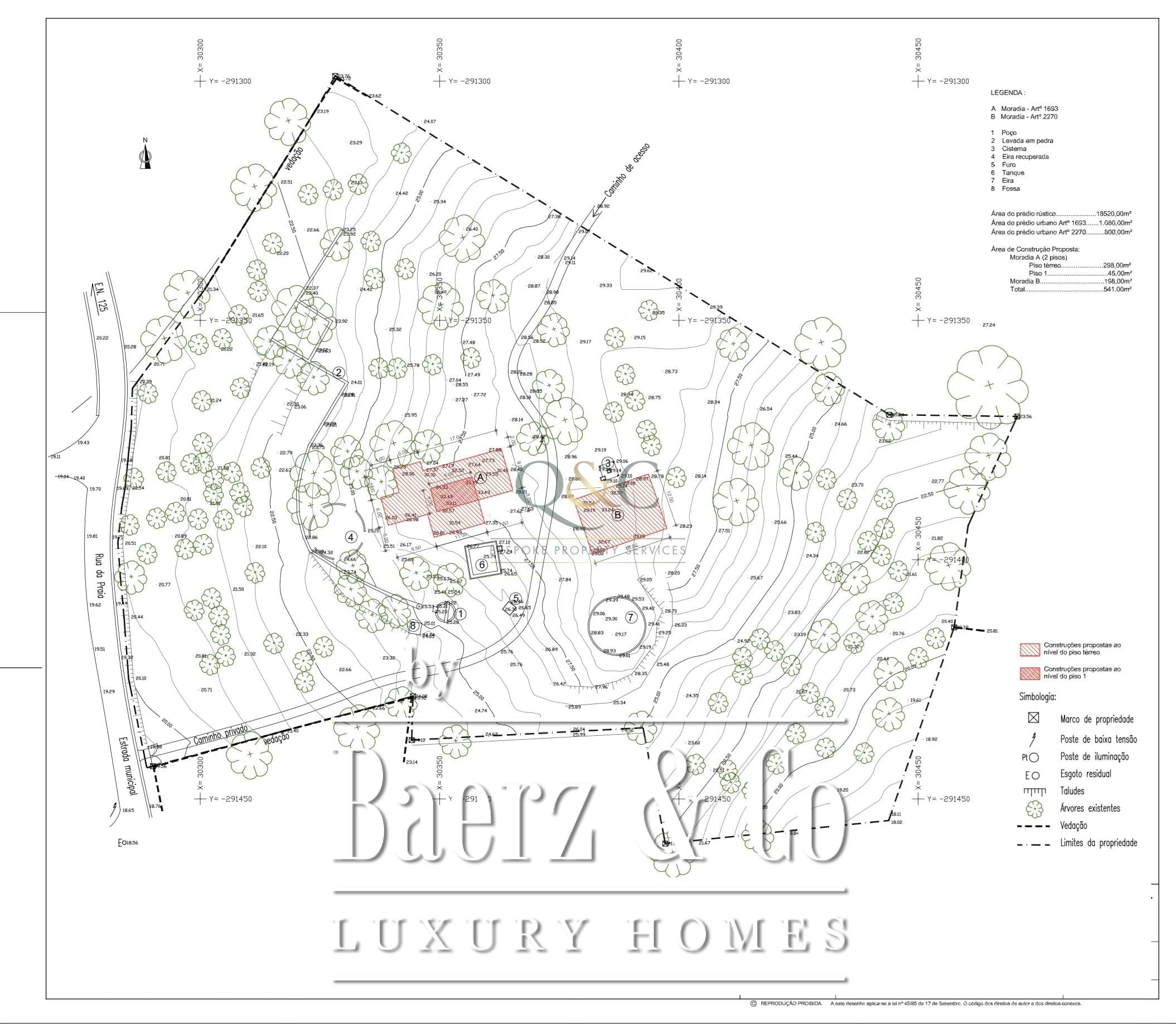 Spread over a 20,400 m² plot, the estate comprises a new 198 m² house under advanced construction, while a second 338 m² residence has its foundation laid and approved planning in place. These two villas, with a combined living area of 536 m², present rare flexibility for a primary residence, guest house, or future investment in the Algarve. Four bedrooms and three bathrooms are elegantly considered into the design, with outdoor spaces including a rooftop terrace to amplify the connection to sea and sky.