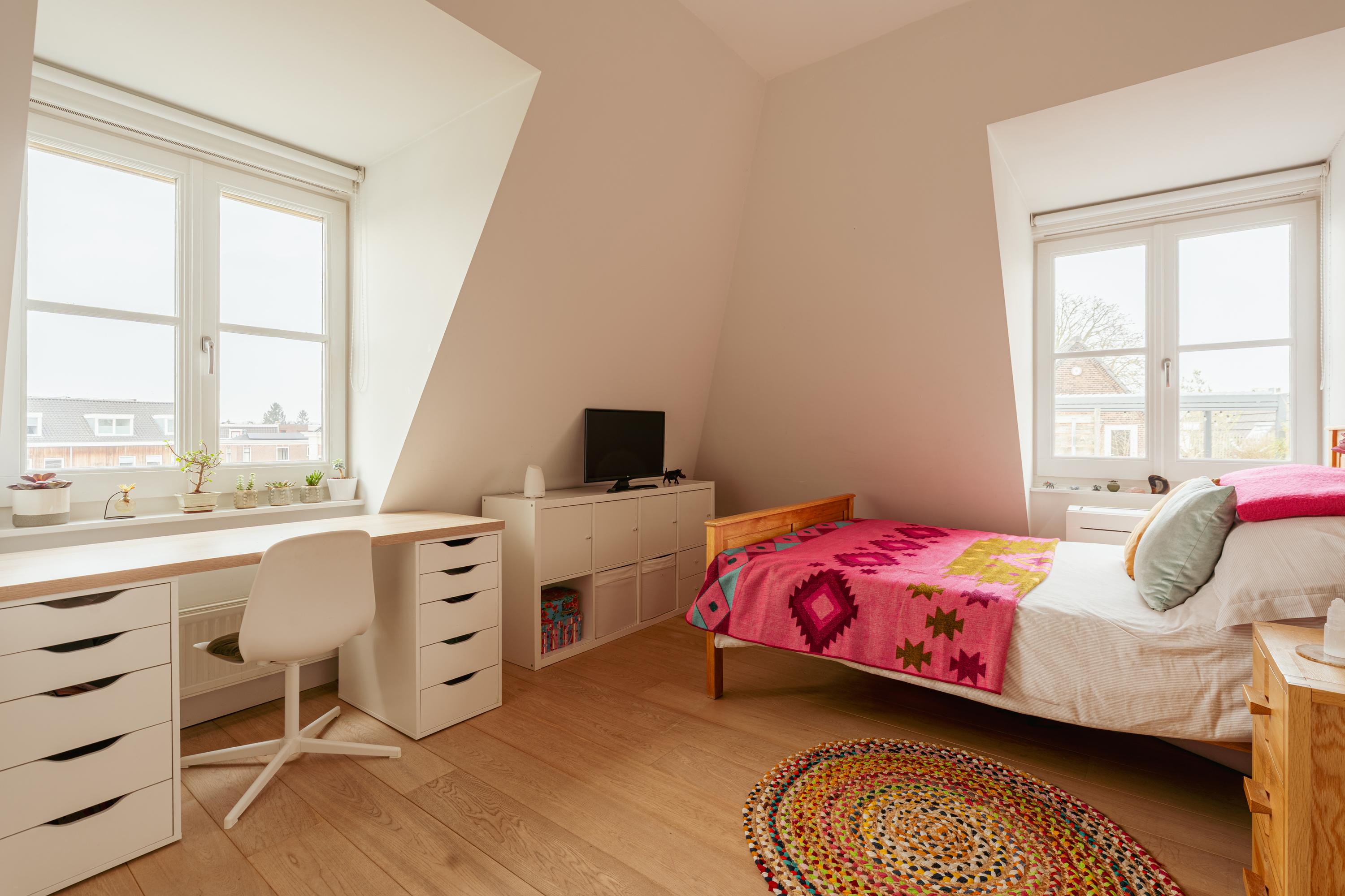 The second floor comprises two spacious bedrooms and a second bathroom, fitted with a toilet, washbasin and shower. Both bedrooms feature dormer windows on two sides, built-in wardrobes with sliding doors and air conditioning.