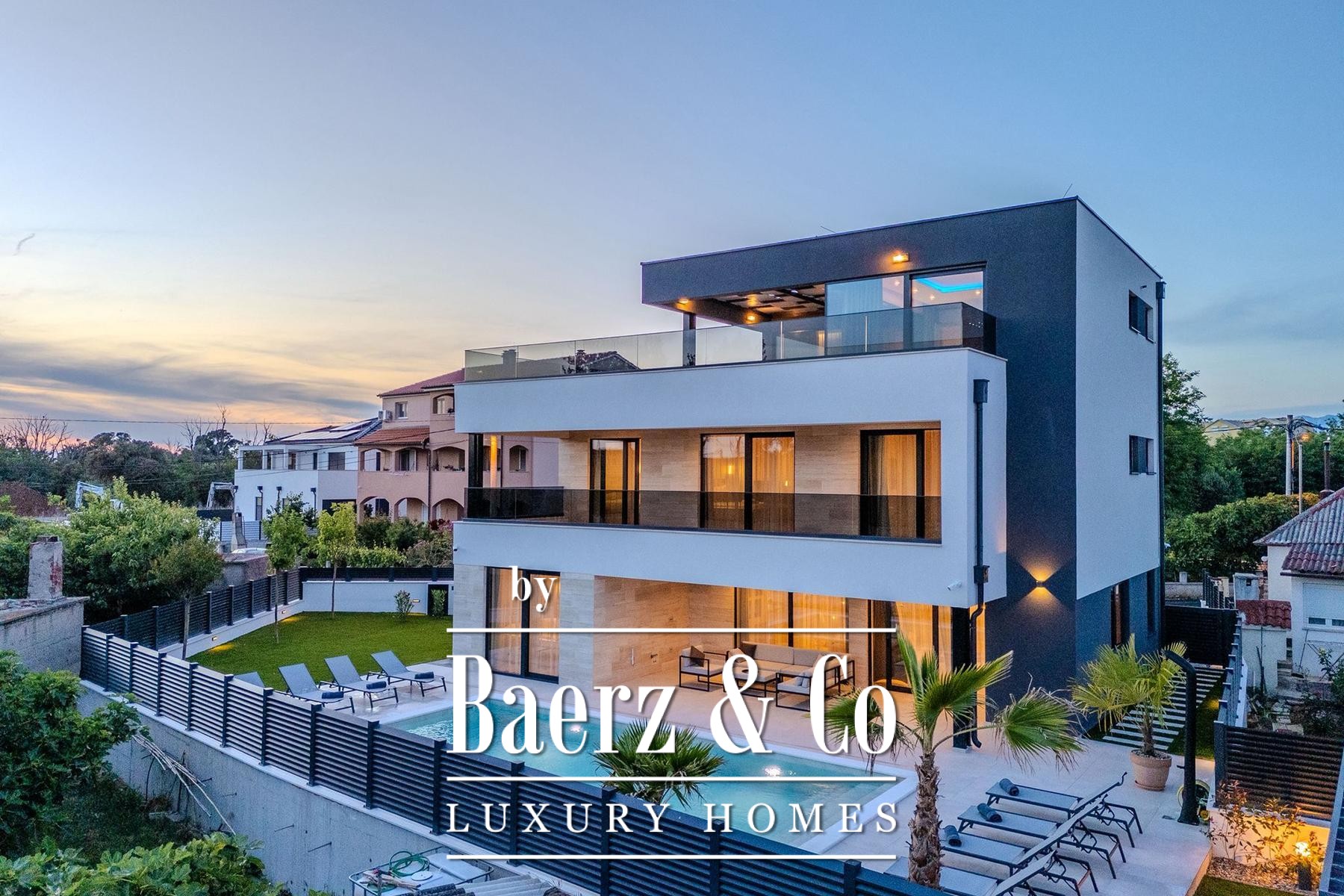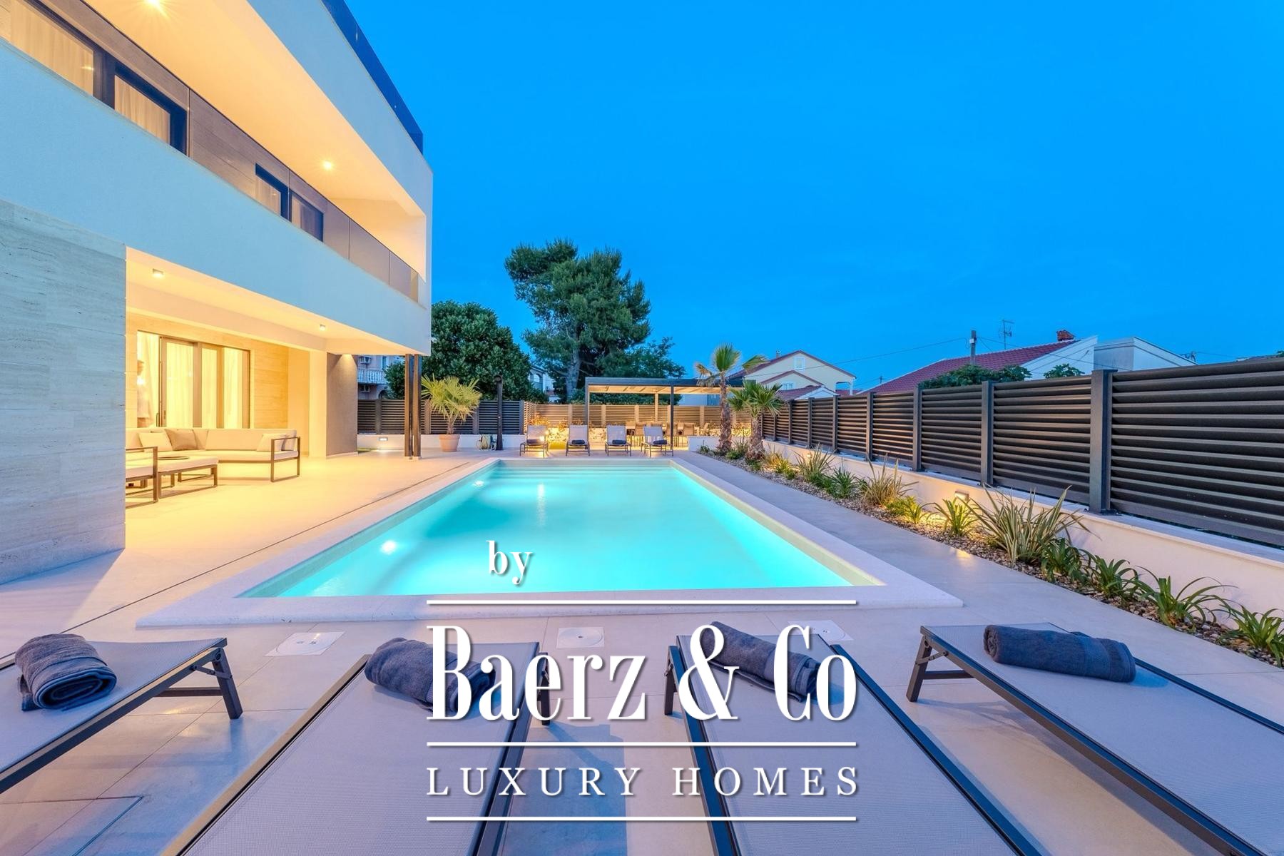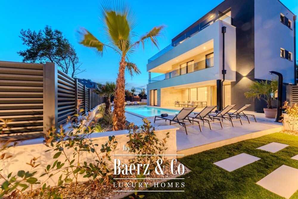 Villa Privlaka in Croatia presents a modern architectural statement in a quiet, exclusive enclave just moments from the Adriatic Sea. This villa offers 412.80 m² total floor area including terraces, set on a 591 m² plot, integrating open-plan living with a sense of seamless indoor-outdoor flow. The main living area of 52.66 m² connects to a 28.95 m² covered terrace and leads directly to the private 36 m² swimming pool, creating a social core ideal for relaxed gatherings or tranquil retreat. Four bedrooms all feature private en-suite bathrooms, with thoughtful allocation across the first and ground floors for both privacy and comfort. The top level is dedicated to a versatile wellness area of 23.60 m² with two expansive terraces designed for quiet contemplation beneath the Mediterranean sky.
