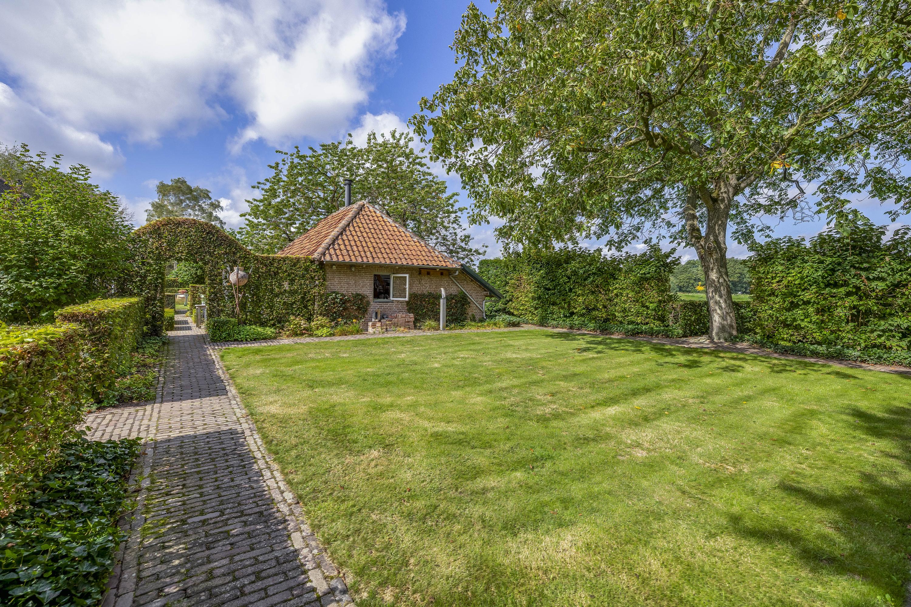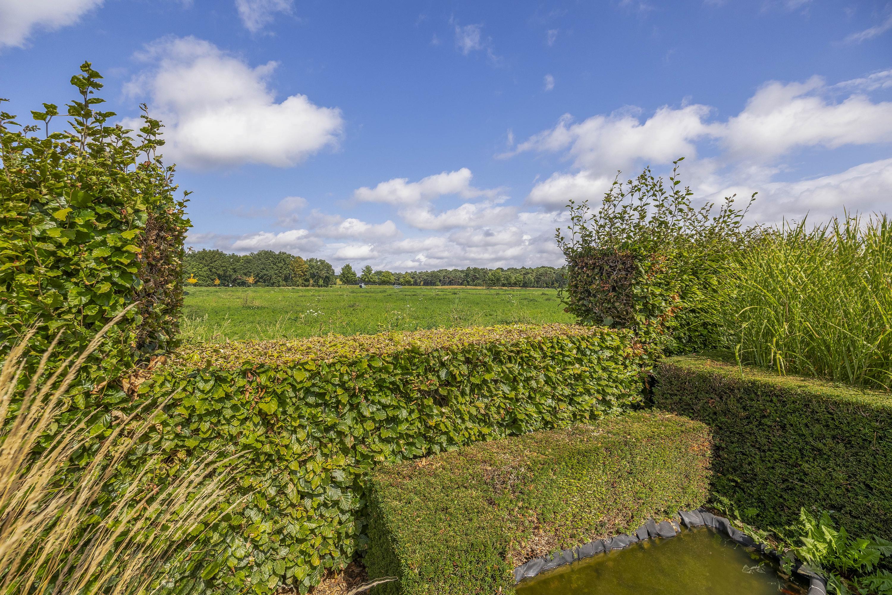 Behind the house and on the sides is a beautifully landscaped garden. On the left side is a nice, spacious area with a lawn, plant borders, old baked clinker paving, and various beech hedges. At the rear, you can enjoy a beautiful view, a large pond (with biological filter), a spacious lawn, plant borders, and mature vegetation. The garden is well laid out and well maintained. There is a double driveway on the right side of the property. The garden even offers the possibility of keeping small animals. There is also a section of the garden with a “lovers' lane.” To the left of the house is a landscaped jeu-de-boules court.
