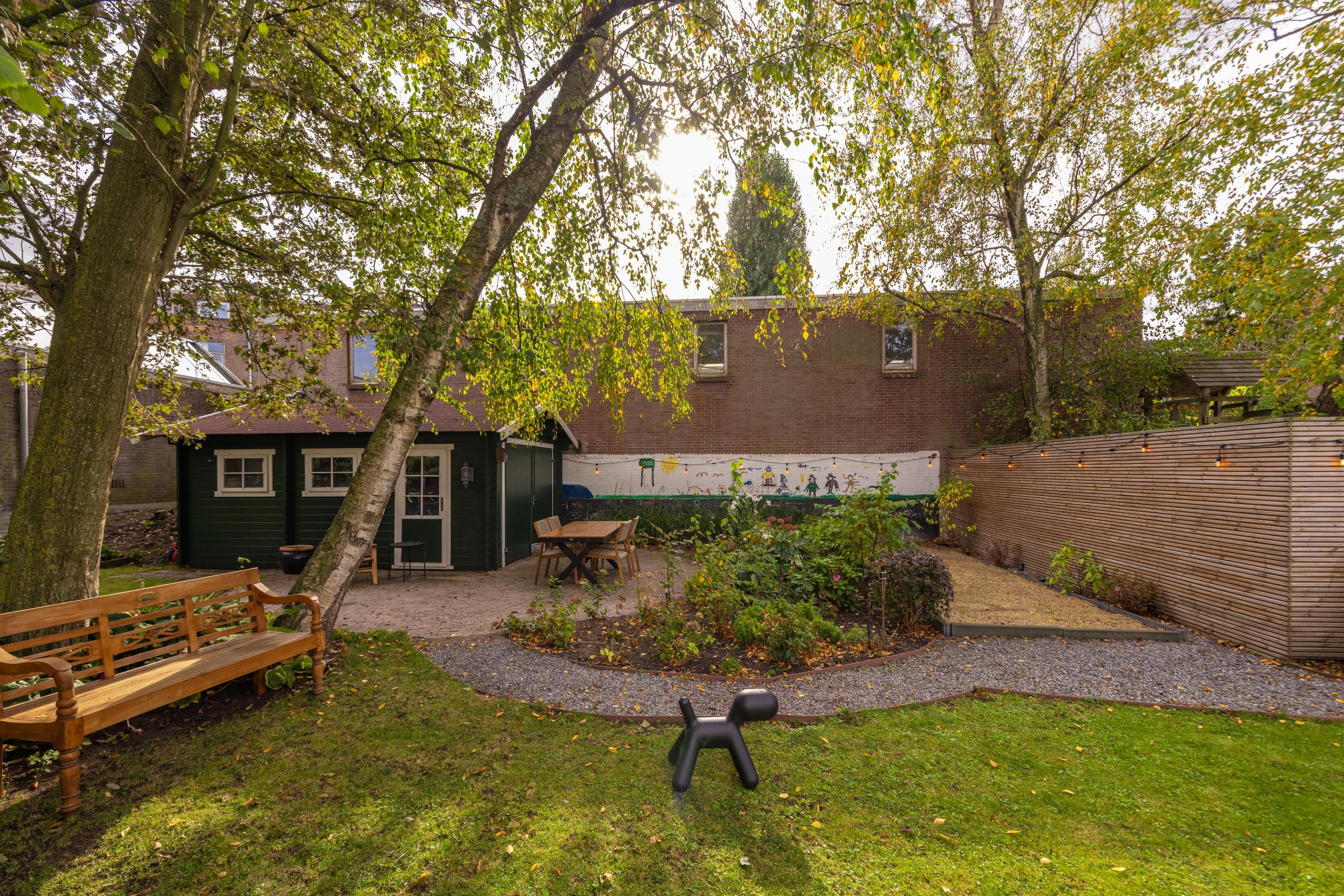 The rear garden is truly a surprise: so generous it feels like a private park, filled with sunlight, greenery, and peace. A perfect place for children to play, to entertain guests, or simply to enjoy the outdoors long into the evening. At the back of the garden stands an impressive storage building of approximately 18 m², ideal for garden tools, hobbies, or additional storage.