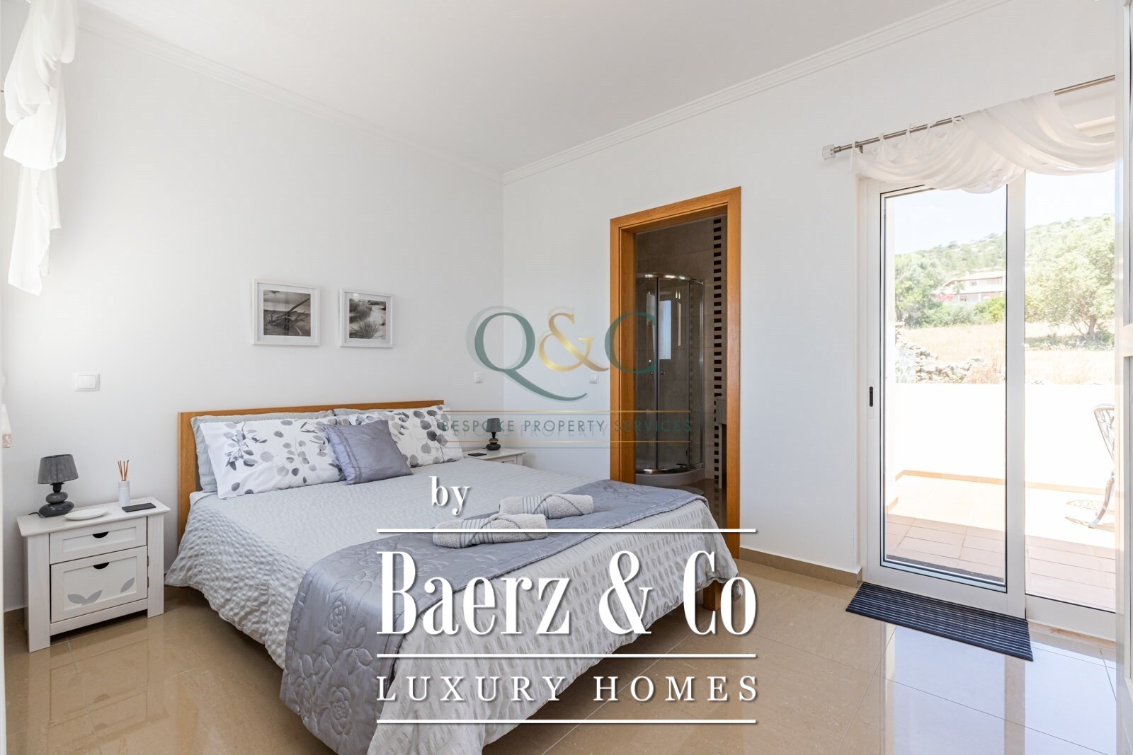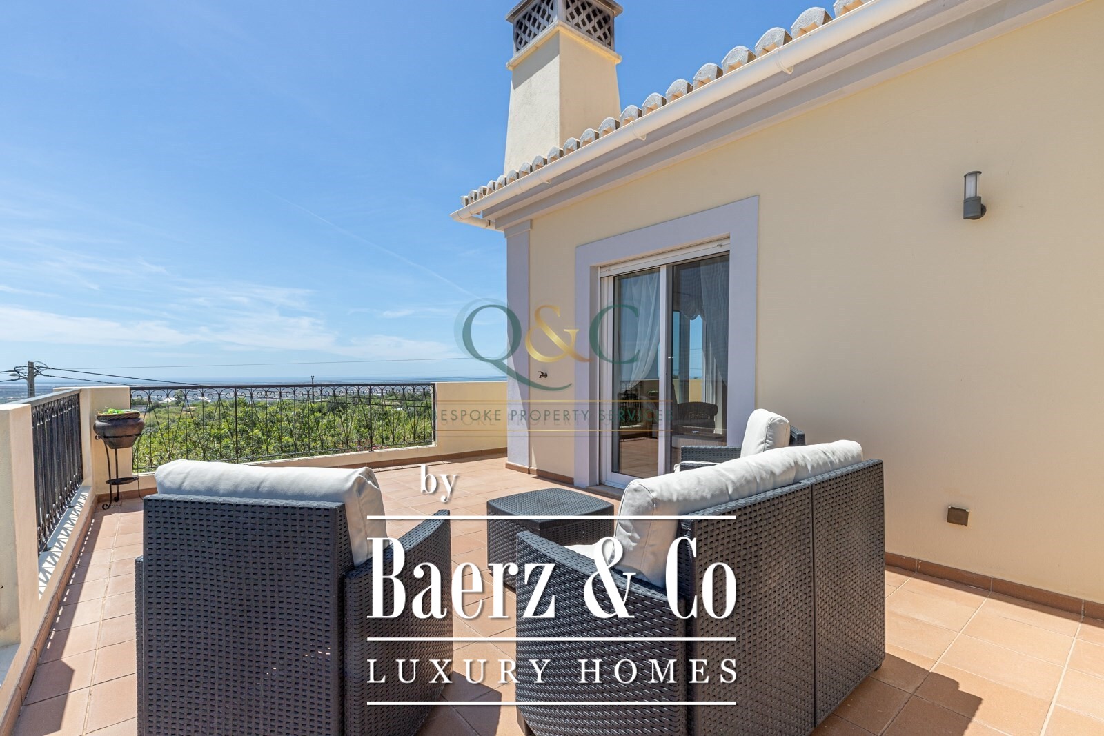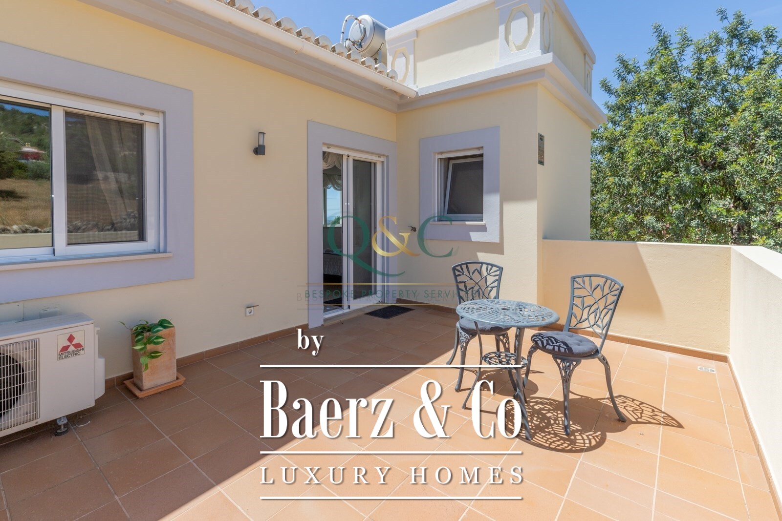 The main floor features a fully equipped kitchen, guest toilet, and a guest bedroom. Upstairs, the master suite and an additional guest bedroom each offer en-suite bathrooms and private terraces, extending the cadence of indoor-outdoor living and capturing vistas over Santa Bárbara de Nexe to the distant sea.