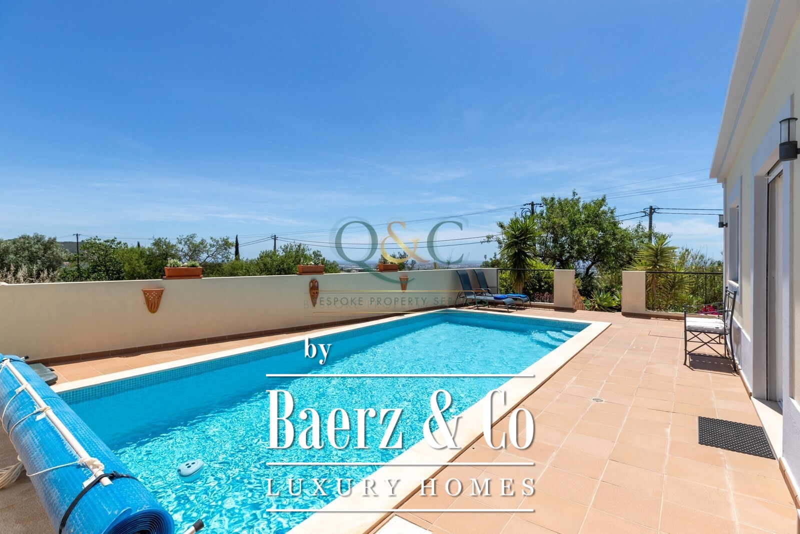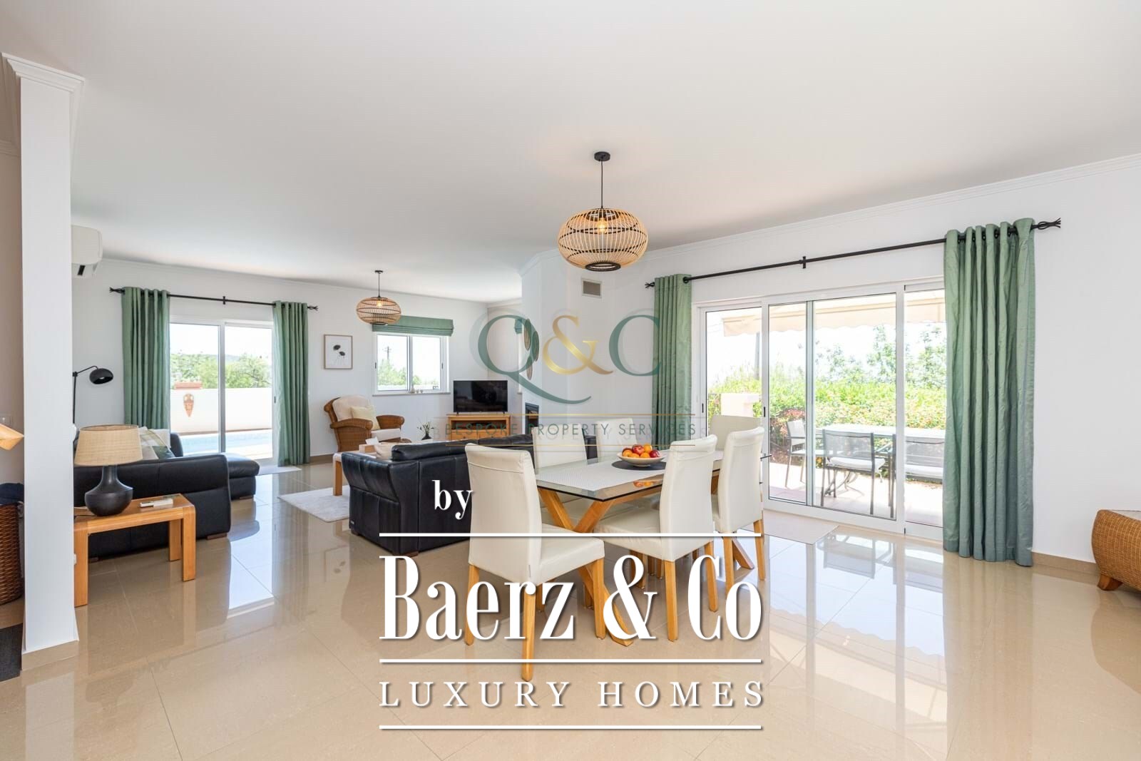 This villa Santa Bárbara de Nexe offers considered living across 174 m², opening with an integral garage and a terrace enveloping the private pool. The entrance flows into an open-plan living and dining space, anchored by a wood burner. Subtle transitions connect indoors with shaded and open terraces, drawing in light and framing both sea and countryside views.