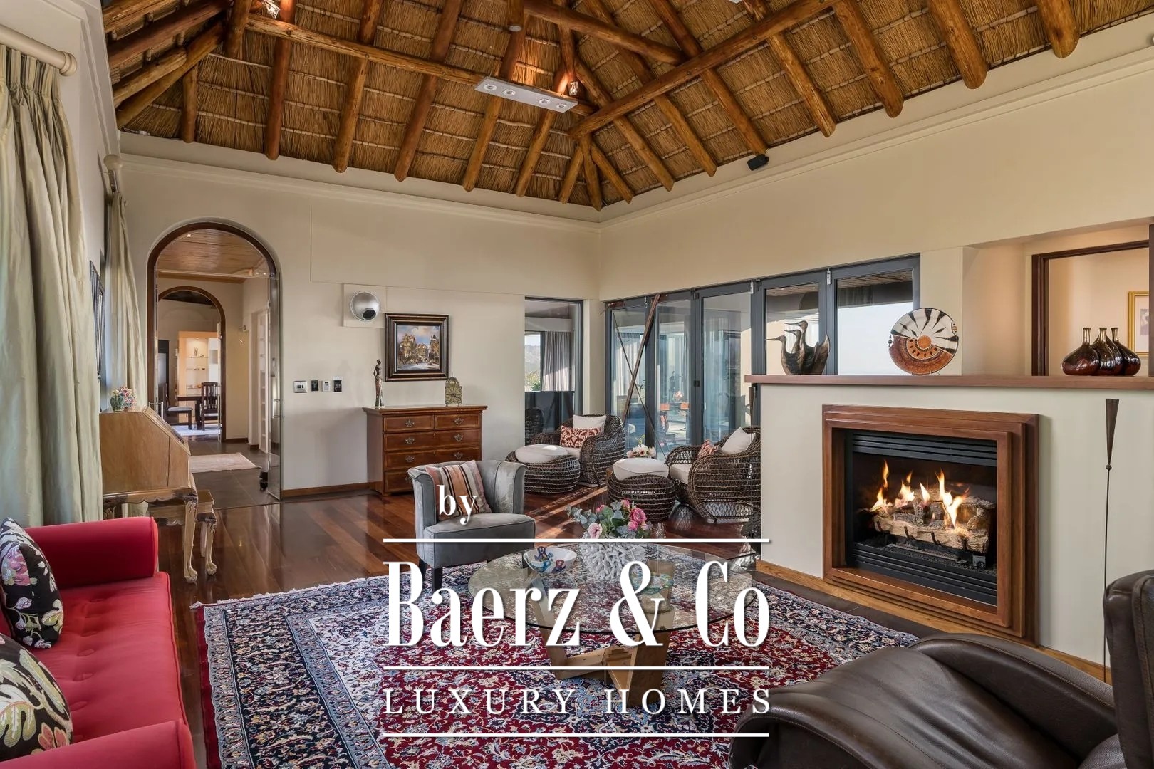In 2006 the manor house and outbuilding were traditionally built with natural materials in the unique South African rondavel style. The structure consists of cavity brickwork walls with plastering, concrete floors, and an open wooden roof construction, nostalgically thatched with reed. The property is fitted with insulated glass in low-maintenance aluminium frames with sliding doors.