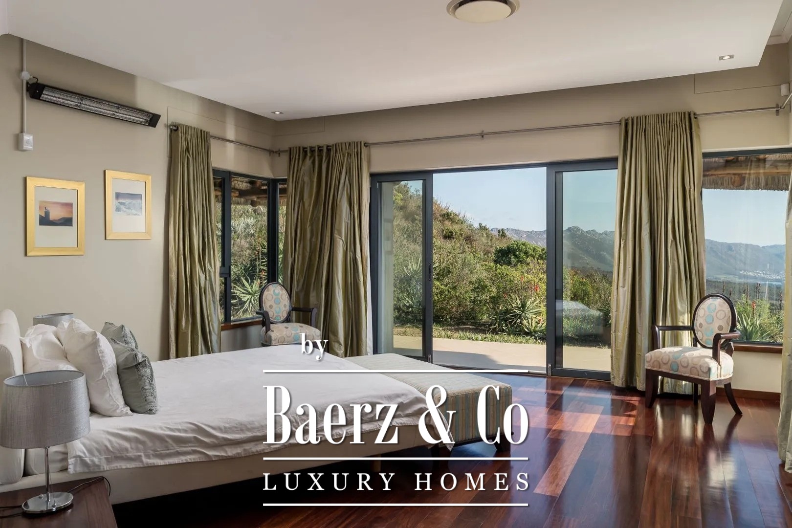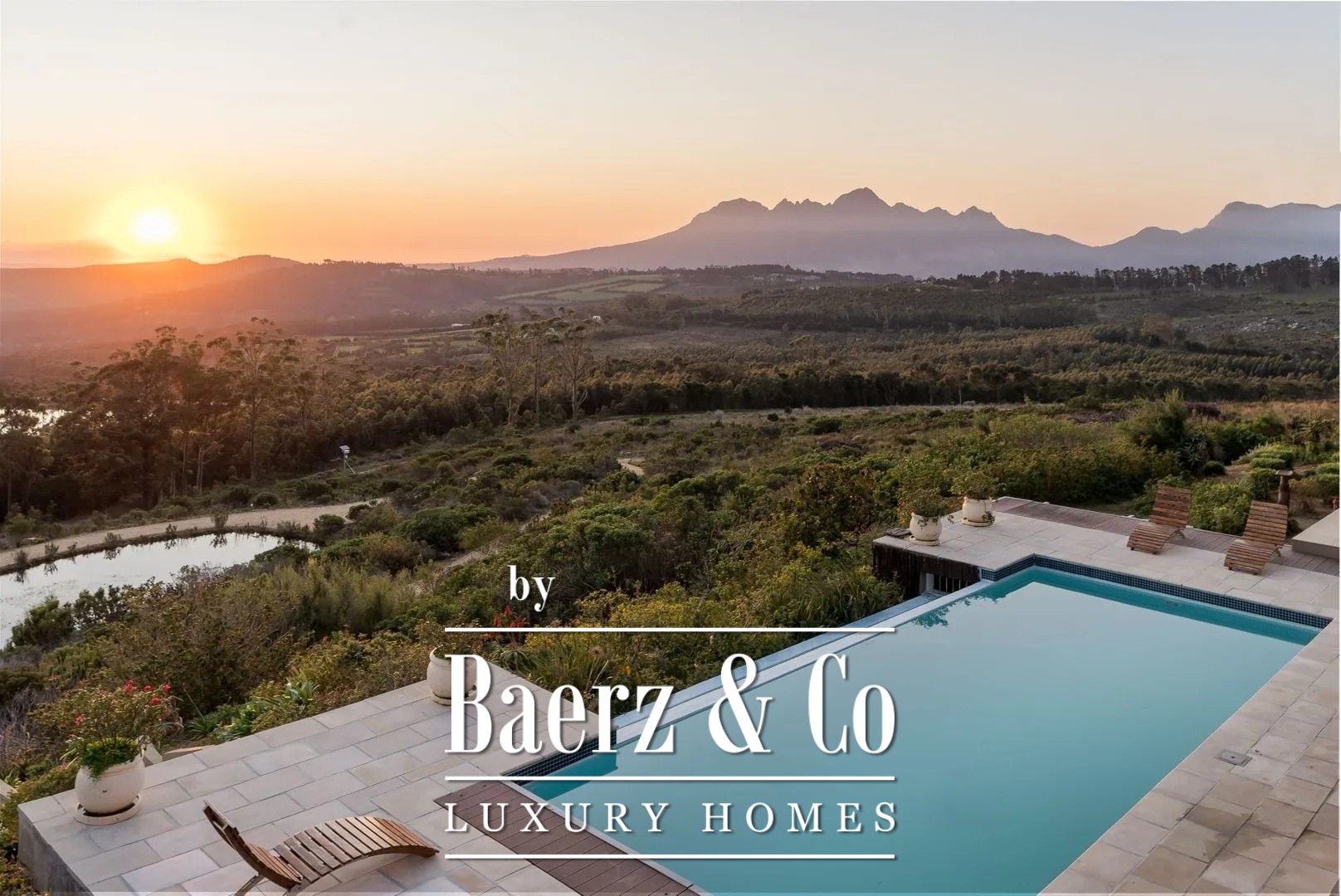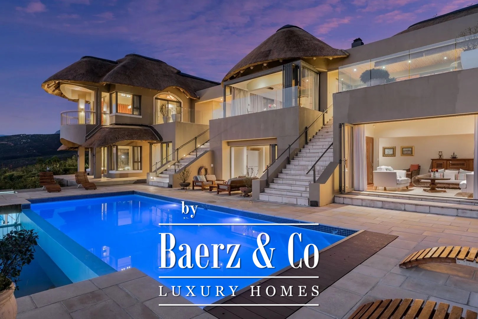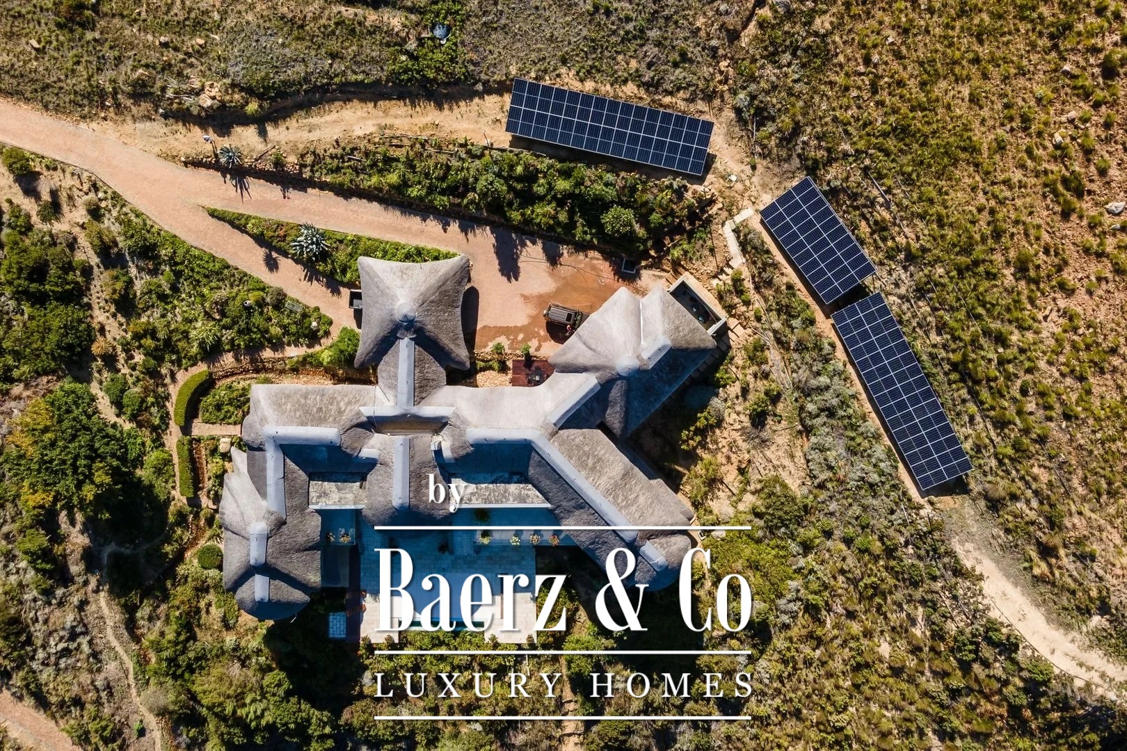 The paved and illuminated driveway on the estate is lined with indigenous proteas. It meanders through the rolling fynbos hills, past the gatehouse, to your rustic home that blends beautifully into the landscape. Tastefully landscaped gardens with small water streams surround the house and merge naturally into the surrounding terrain. Various terraces offer phenomenal views and spectacular skies. The house is designed so that it is seamlessly integrated into the surrounding hillside landscape. The manor house consists of two living levels, each of which—thanks to its position on and against the hill—offers direct access to ground level. Adjacent estates are located at a considerable distance, ensuring optimal privacy.