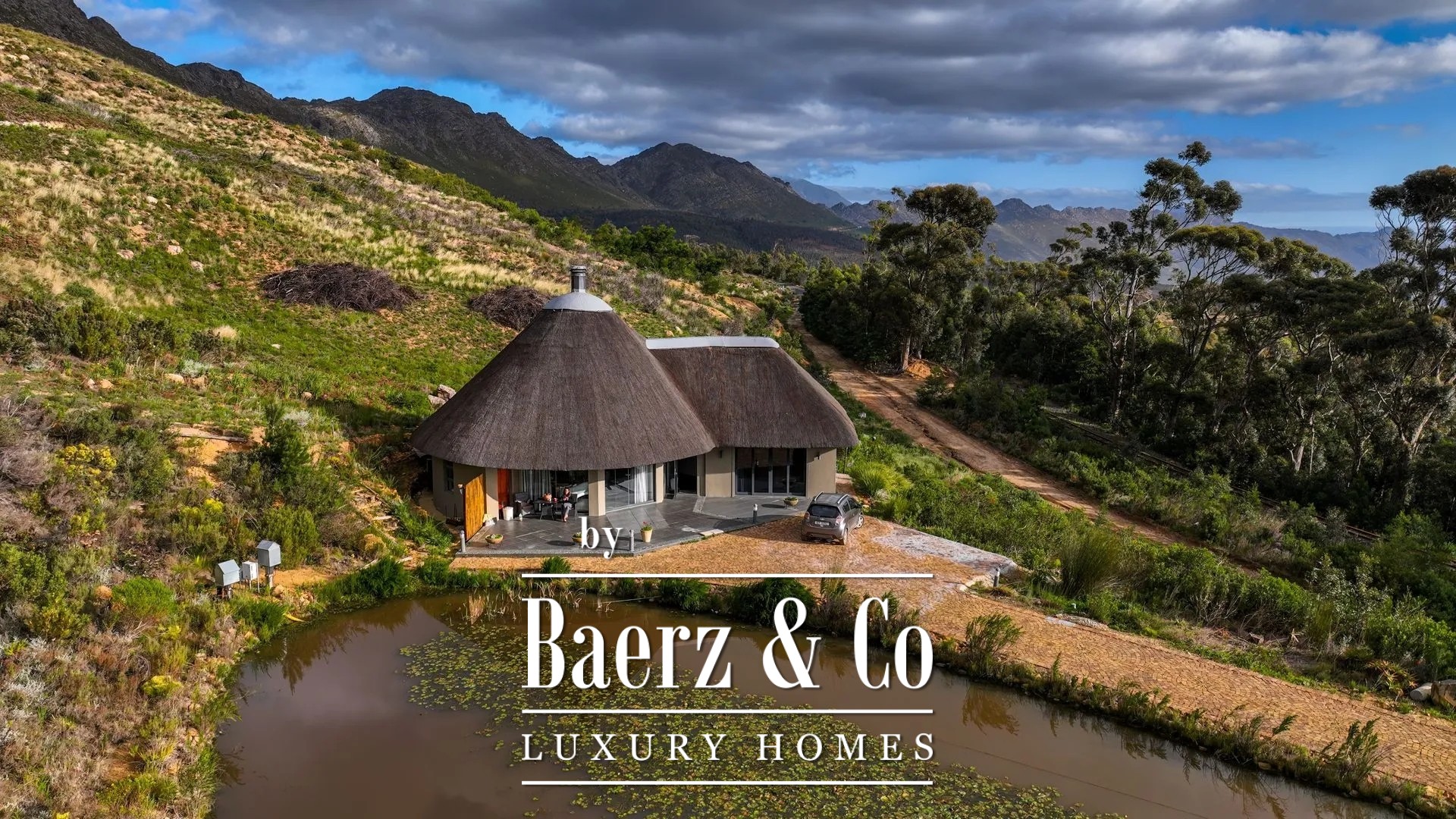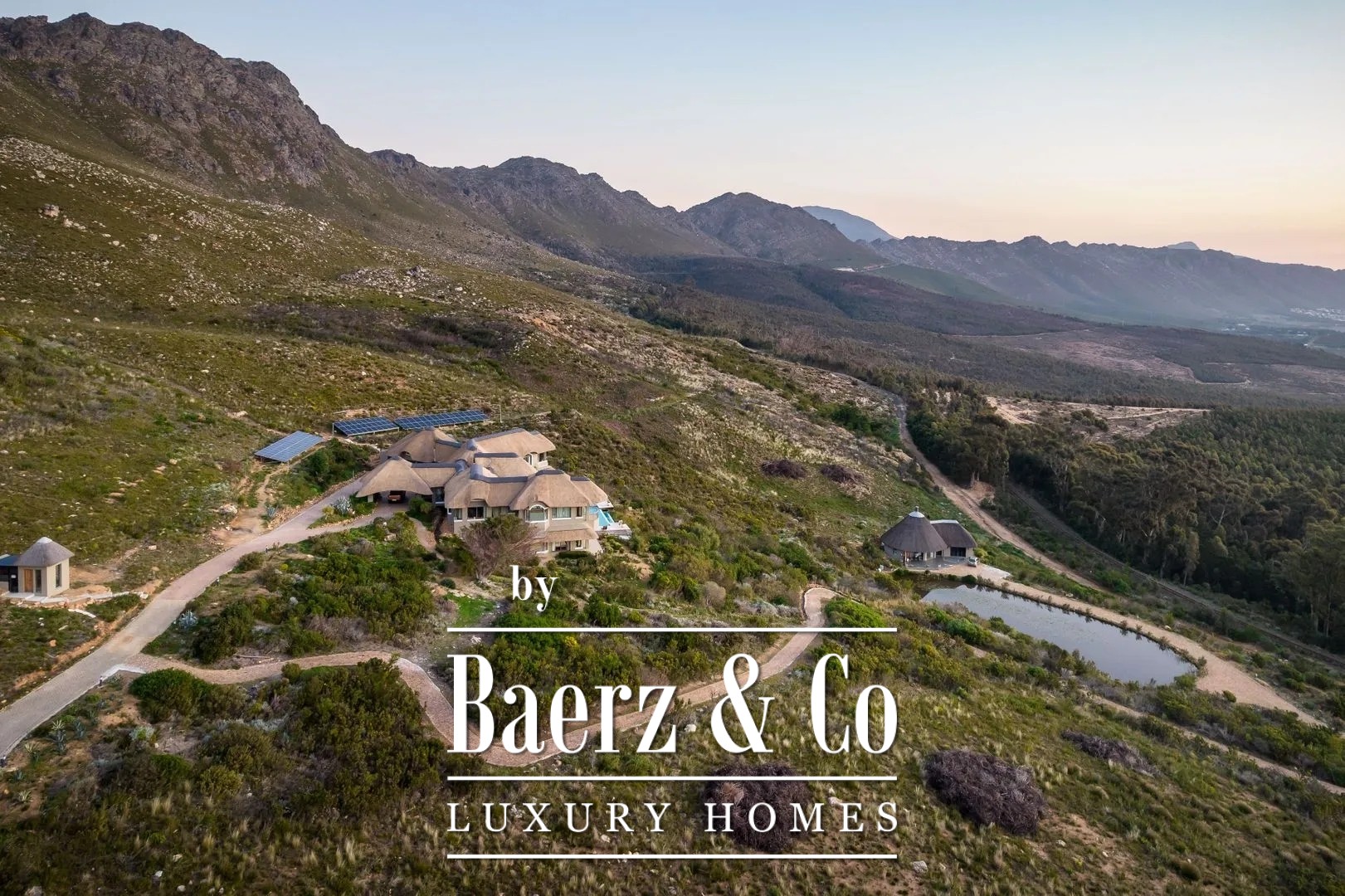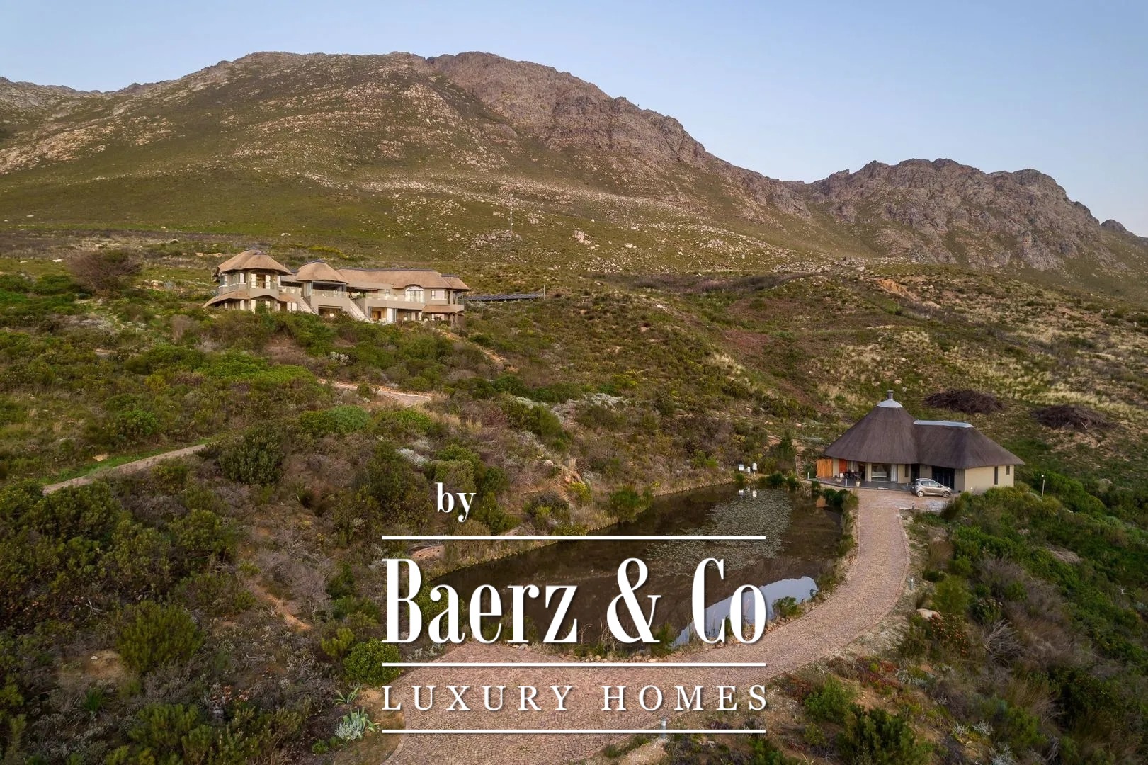 The separately situated guesthouse, located lower within the surrounding fynbos, with its own parking area and natural dam/pond, is accessible via a separate driveway.