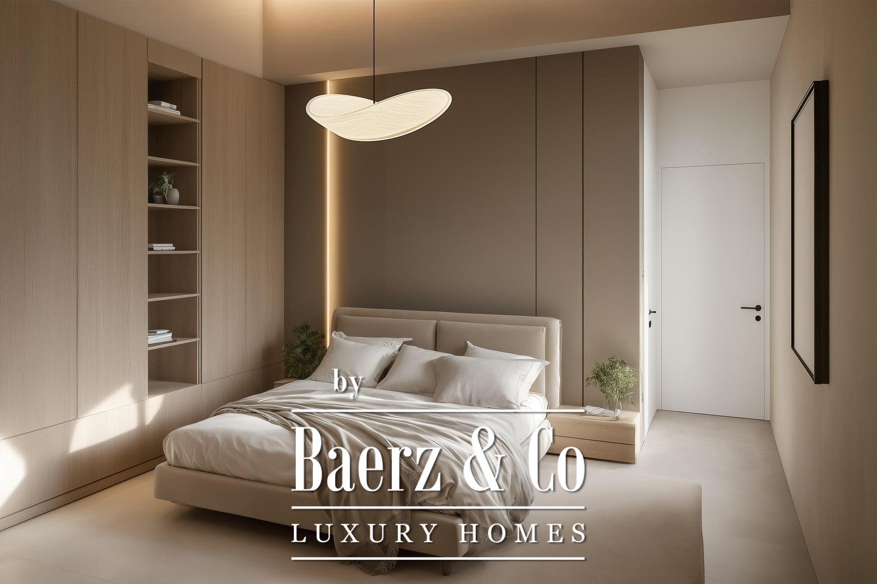 The interior is defined by carefully balanced volumes and light, from the generous open-plan living and dining area to the contemporary kitchen. Three bedrooms, each with its own luxuriously appointed bathroom, flow seamlessly with the living spaces, complemented by a private gym, guest toilet, and dedicated storage. The design achieves a subtle balance between form and function, ensuring a sense of calm and comfort throughout.