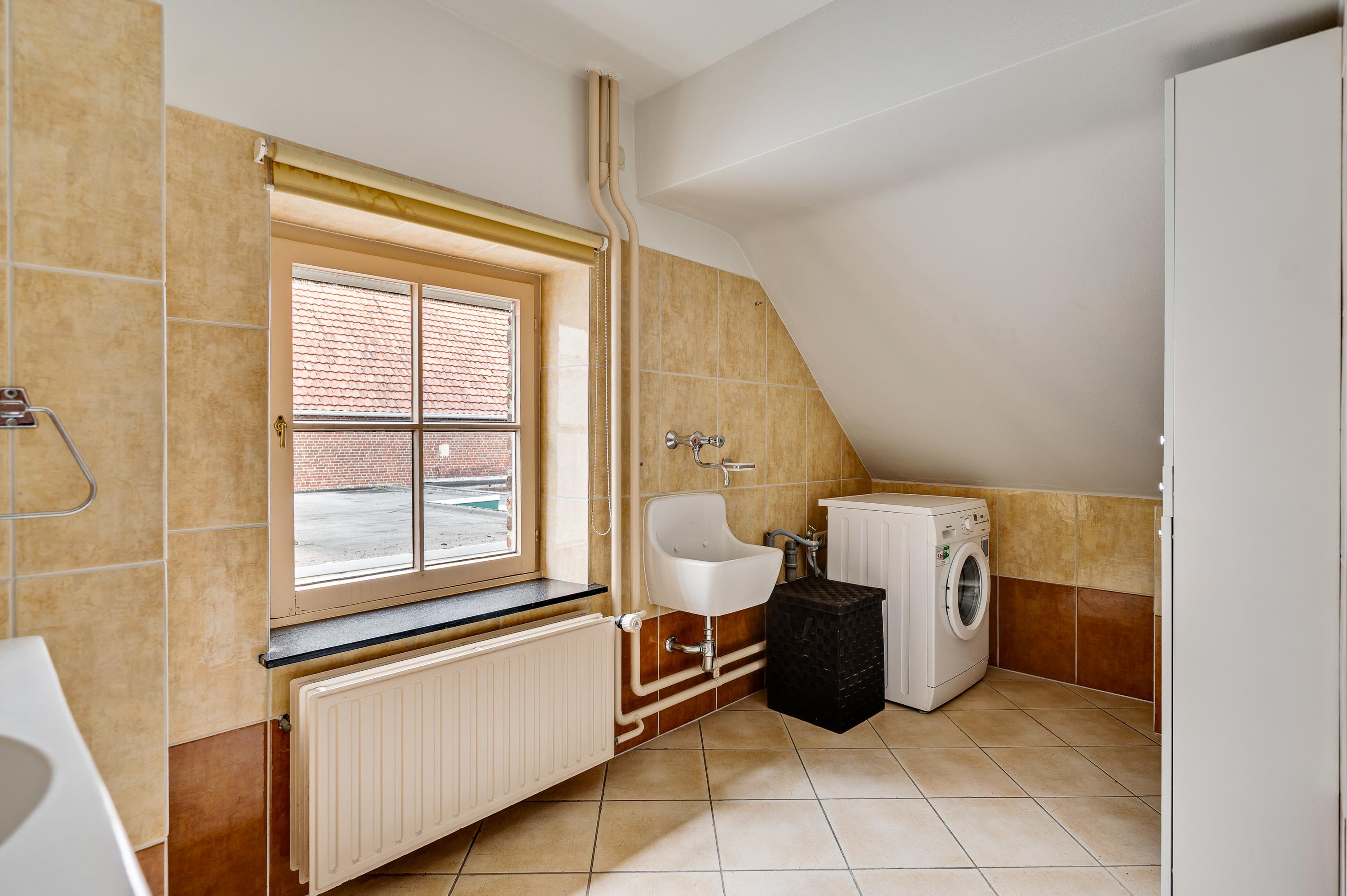 The spacious hall with a fireplace and meter cupboard provides access to the toilet, a bedroom with a separate bathroom, and the kitchen. The stairs to the first floor are also accessible from the hall. The hall also served as the B&B's former living room. This space can be used for various purposes.