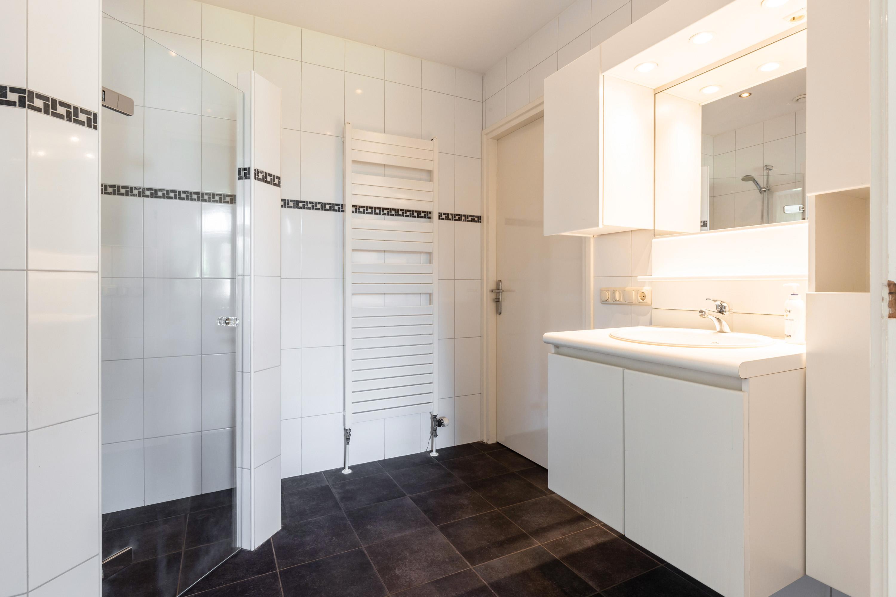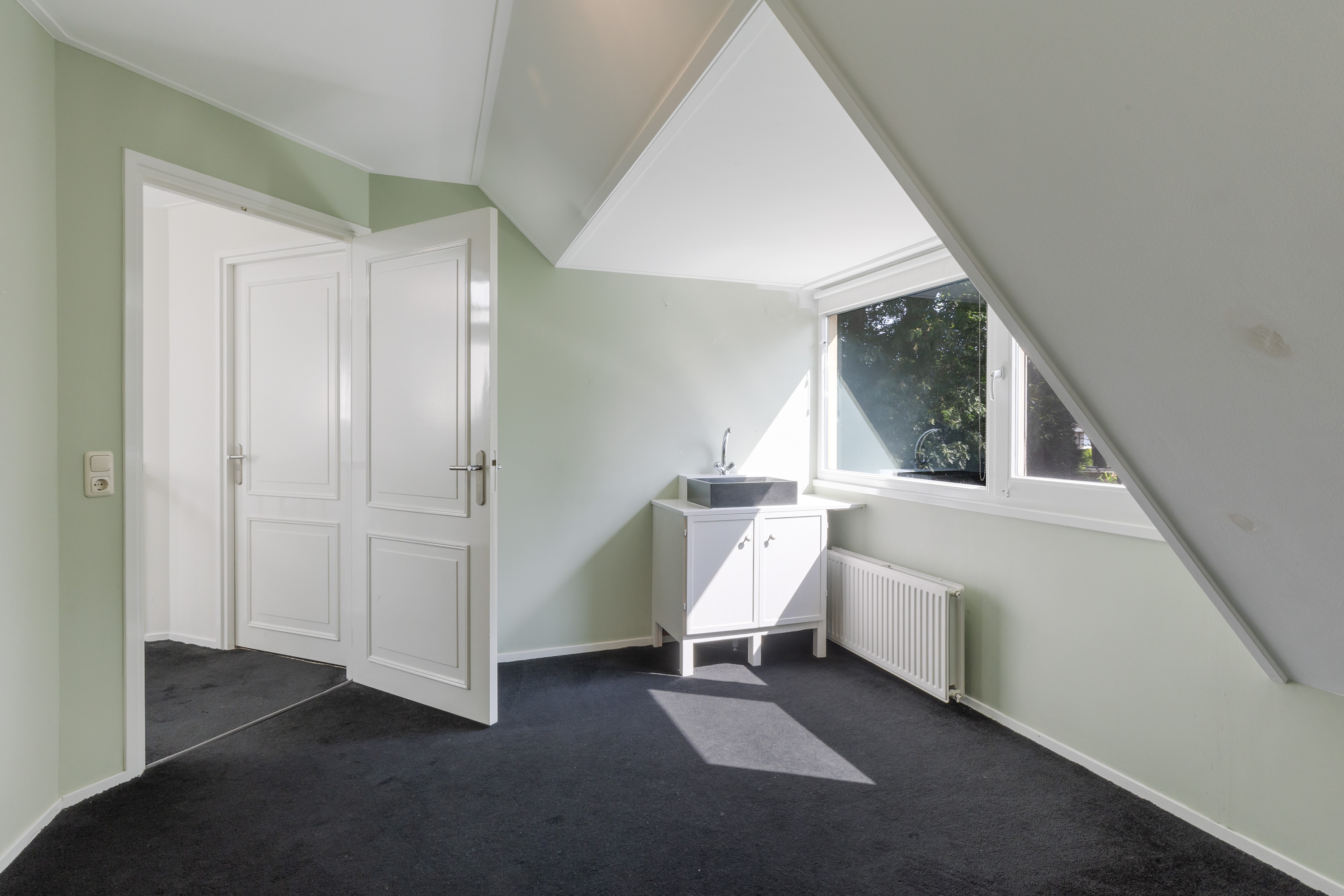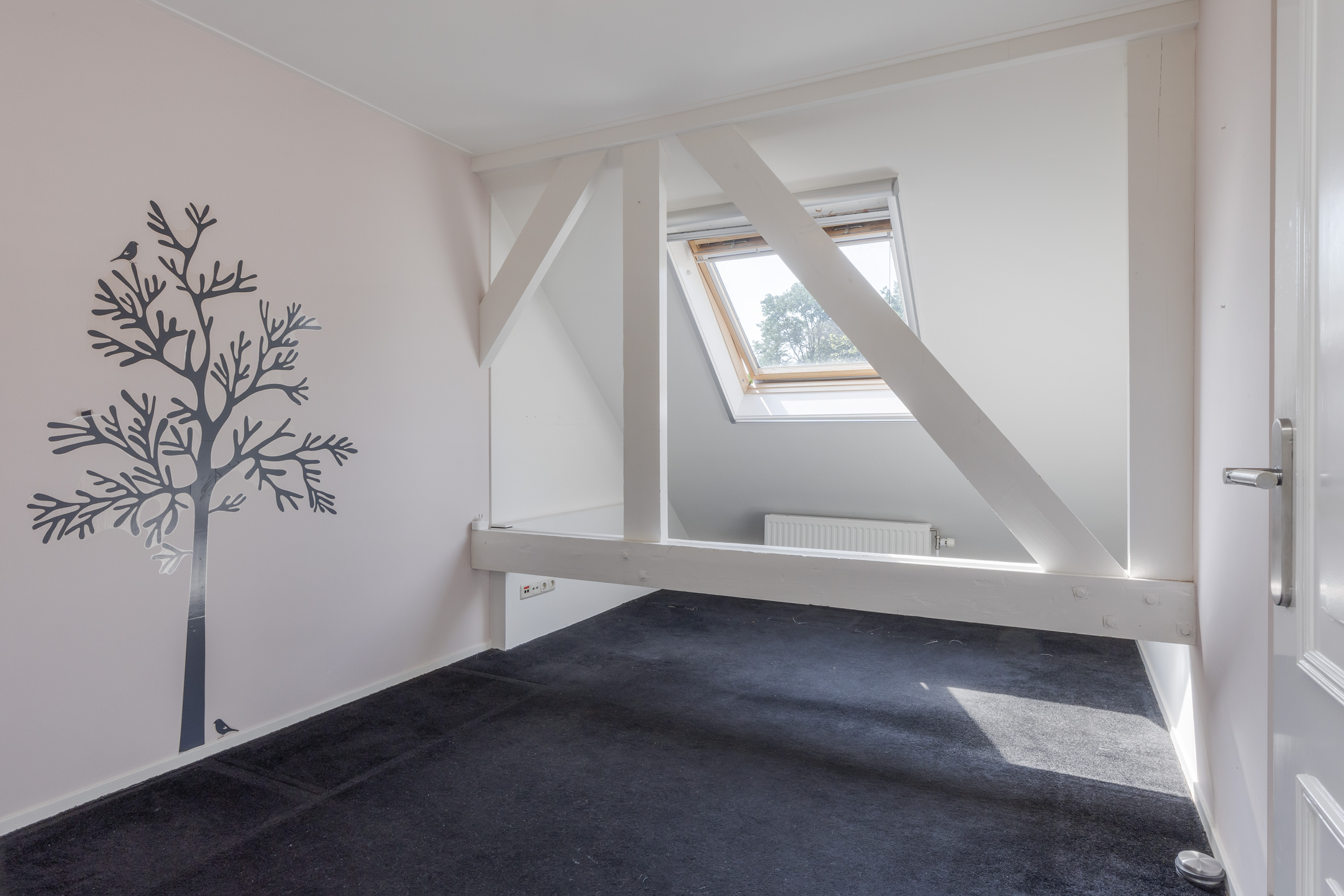 On the first floor you will find two spacious bedrooms, including a generous master bedroom with air conditioning, large dormer windows and Velux skylights that provide an abundance of natural light. This room offers ample space for a sitting or working area. The second bedroom is also suitable for a double bed and has a dormer window. A modern bathroom with walk-in shower, washbasin and second toilet completes the comfort.