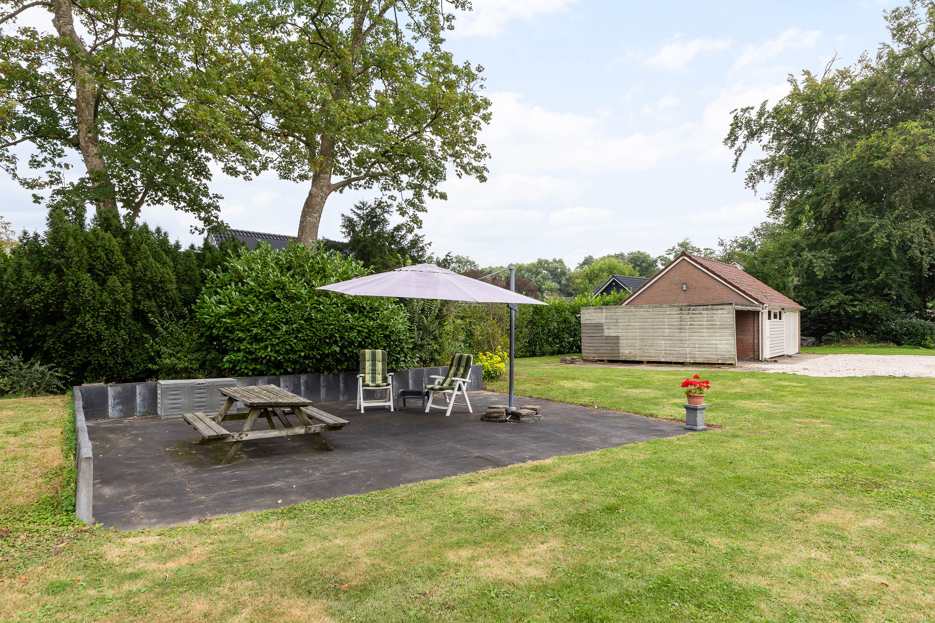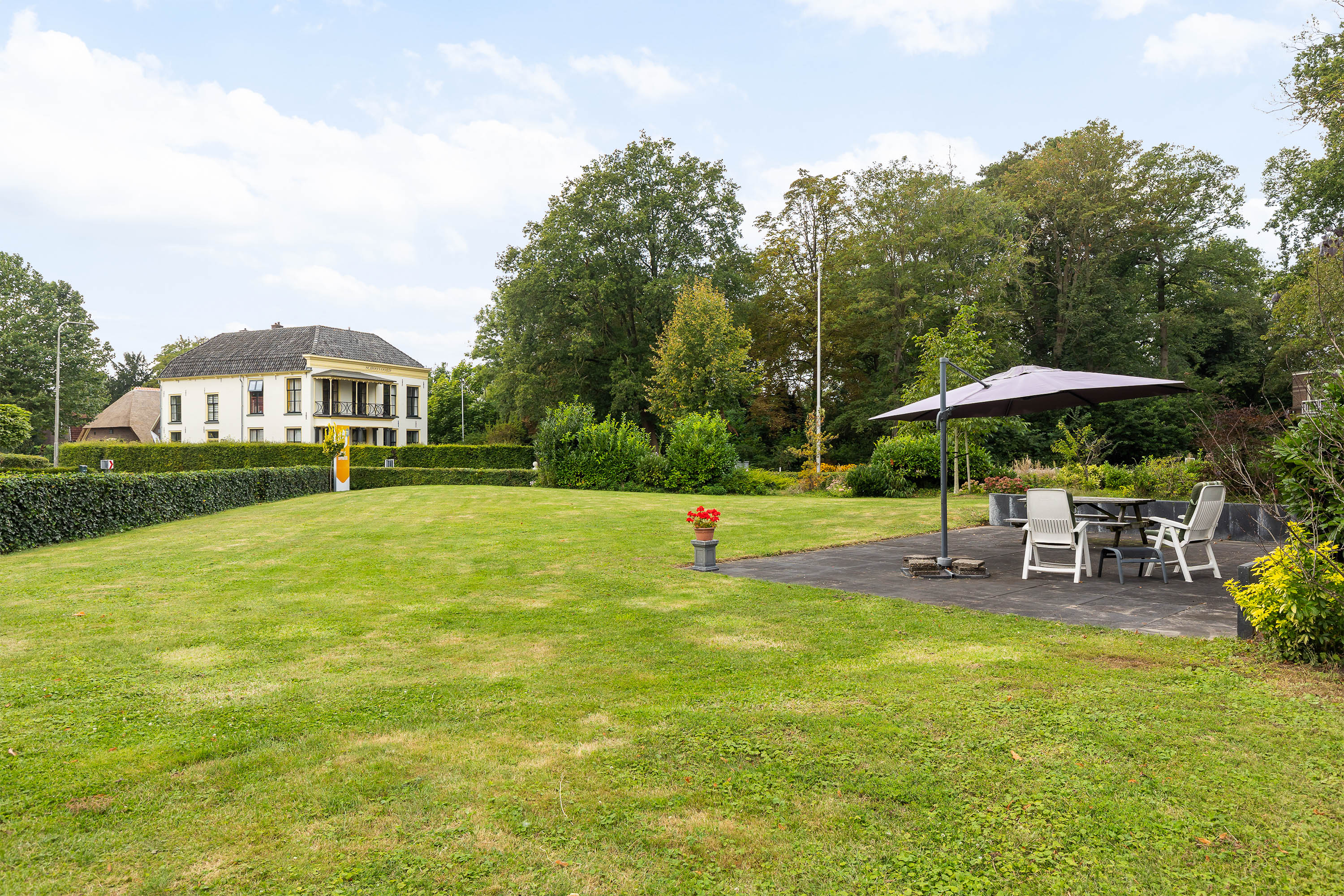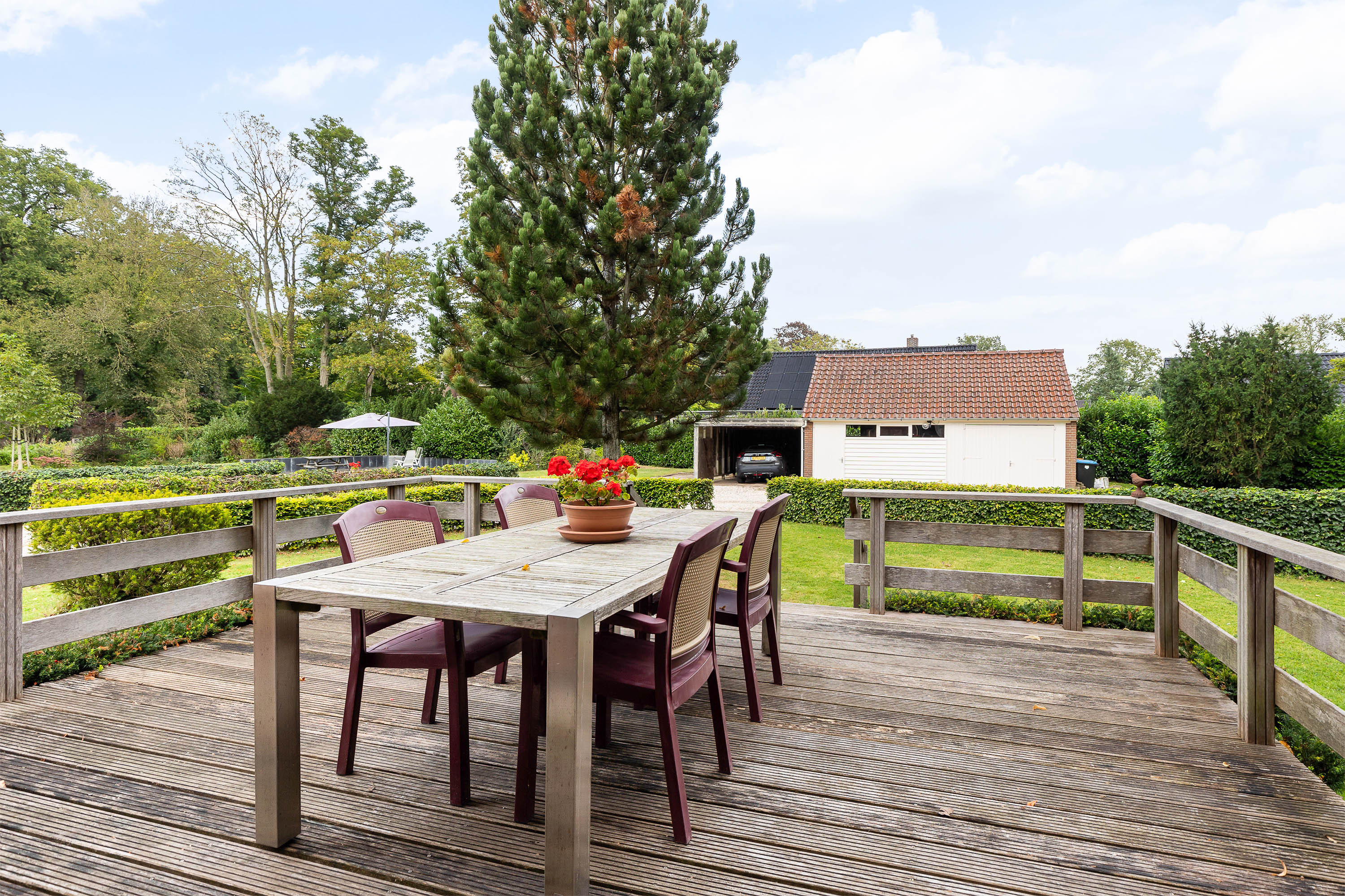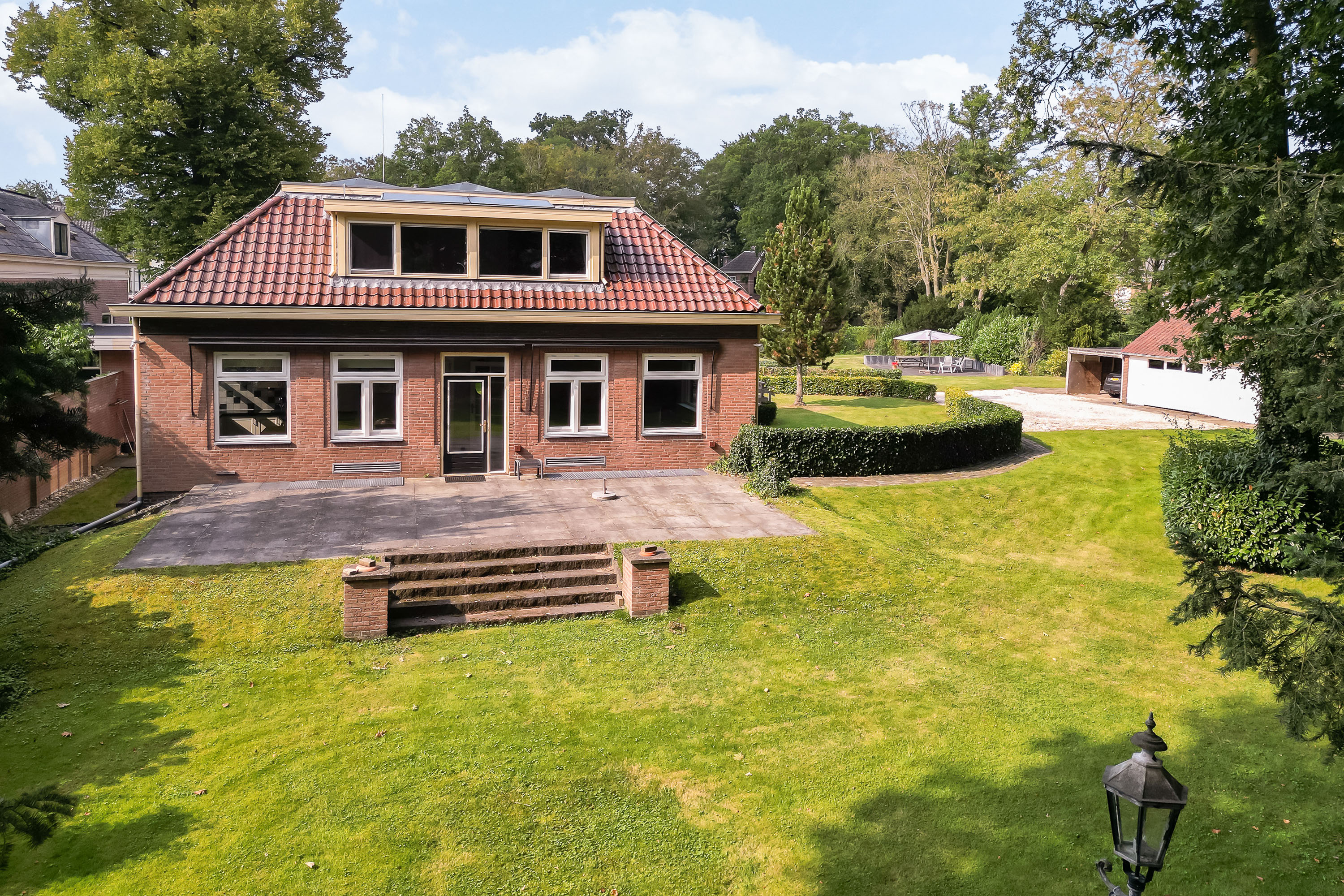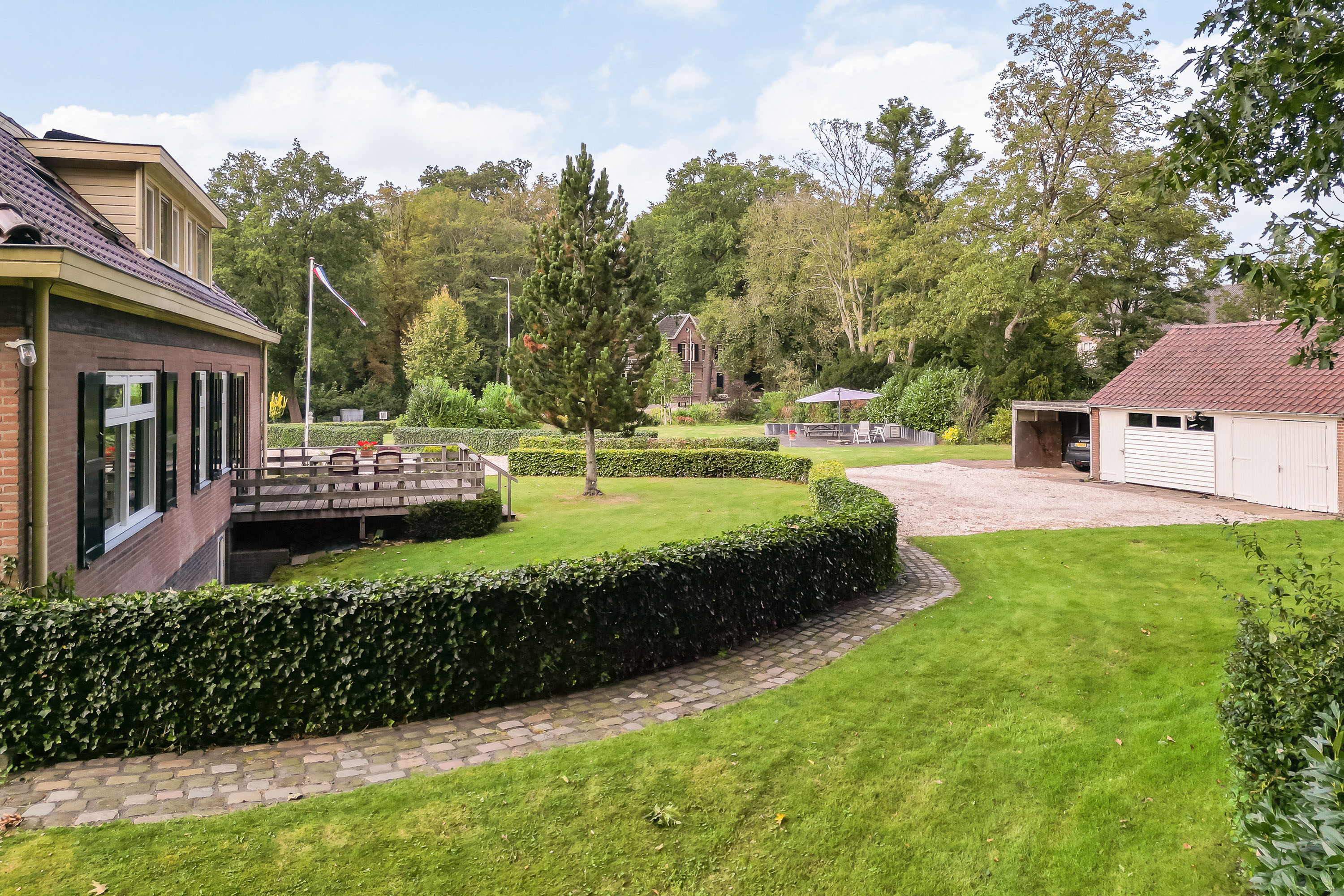 The house is surrounded by a generous garden with three terraces, each offering its own ambience and privacy. The driveway at the front has an impressive appearance with a greenery plantation and tall flagpole, surrounded by eight parking spaces. The driveway also leads to the detached garage with generous storage, carport and a third private parking space. At the back of the garden is a gazebo with tiled roof, ideal as storage space or cosy veranda. The garden itself offers plenty of opportunities for relaxation and recreation, with lush hedges, decorative paving, a large lawn and mature trees providing shaded areas and privacy.