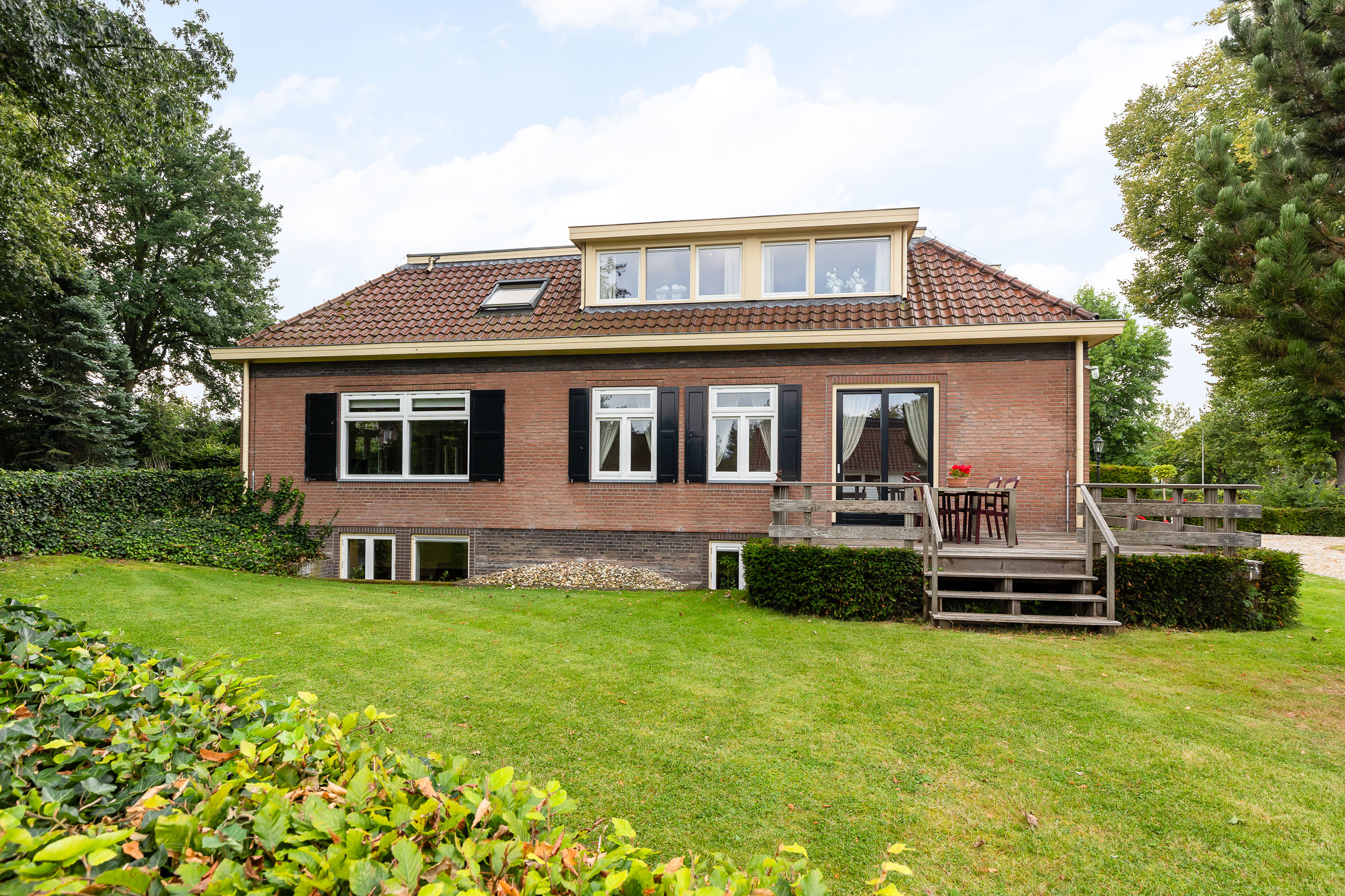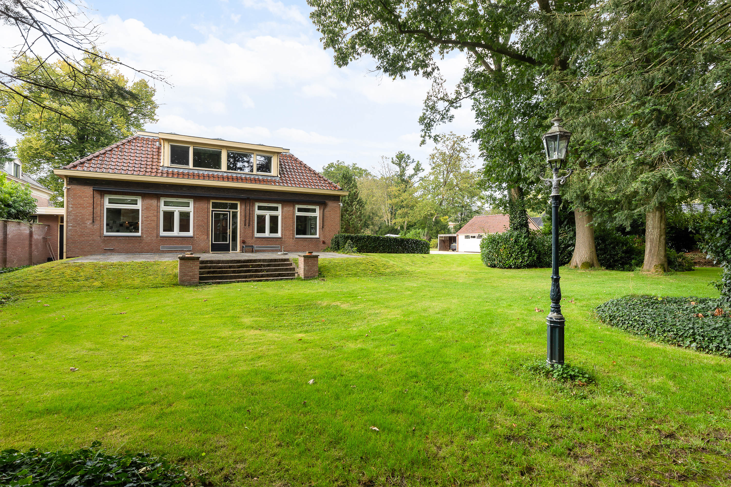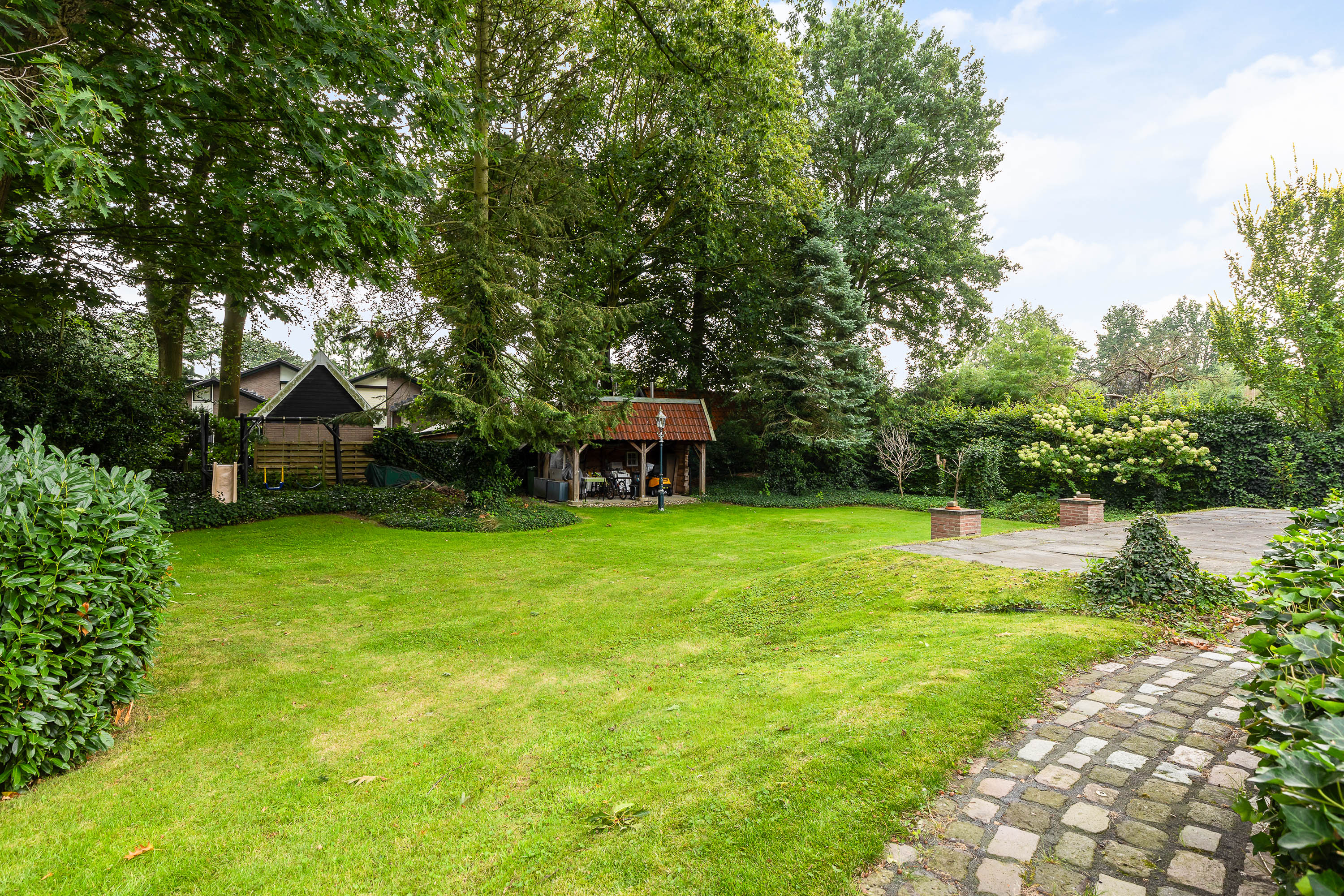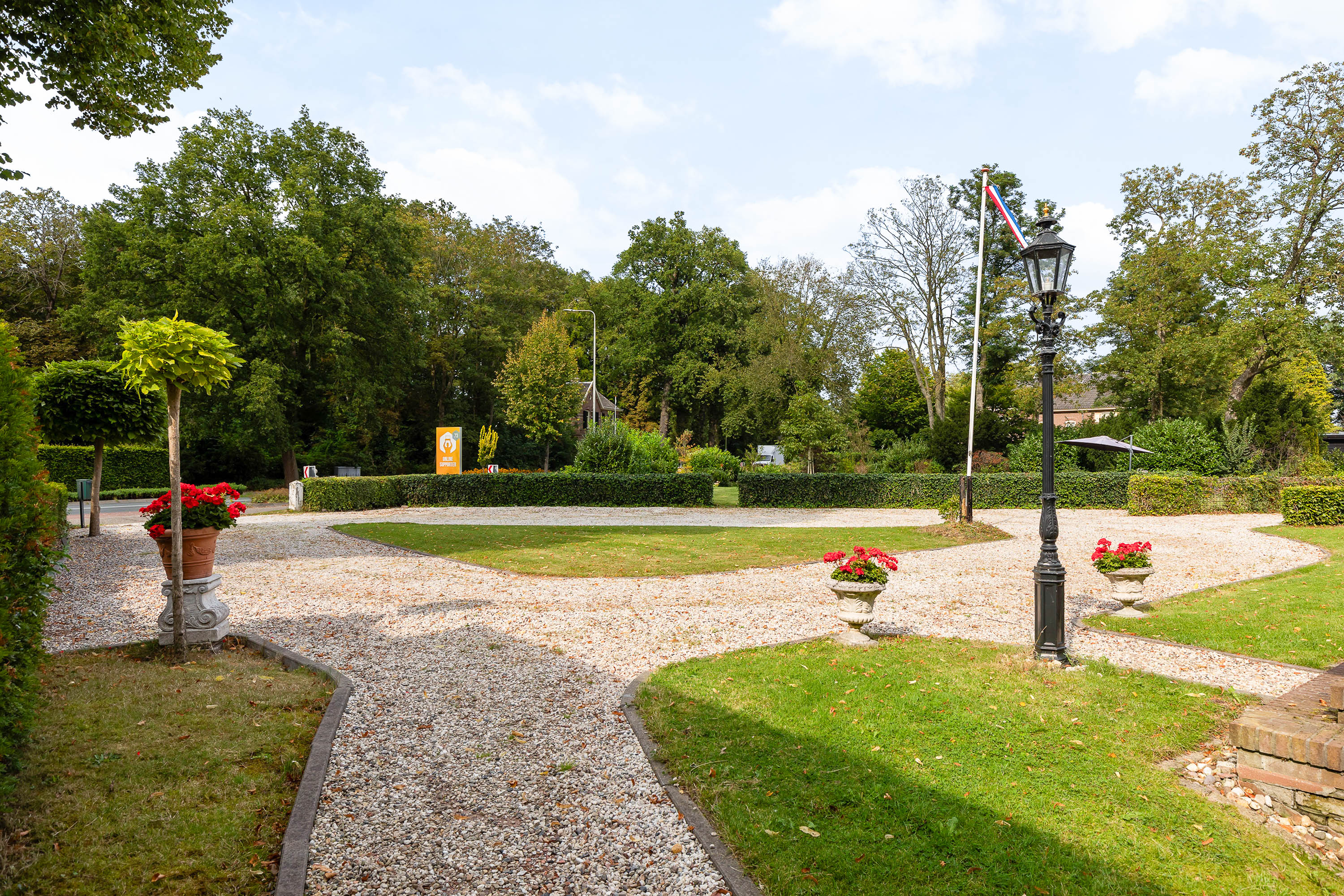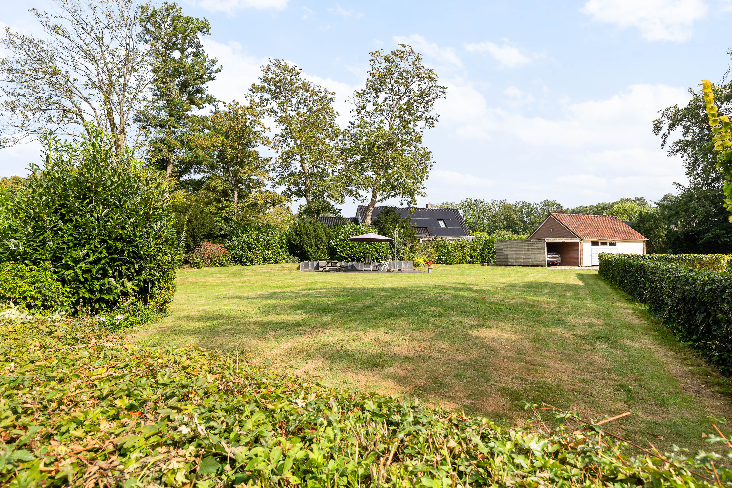 The house is surrounded by a generous garden with three terraces, each offering its own ambience and privacy. The driveway at the front has an impressive appearance with a greenery plantation and tall flagpole, surrounded by eight parking spaces. The driveway also leads to the detached garage with generous storage, carport and a third private parking space. At the back of the garden is a gazebo with tiled roof, ideal as storage space or cosy veranda. The garden itself offers plenty of opportunities for relaxation and recreation, with lush hedges, decorative paving, a large lawn and mature trees providing shaded areas and privacy.