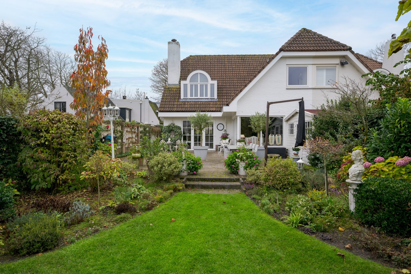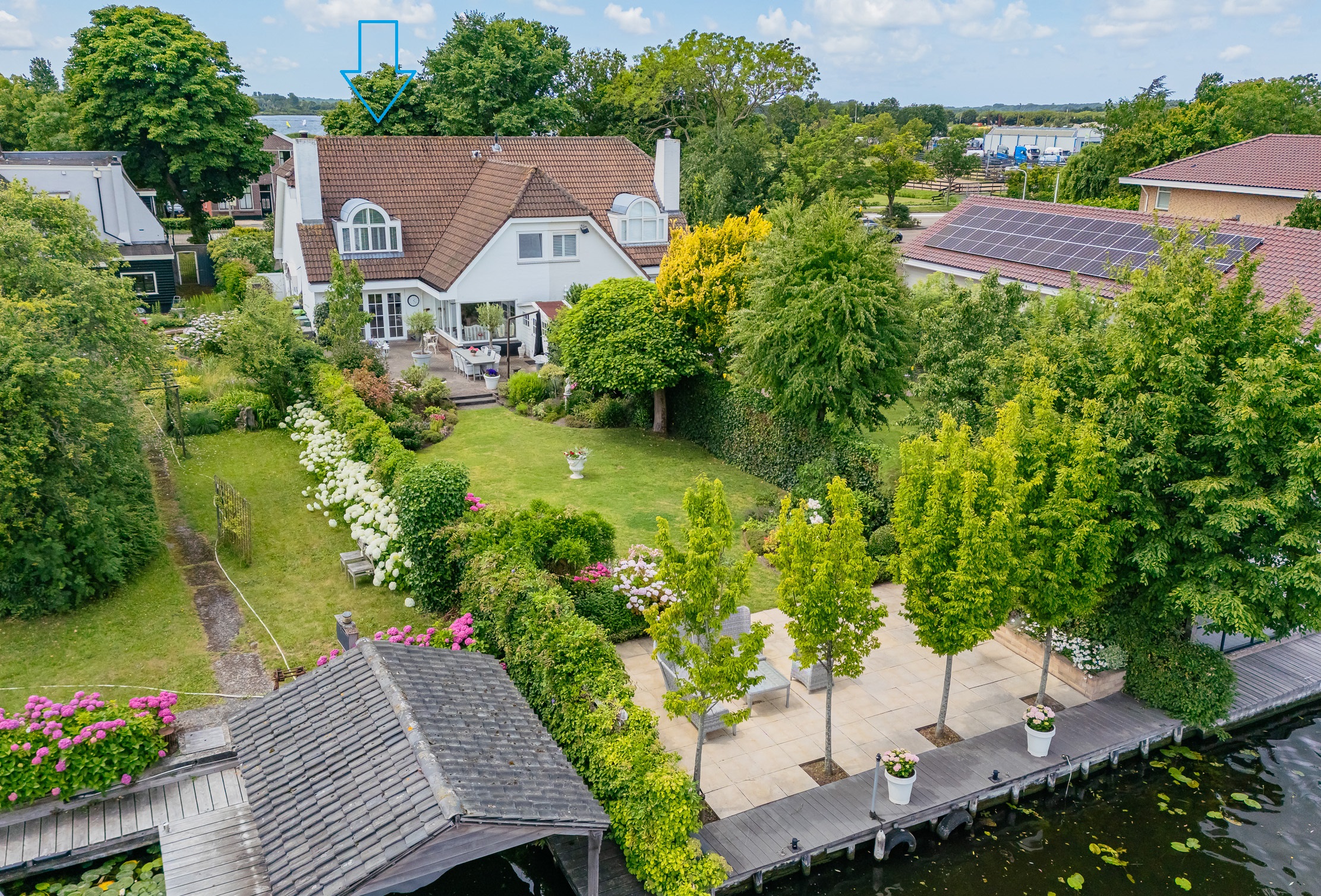 The beautifully landscaped, sunny backyard borders directly on water of the Old Rhine and features a shed and a private jetty. In the front yard is a cozy terrace. In the afternoon and evening you can relax in the sun. The entire garden is equipped with a sprinkler system. In the front garden is parking for three cars on site.