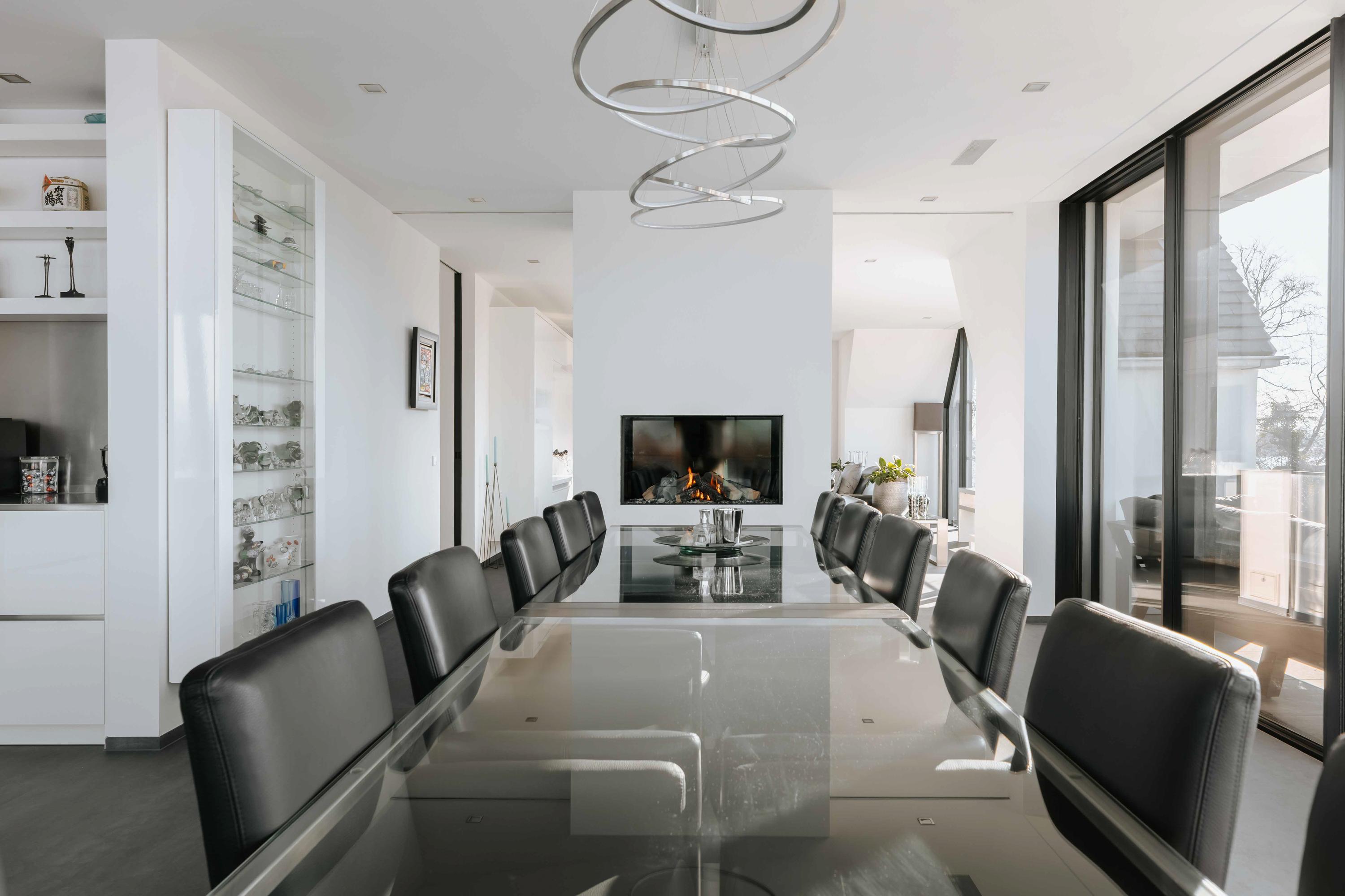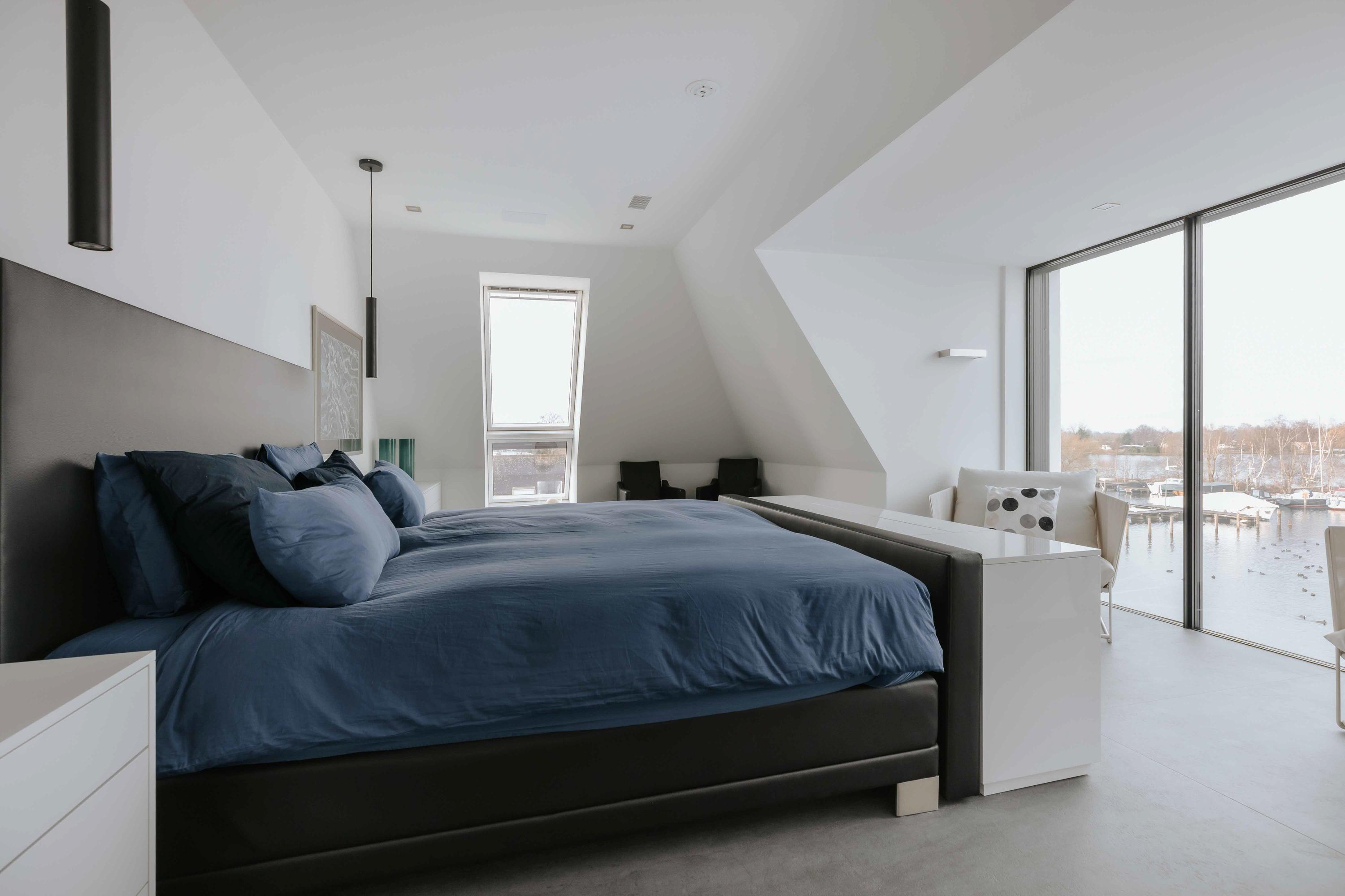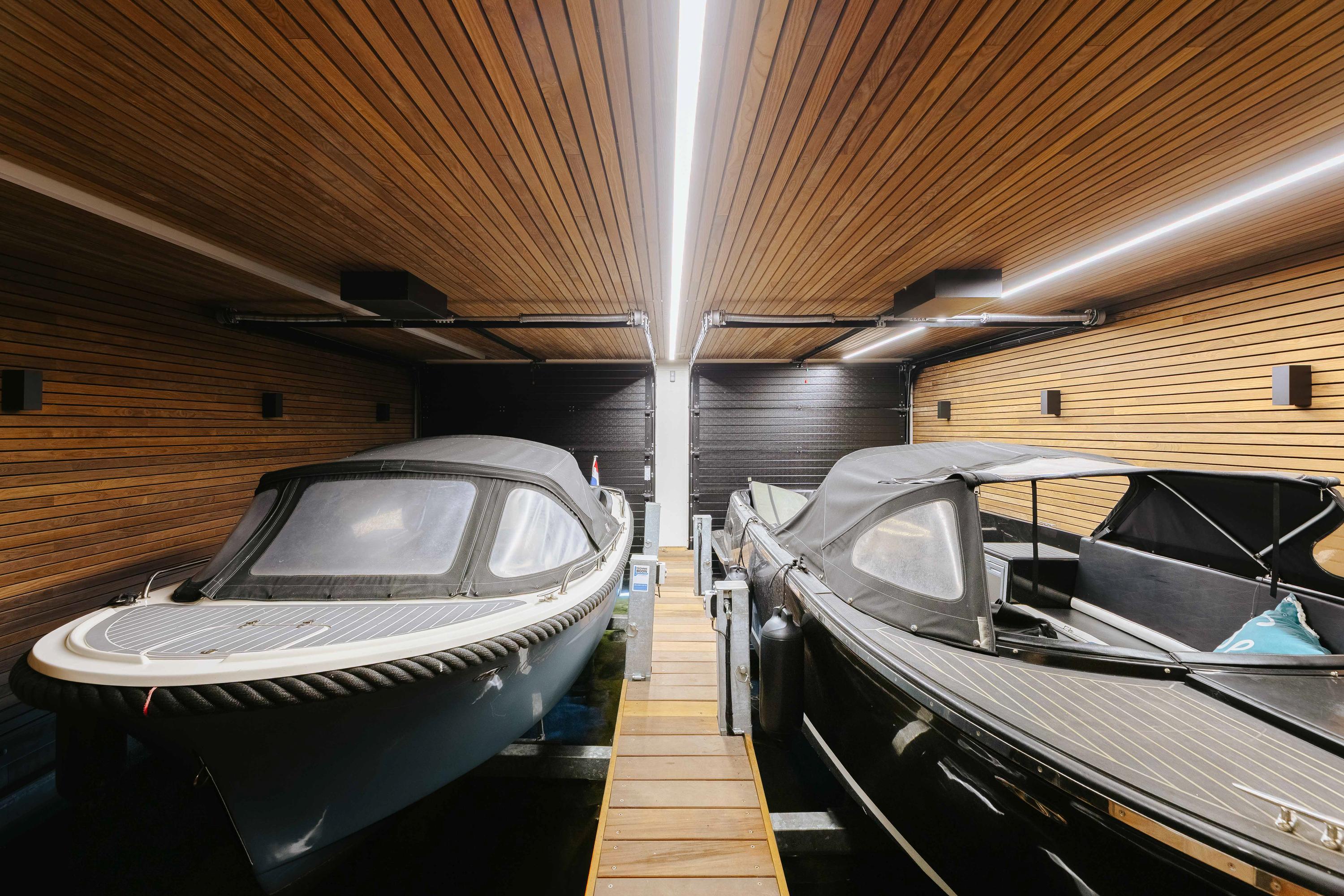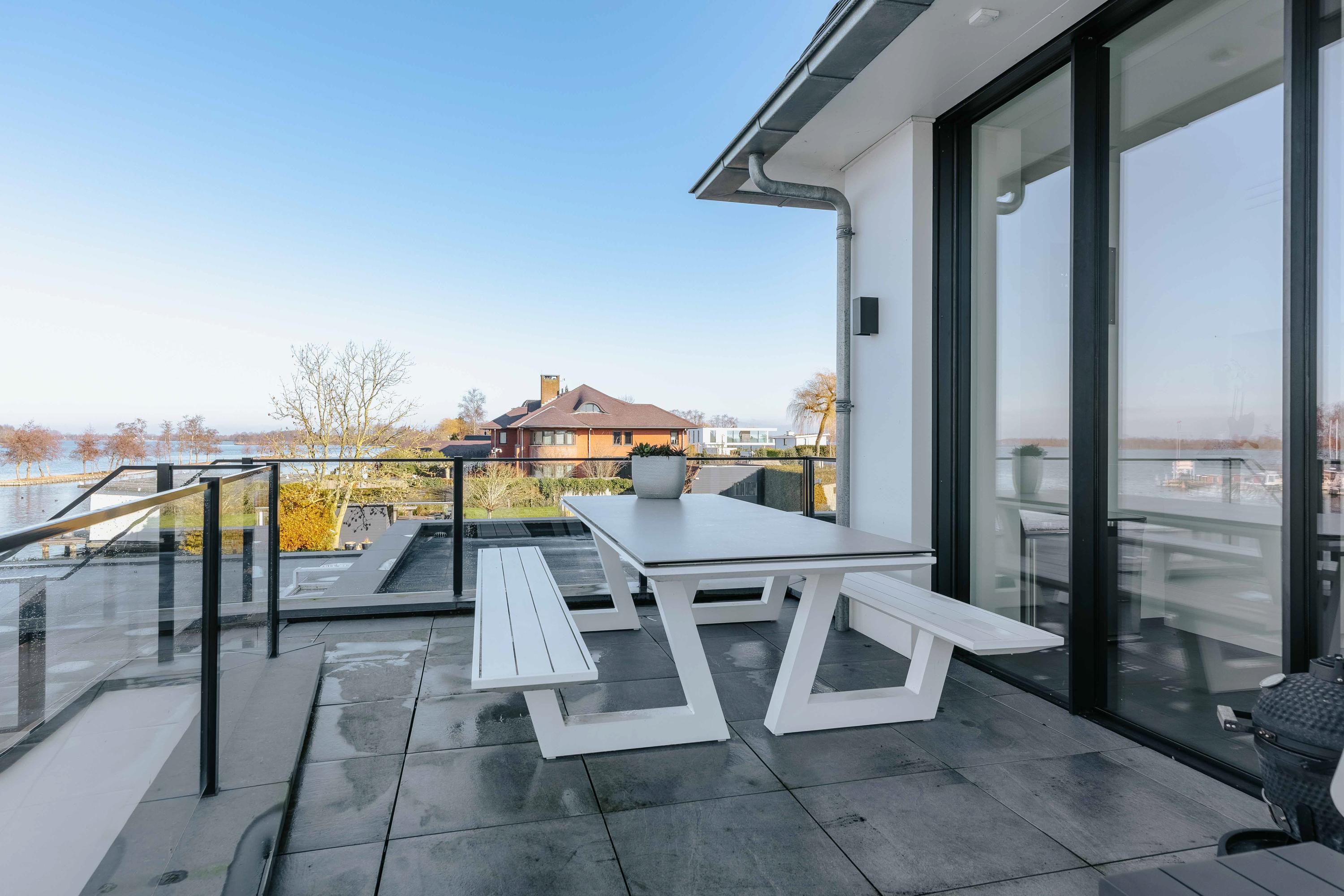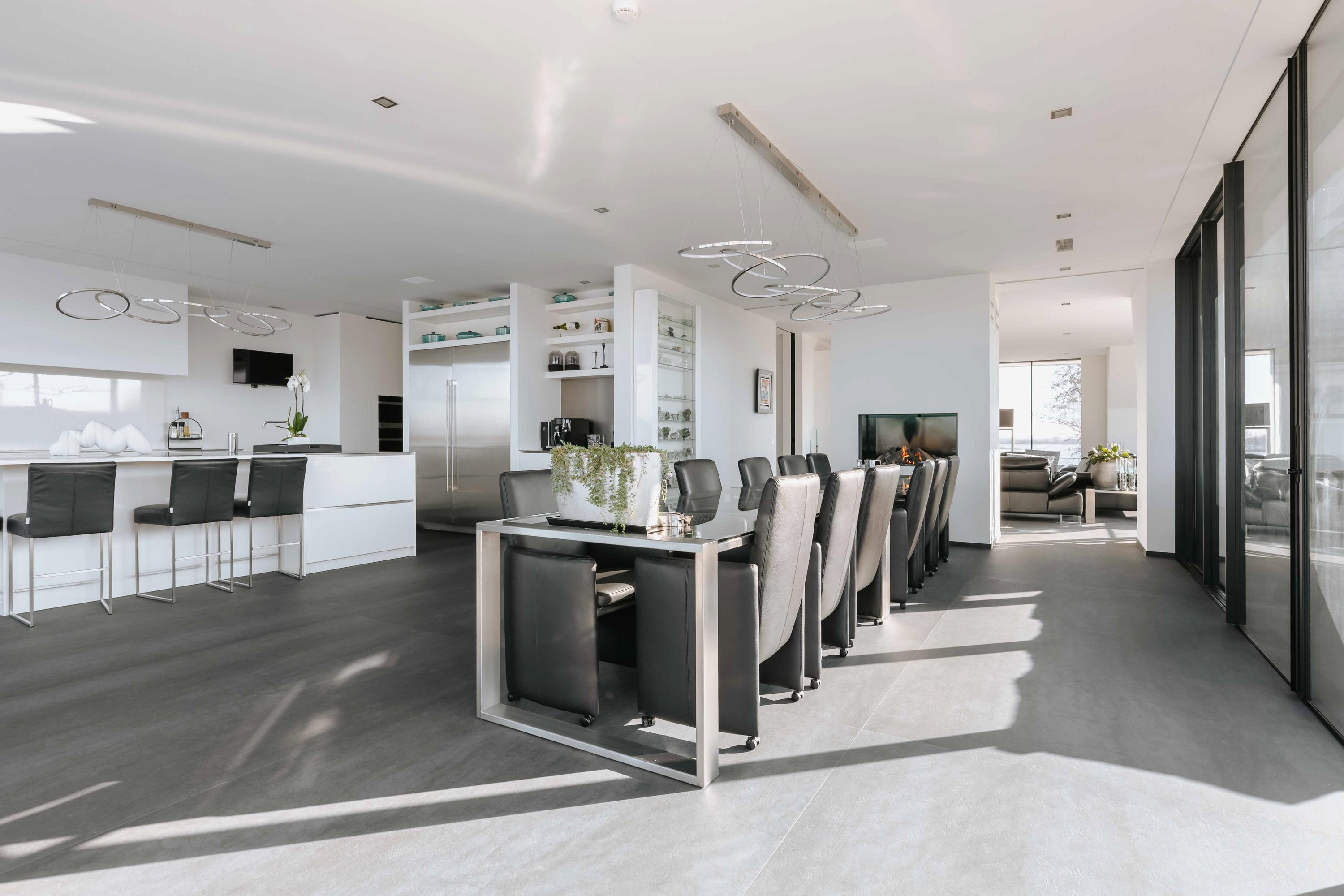 The villa is spread over several levels and has a passenger lift that can reach all levels. The spacious living area is located on the first floor and is characterized by impressive light thanks to floor-to-ceiling windows all around. Inside and outside flow seamlessly into each other here. The luxurious designer kitchen (Lodder) with high-quality built-in appliances forms the heart of the floor, flanked by a spacious dining room and living room with gas fireplaces and stylish, silently sliding steel/glass doors. From the kitchen, you can enjoy phenomenal views of both the harbor and the Vinkeveense Plassen lakes.