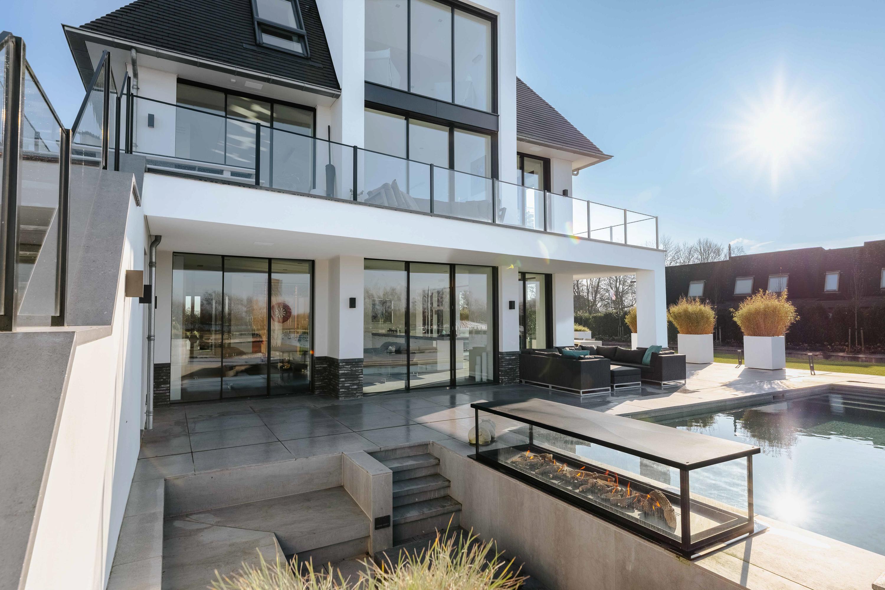 The beautifully landscaped garden surrounding the house offers sun or shade at any time of the day and features several terraces, a sunken seating area with a fire pit, a heated swimming pool, and a jetty with swimming steps.