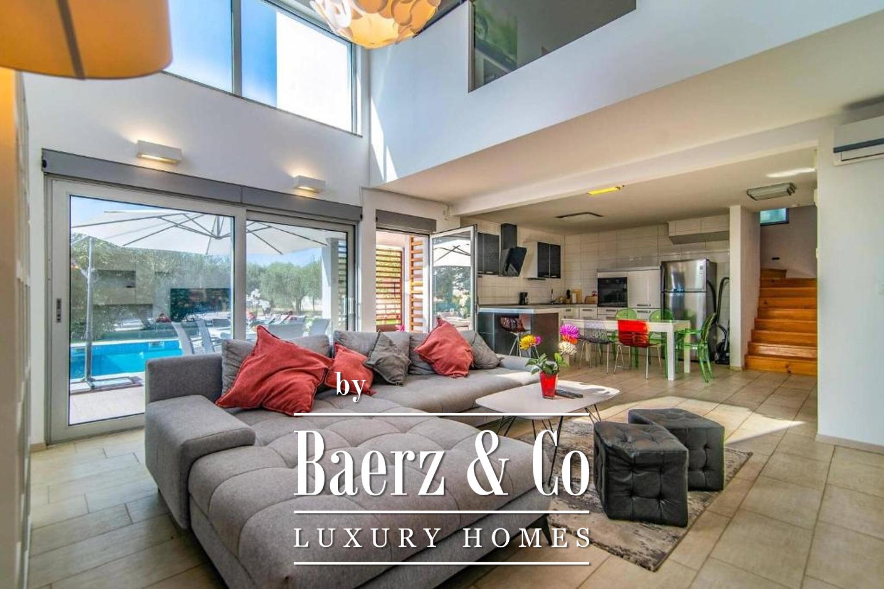 Villa Vodnjan with panoramic sea views stands as a testament to modern design and refined privacy, minutes from the heart of Vodnjan and vital amenities. This property offers 173 m² of thoughtfully arranged living space within a secure and landscaped plot of 1,294 m², ensuring seclusion and an open outlook over nature, the Brijuni archipelago, and the sea stretching towards Pula.