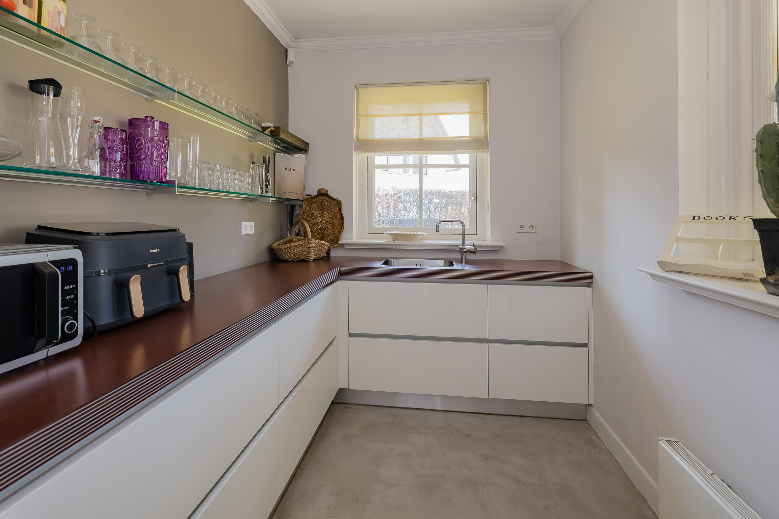 This villa exudes pure class and elegance thanks to the exceptionally high level of finishing. The interior is finished to perfection with custom cabinets and beautiful steel doors that emphasize the stylish atmosphere. In the living room you will find an impressive sandstone fireplace with fireplace, which is the centerpiece of the room. The exclusive kitchen features top-of-the-line appliances and a cozy gas fireplace, perfect for cozy evenings. The interior combines a robust concrete floor on the first floor with an elegant wooden floor in the living room and upstairs, while outside the terrace has very large, luxurious garden tiles. Everything has been carefully chosen to create an attractive, luxurious and timeless interior.