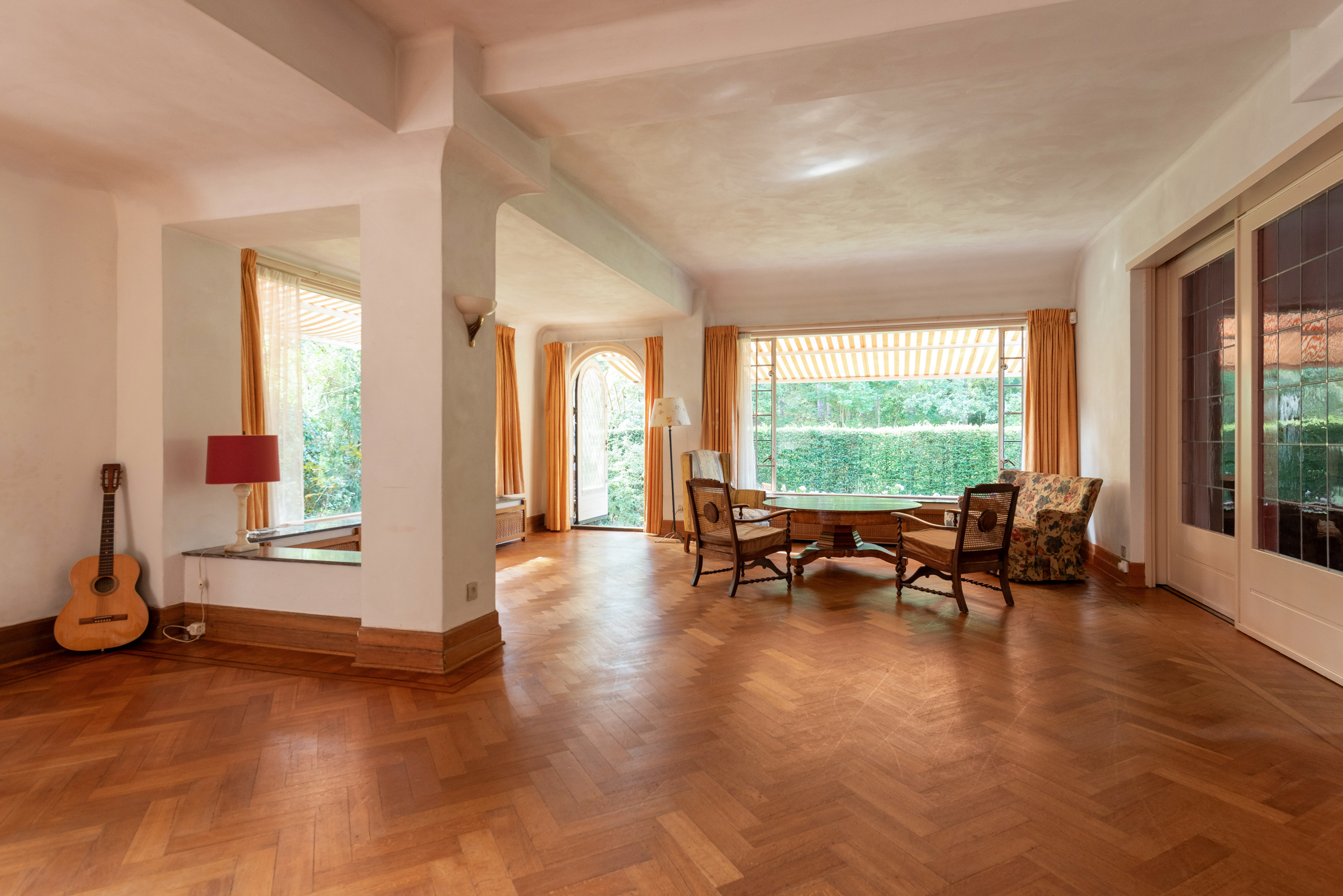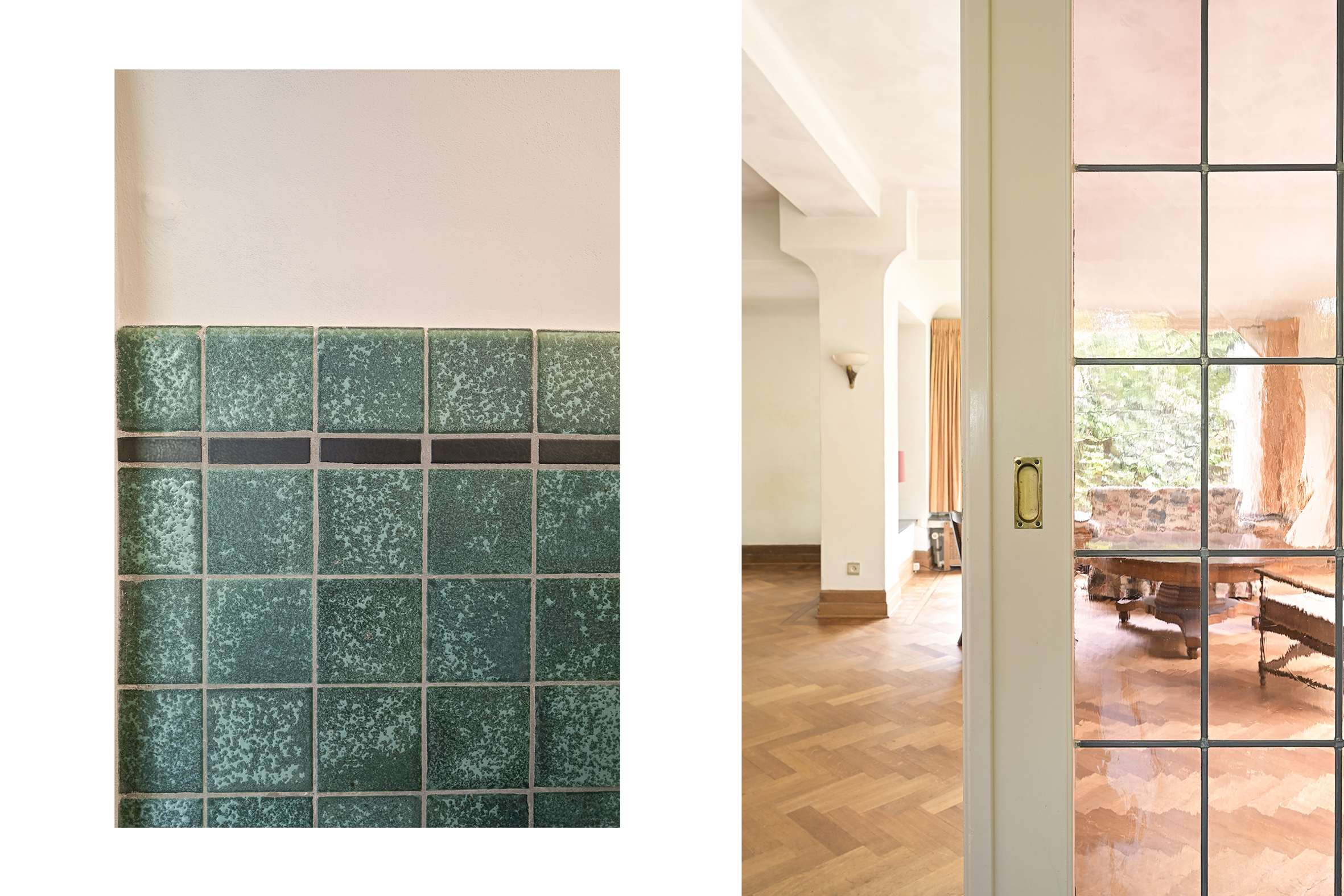Entrance into a spacious reception hall with a beautifully laid mosaic floor, an impressive staircase, and a simple WC with a small sink. Double sliding doors with stained glass windows lead into the spacious and bright living/dining room featuring oak parquet floors, a fireplace, marble windowsills, and access to the sunny garden.