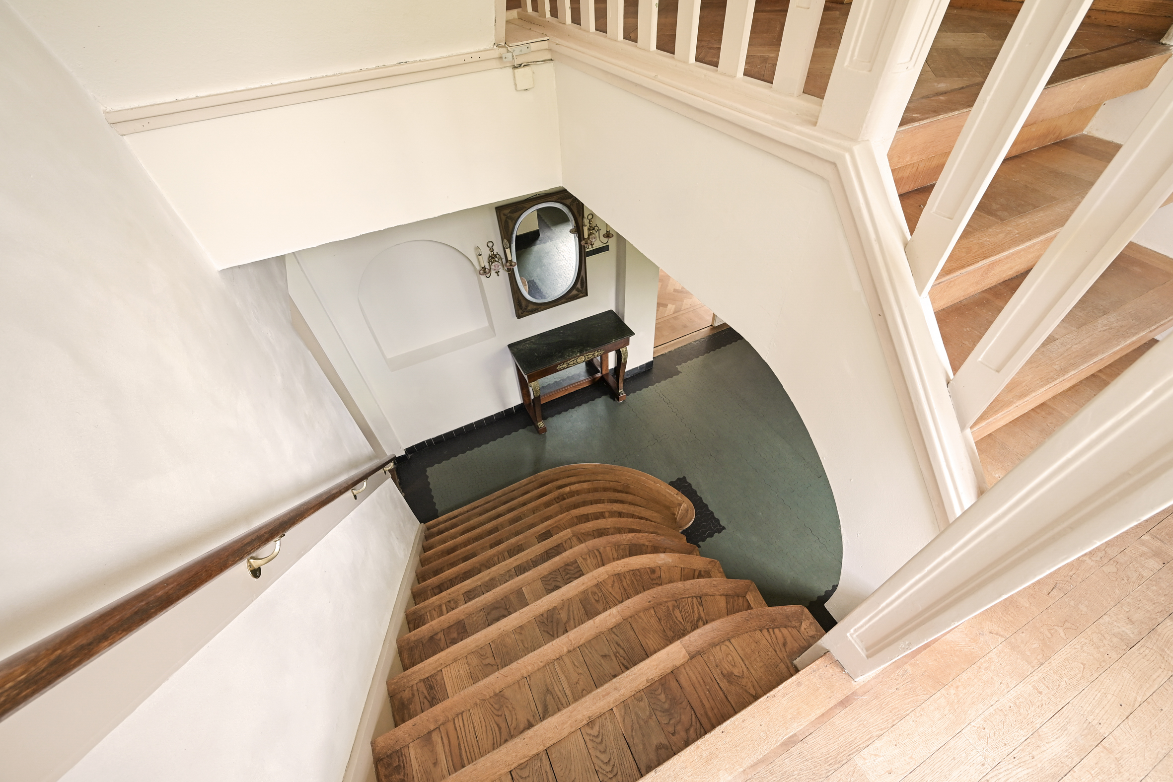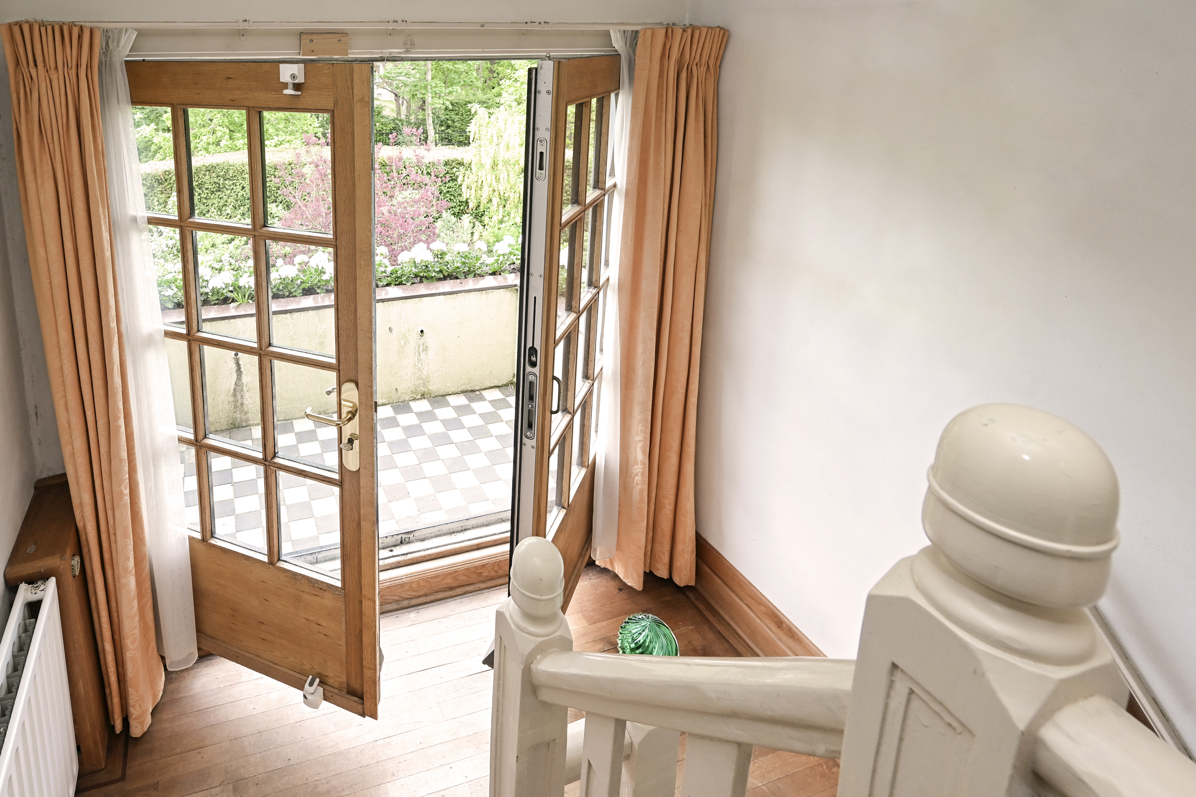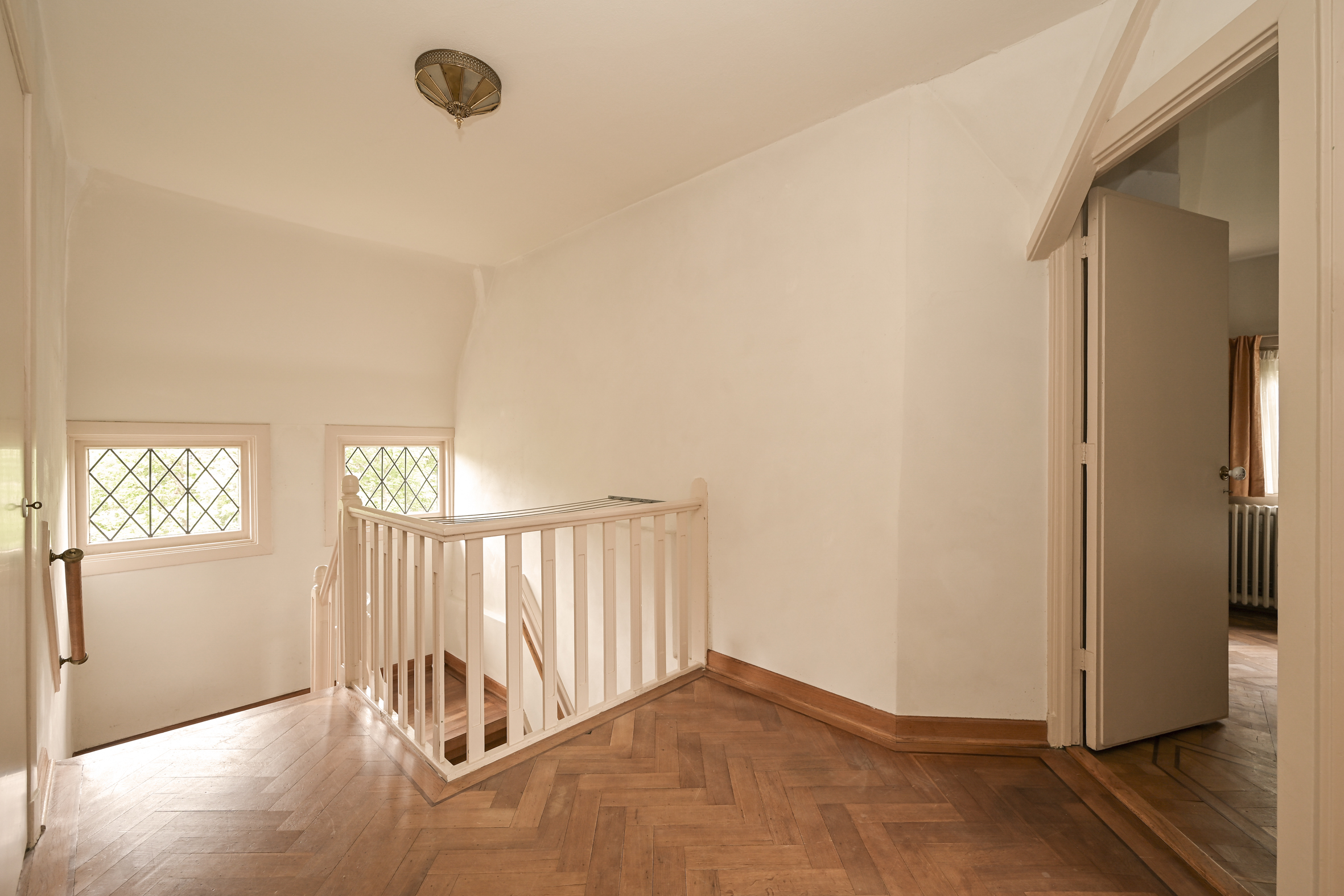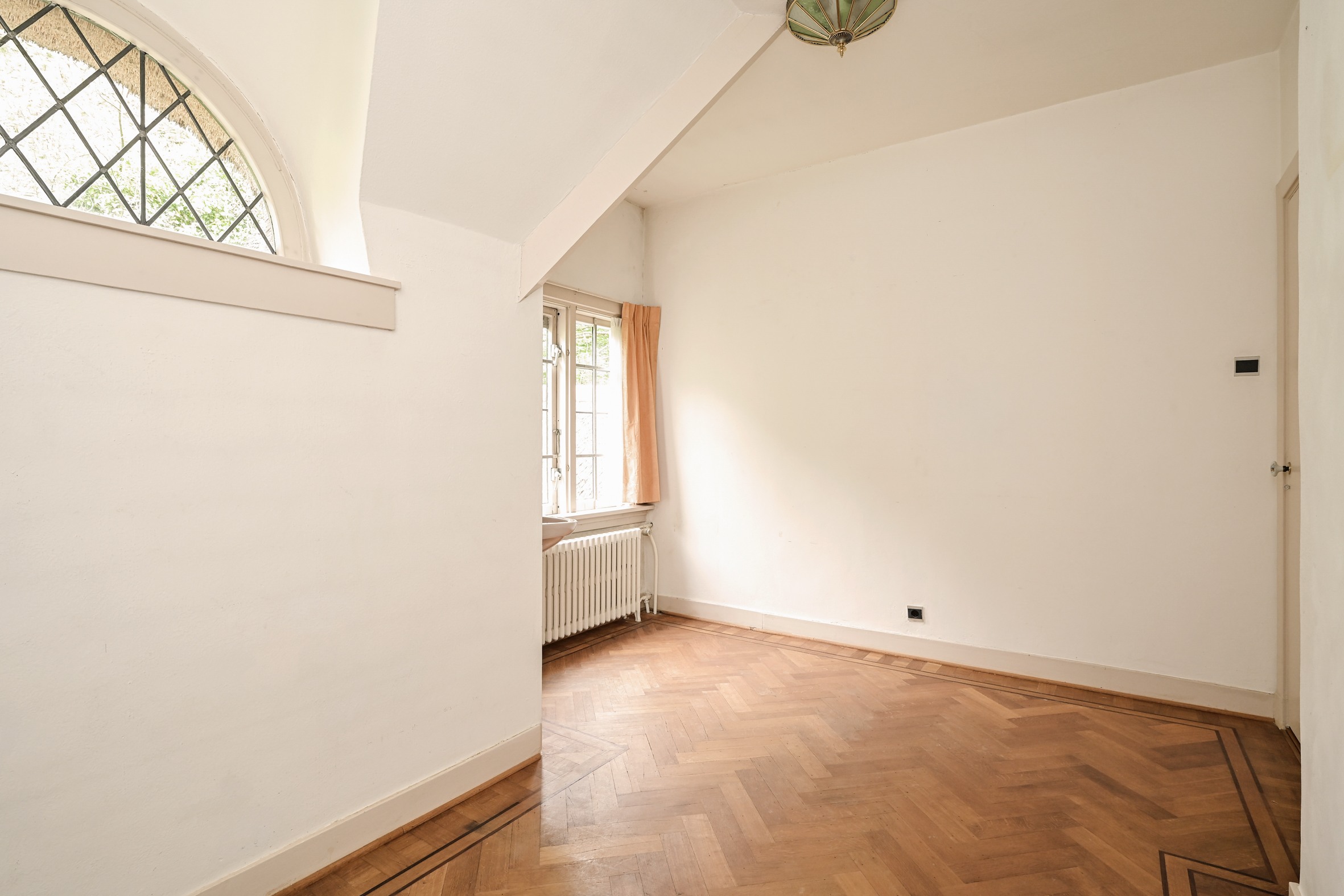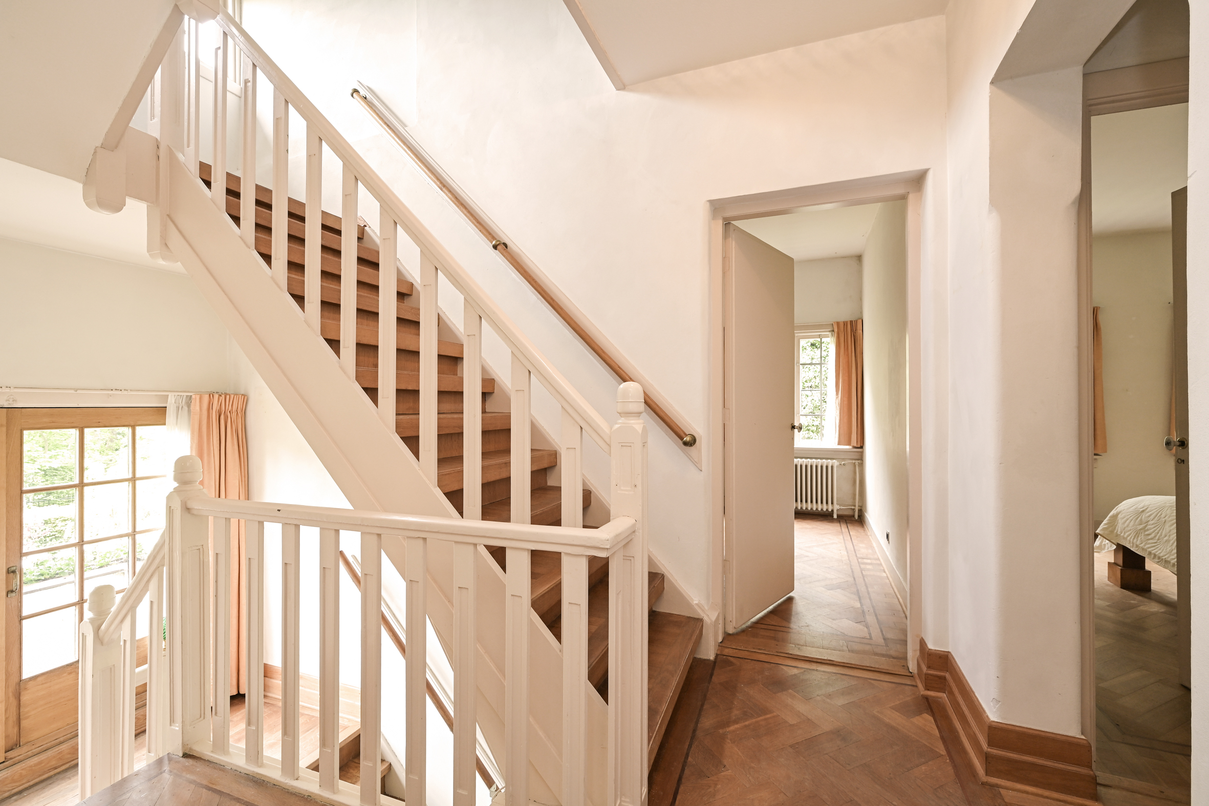 The attractive, light-filled stairwell with a landing that opens onto a balcony leads to the first floor, where you’ll find a simple bathroom, a separate shower, a beautiful study with access to a large balcony, and two spacious bedrooms. As mentioned, all rooms feature oak parquet flooring.