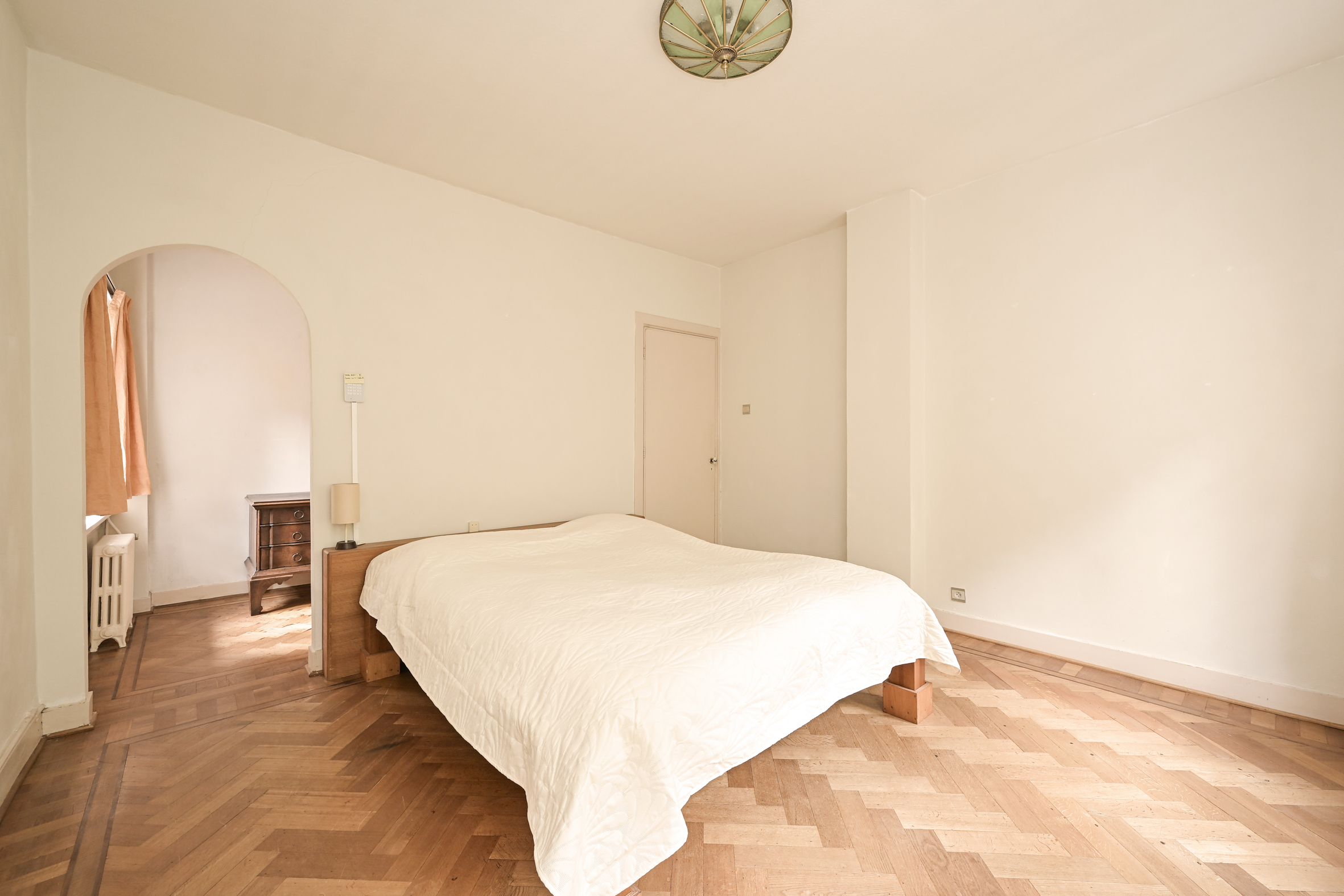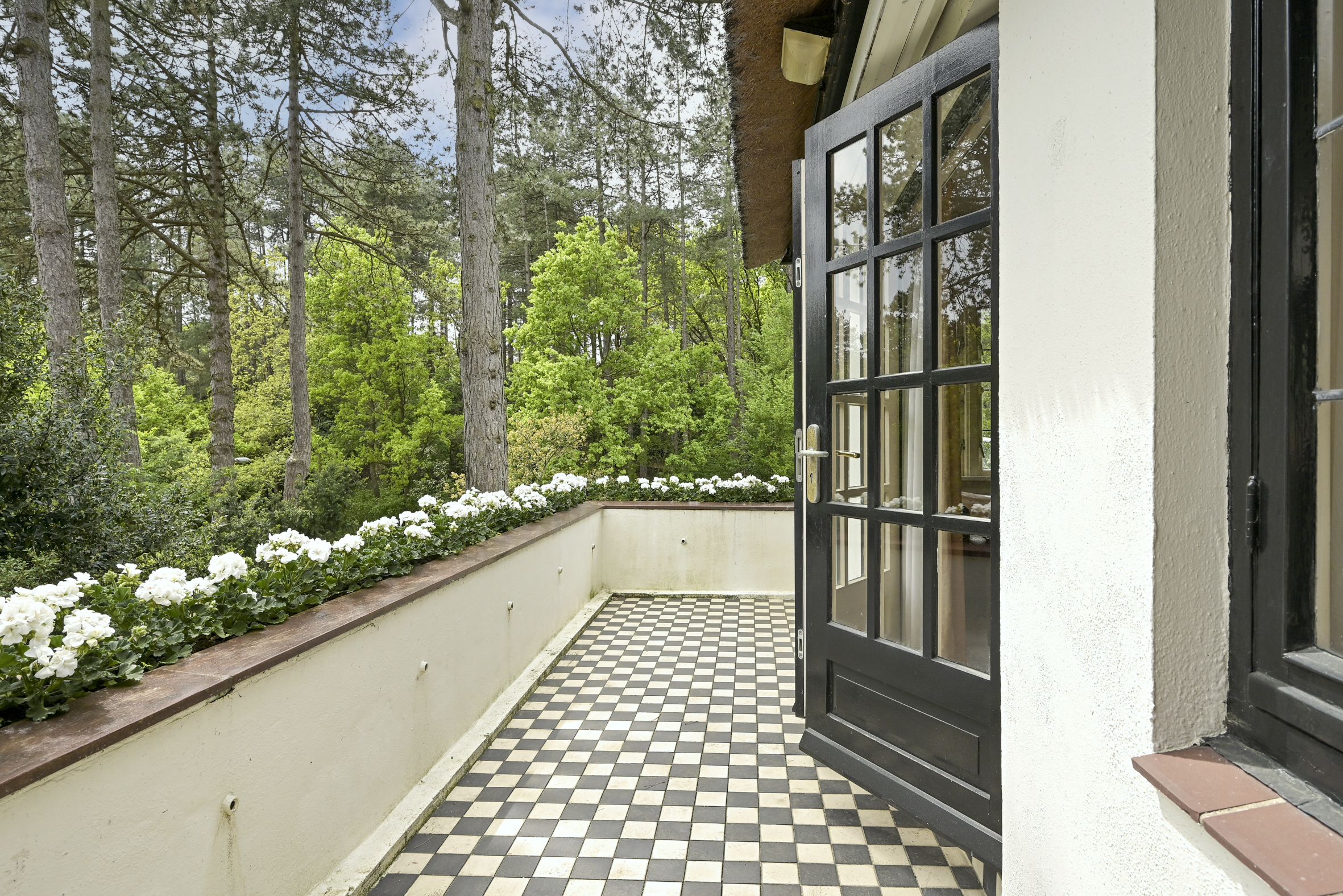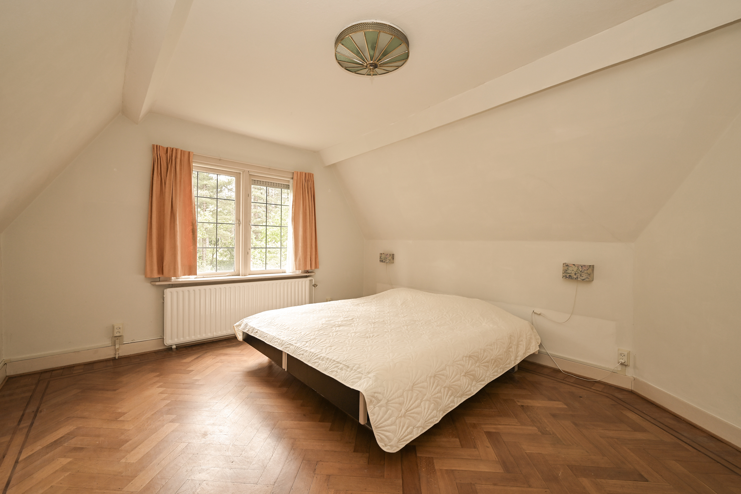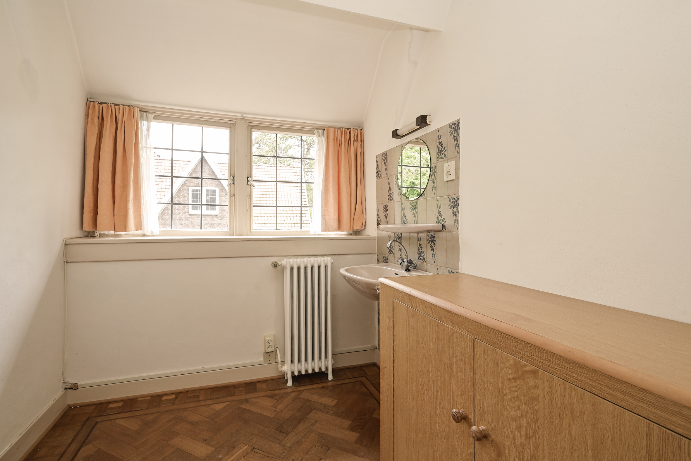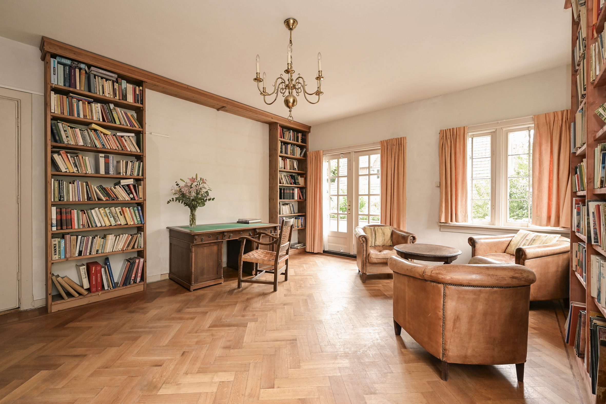 The attractive, light-filled stairwell with a landing that opens onto a balcony leads to the first floor, where you’ll find a simple bathroom, a separate shower, a beautiful study with access to a large balcony, and two spacious bedrooms. As mentioned, all rooms feature oak parquet flooring.