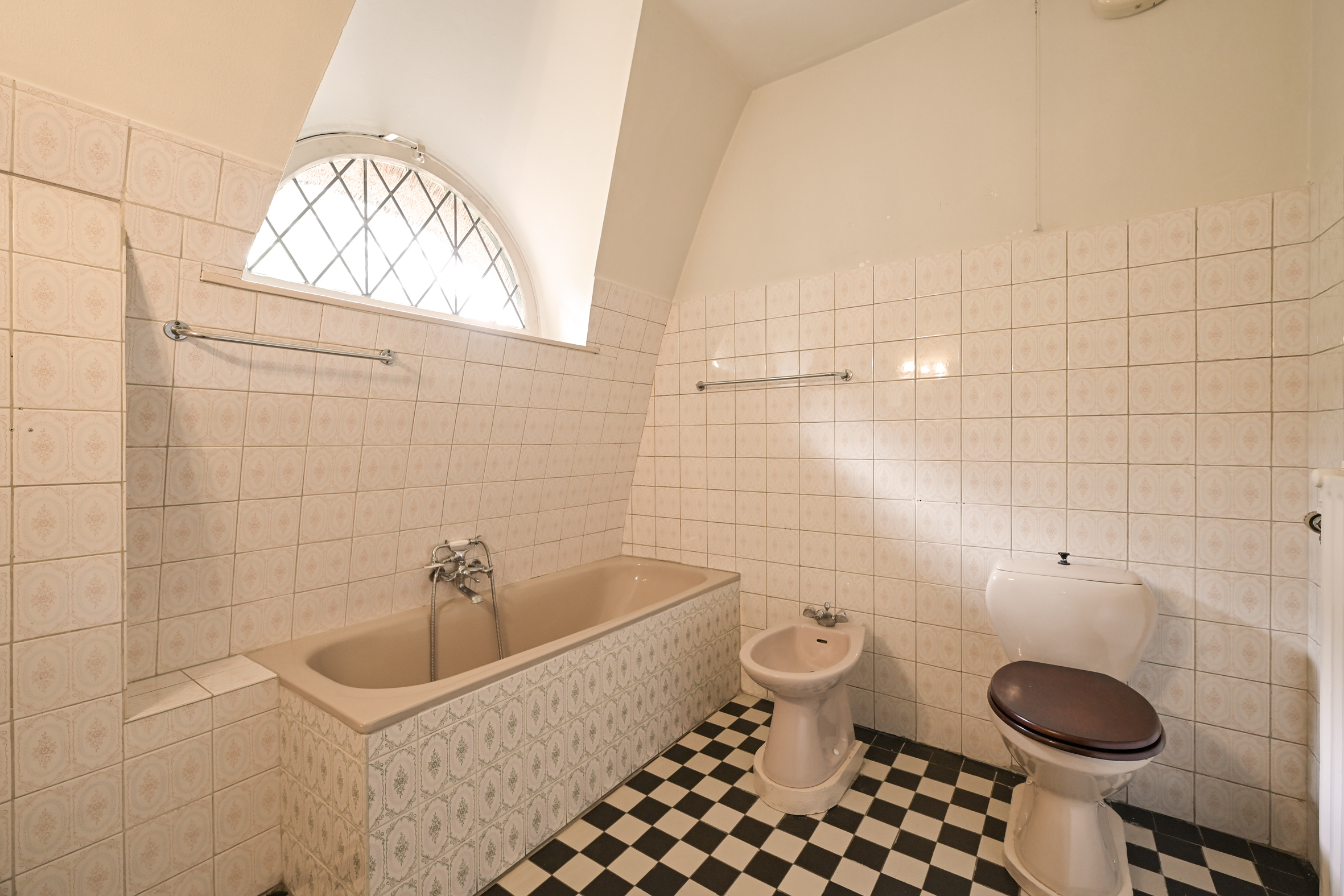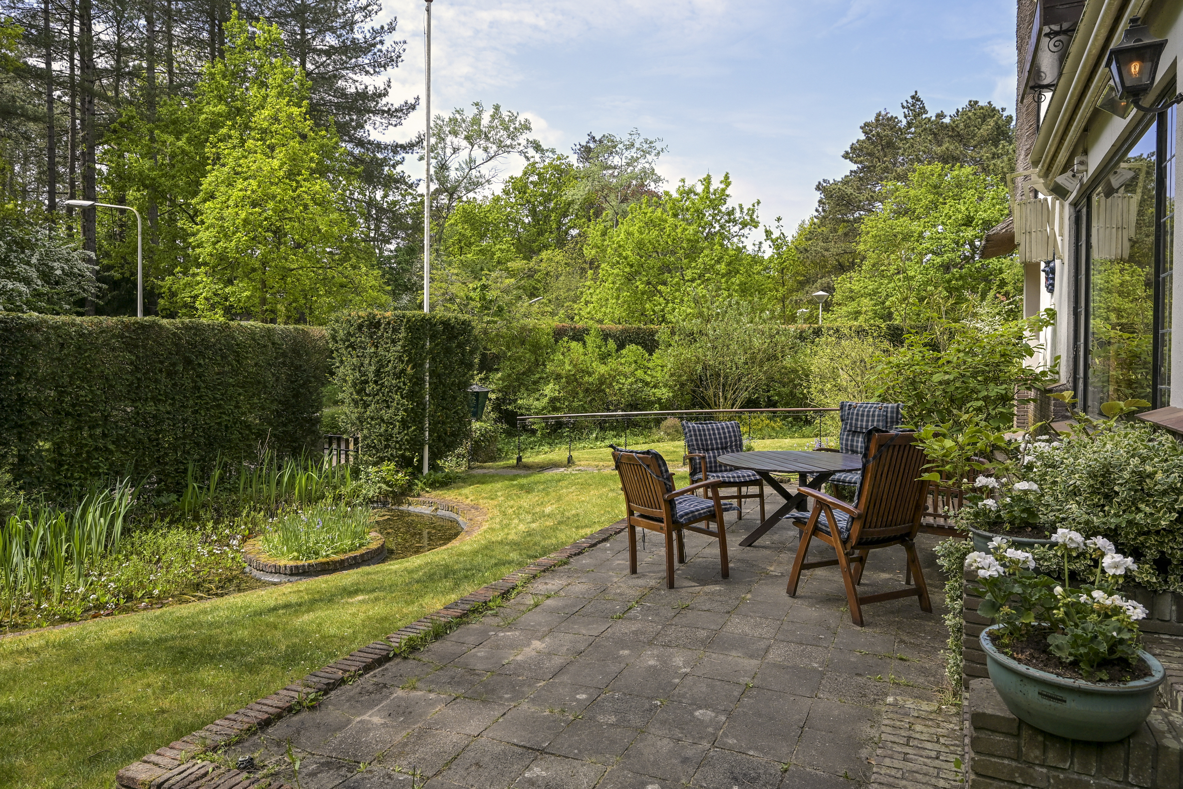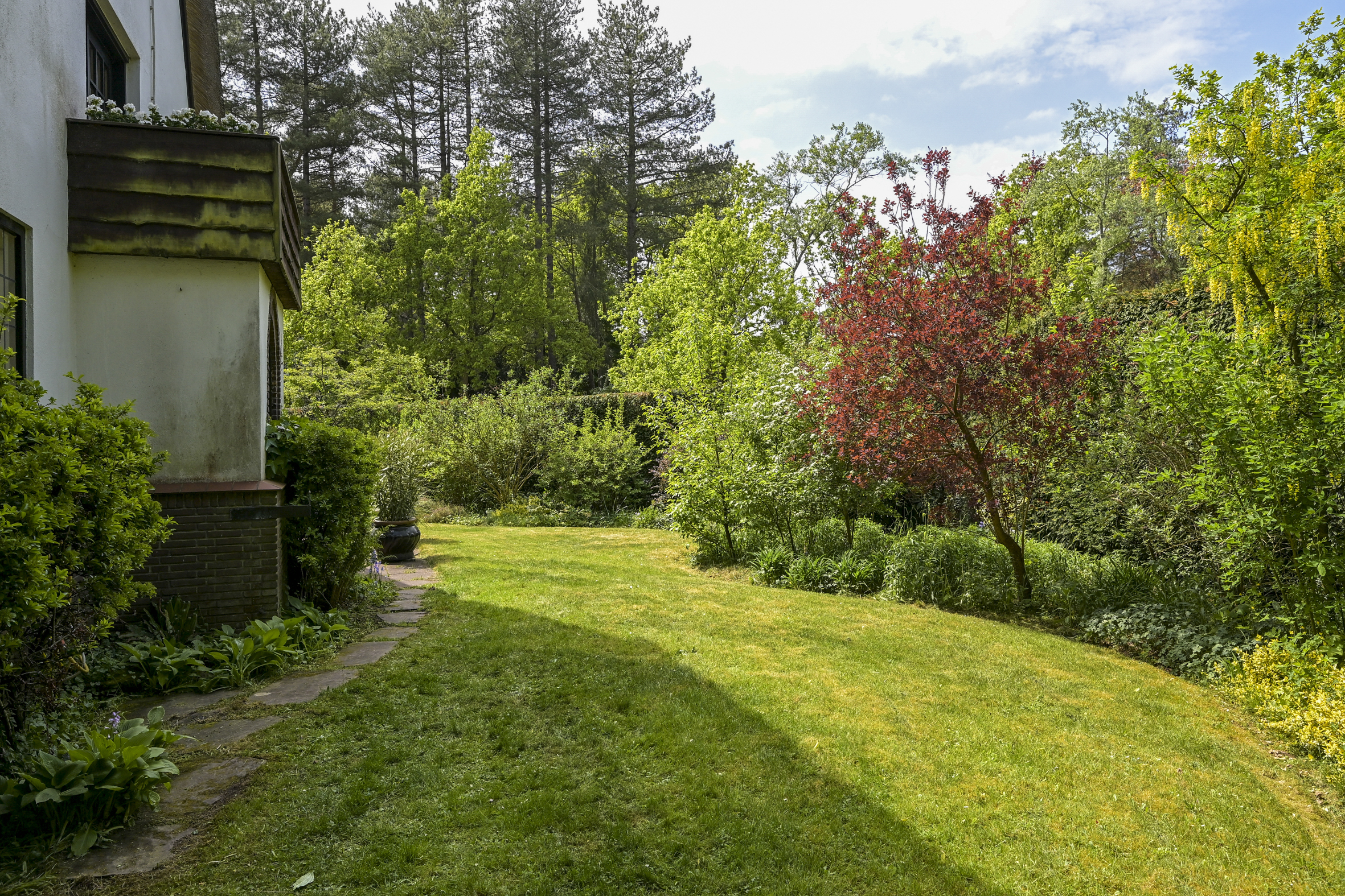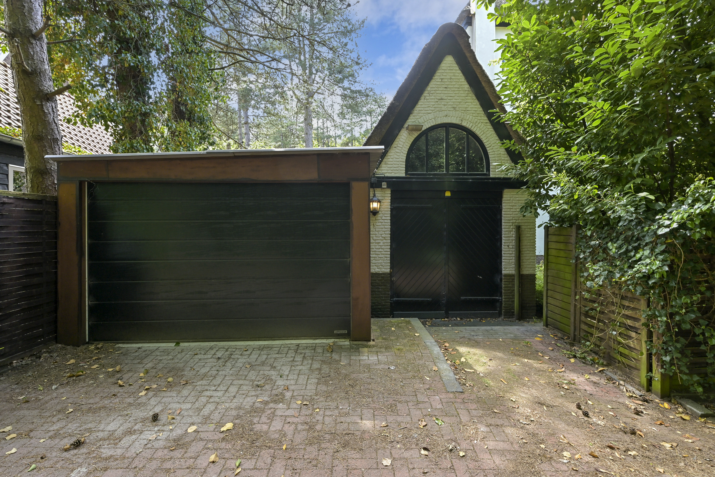The garden wraps halfway around the house and is very sunny due to its free and open setting. In addition to the original garage, which was once connected to the dining room and could easily be reintegrated into the house, a newer, large garage has been added to the plot. This garage is suitable for many purposes, has an automatic overhead door, and provides passage to the back garden.