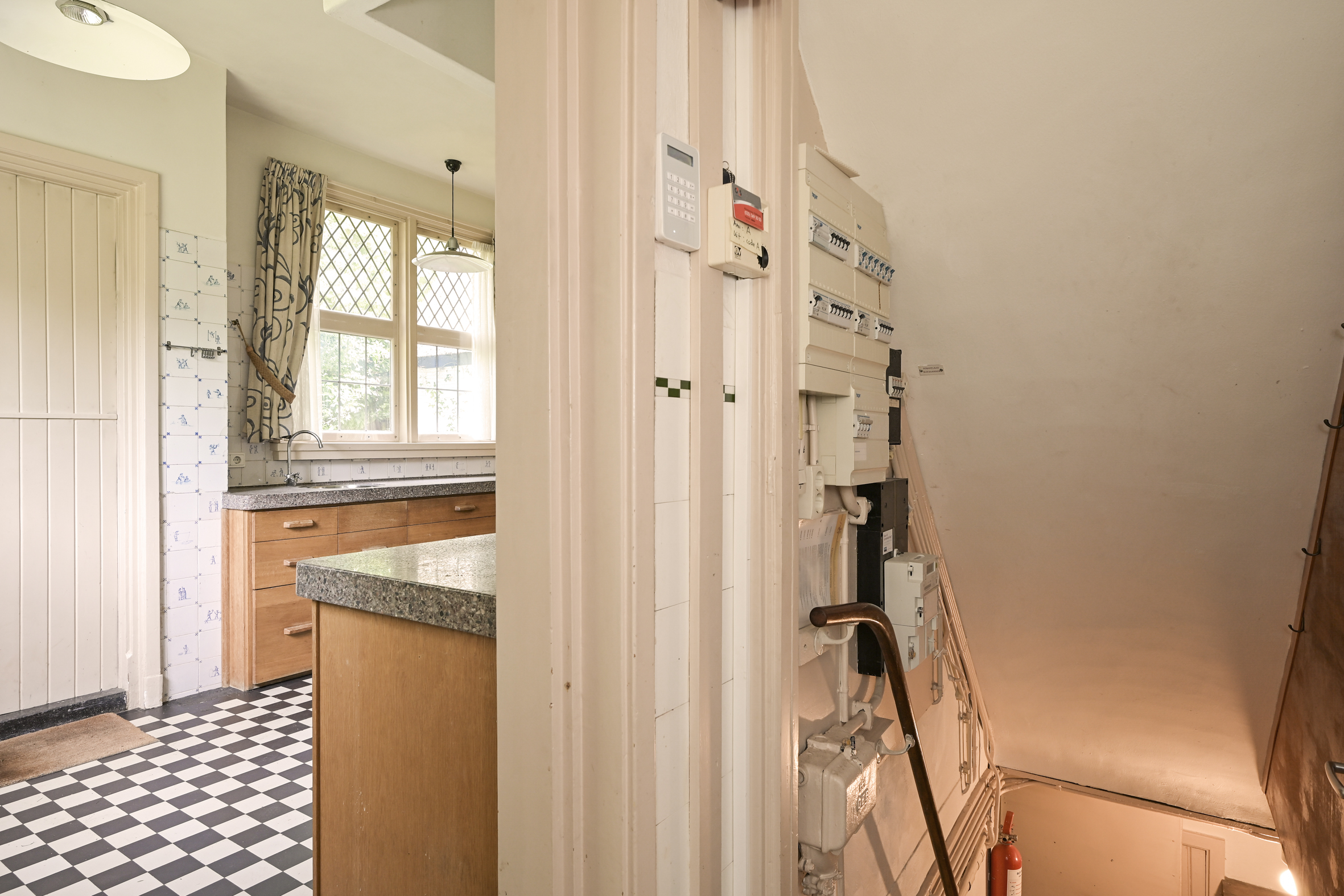 From the central hallway, you enter the large, well-maintained kitchen, which has a semi-open layout connecting it with the dining room. The kitchen also has a back entrance and an adjoining utility room that provides access to the cellar, which consists of three practical rooms.